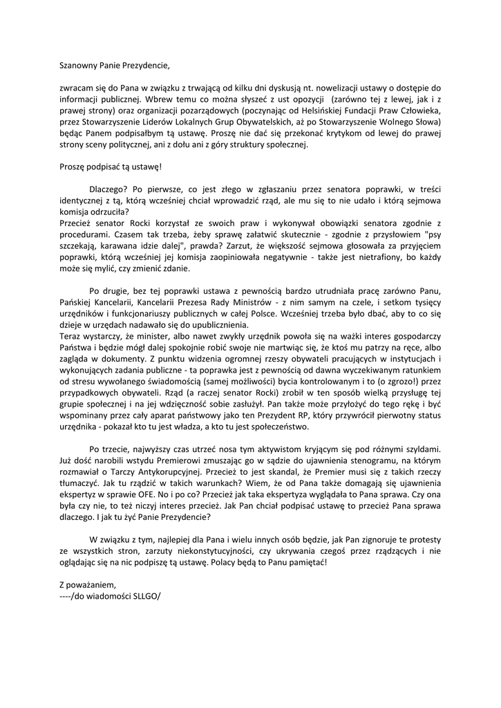 Szanowny Panie Prezydencie, zwracam się do Pana w związku z trwającą od kilku dni dyskusją nt. nowelizacji ustawy o dostępie do informacji publicznej. Wbrew temu co można słyszed z ust opozycji (zarówno tej z lewej, jak i z prawej strony) oraz organizacji pozarządowych (poczynając od Helsioskiej Fundacji Praw Człowieka, przez Stowarzyszenie Liderów Lokalnych Grup Obywatelskich, aż po Stowarzyszenie Wolnego Słowa) będąc Panem podpisałbym tą ustawę. Proszę nie dad się przekonad krytykom od lewej do prawej strony sceny politycznej, ani z dołu ani z góry struktury społecznej. Proszę podpisad tą ustawę! Dlaczego? Po pierwsze, co jest złego w zgłaszaniu przez senatora poprawki, w treści identycznej z tą, którą wcześniej chciał wprowadzid rząd, ale mu się to nie udało i którą sejmowa komisja odrzuciła? Przecież senator Rocki korzystał ze swoich praw i wykonywał obowiązki senatora zgodnie z procedurami. Czasem tak trzeba, żeby sprawę załatwid skutecznie - zgodnie z przysłowiem "psy szczekają, karawana idzie dalej", prawda? Zarzut, że większośd sejmowa głosowała za przyjęciem poprawki, którą wcześniej jej komisja zaopiniowała negatywnie - także jest nietrafiony, bo każdy może się mylid, czy zmienid zdanie. Po drugie, bez tej poprawki ustawa z pewnością bardzo utrudniała pracę zarówno Panu, Paoskiej Kancelarii, Kancelarii Prezesa Rady Ministrów - z nim samym na czele, i setkom tysięcy urzędników i funkcjonariuszy publicznych w całej Polsce. Wcześniej trzeba było dbad, aby to co się dzieje w urzędach nadawało się do upublicznienia. Teraz wystarczy, że minister, albo nawet zwykły urzędnik powoła się na ważki interes gospodarczy Paostwa i będzie mógł dalej spokojnie robid swoje nie martwiąc się, że ktoś mu patrzy na ręce, albo zagląda w dokumenty. Z punktu widzenia ogromnej rzeszy obywateli pracujących w instytucjach i wykonujących zadania publiczne - ta poprawka jest z pewnością od dawna wyczekiwanym ratunkiem od stresu wywołanego świadomością (samej możliwości) bycia kontrolowanym i to (o zgrozo!) przez przypadkowych obywateli. Rząd (a raczej senator Rocki) zrobił w ten sposób wielką przysługę tej grupie społecznej i na jej wdzięcznośd sobie zasłużył. Pan także może przyłożyd do tego rękę i byd wspominany przez cały aparat paostwowy jako ten Prezydent RP, który przywrócił pierwotny status urzędnika - pokazał kto tu jest władza, a kto tu jest społeczeostwo. Po trzecie, najwyższy czas utrzed nosa tym aktywistom kryjącym się pod różnymi szyldami. Już dośd narobili wstydu Premierowi zmuszając go w sądzie do ujawnienia stenogramu, na którym rozmawiał o Tarczy Antykorupcyjnej. Przecież to jest skandal, że Premier musi się z takich rzeczy tłumaczyd. Jak tu rządzid w takich warunkach? Wiem, że od Pana także domagają się ujawnienia ekspertyz w sprawie OFE. No i po co? Przecież jak taka ekspertyza wyglądała to Pana sprawa. Czy ona była czy nie, to też niczyj interes przecież. Jak Pan chciał podpisad ustawę to przecież Pana sprawa dlaczego. I jak tu żyd Panie Prezydencie? W związku z tym, najlepiej dla Pana i wielu innych osób będzie, jak Pan zignoruje te protesty ze wszystkich stron, zarzuty niekonstytucyjności, czy ukrywania czegoś przez rządzących i nie oglądając się na nic podpiszę tą ustawę. Polacy będą to Panu pamiętad! Z poważaniem, ----/do wiadomości SLLGO/