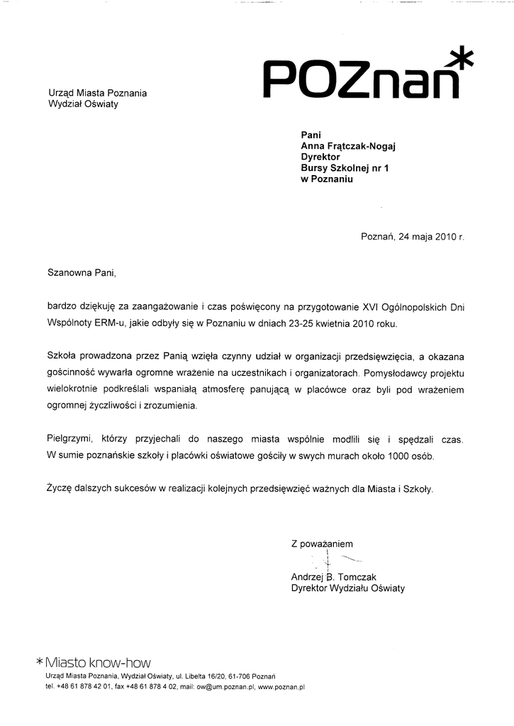 j( UrzqdMiastaPoznania WydzialOSwiaty POZnan Pani Anna Frqtczak-Nogaj Dyrektor BursySzkolnejnr 1 w Poznaniu Poznan.24 maia 2010 r SzanownaPani, bardzodzigkujqza zaangazowaniei czas poSwigconyna Wzygotowanie XVI OgolnopolskichDnr WspolnotyERM-u,jakieodbylysiq w Poznaniuw dniach23-25kwietnia2010 roku. Szkola prowadzonaprzez Paniq wzigla czynny udzialw organizacjipzedsiqwziqcia,a okazana go6cinnoSc wywarlaogromnewrazeniena uczestnikach projektu i organizatorach. Pomyslodawcy wielokrotniepodkreSlaliwspanialqatmosferqpanujqcqw placowceoraz byli pod wrazeniem ogromnejzyczliwosci i zrozumienia. Pielgrzymi,ktorzy przyjechalido naszego miasta wspolnie modlili siQ i spqdzali czas. W sumiepoznaiskieszkolyi placowkio6wiatowego6cityw swychmurachokolo 1000osob. Zyczqdalszychsukcesoww realizacji kolejnychprzedsiqwziqc waznychdla Miastai Szkoly. Z powaZaniem - I .ti AndrzejB. Tomczak Dyrektor WydzialuOSwiaty x N/iastoknow-how UrzqdMiastaPoznania,WydzialO6wiaty,ul. Libelta16120,61-706 Poznan t e l .+ 4 8 6 1 8 7 8 4 2 0 1 , f a x + 4 86 1 8 7 8 4 0 2 , m a i l :o w @ u m . p o z n a n .wpw l,w.poznan.pl