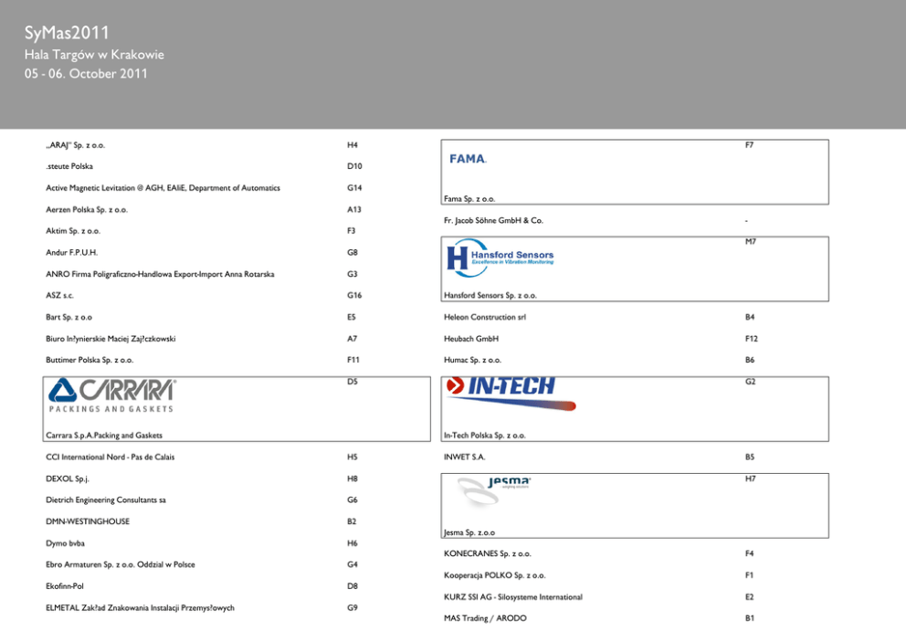 SyMas2011 Hala Targów w Krakowie 05 - 06. October 2011 ,,ARAJ" Sp. z o.o. H4 F7 .steute Polska D10 Active Magnetic Levitation @ AGH, EAIiE, Department of Automatics G14 Aerzen Polska Sp. z o.o. A13 Aktim Sp. z o.o. F3 Andur F.P.U.H. G8 ANRO Firma Poligraficzno-Handlowa Export-Import Anna Rotarska G3 ASZ s.c. G16 Hansford Sensors Sp. z o.o. Bart Sp. z o.o E5 Heleon Construction srl B4 Biuro In?ynierskie Maciej Zaj?czkowski A7 Heubach GmbH F12 Buttimer Polska Sp. z o.o. F11 Humac Sp. z o.o. B6 Fama Sp. z o.o. Fr. Jacob Söhne GmbH & Co. M7 D5 Carrara S.p.A.Packing and Gaskets G2 In-Tech Polska Sp. z o.o. CCI International Nord - Pas de Calais H5 DEXOL Sp.j. H8 Dietrich Engineering Consultants sa G6 DMN-WESTINGHOUSE B2 Dymo bvba H6 Ebro Armaturen Sp. z o.o. Oddzial w Polsce G4 Ekofinn-Pol D8 ELMETAL Zak?ad Znakowania Instalacji Przemys?owych G9 INWET S.A. B5 H7 Jesma Sp. z.o.o KONECRANES Sp. z o.o. F4 Kooperacja POLKO Sp. z o.o. F1 KURZ SSI AG - Silosysteme International E2 MAS Trading / ARODO B1 SyMas2011 Hala Targów w Krakowie 05 - 06. October 2011 Megan Sp. z o.o. H9 Rectus Polska Sp. z o.o. A8 MM Magazyn Przemyslowy G15 REMBE GmbH SAFETY + CONTROL A2 Mosa Solution s.r.o. C3 Rondo 2 Krystyna Scholz A4 Nederman Polska Sp. z o.o. G11 SABUR Sp. z o.o. F8 NetterVibration Polska Sp. z o.o. H3 SCHENCK PROCESS Polska Sp. z o.o. H2 Newtech Engineering Sp. z o.o. D7 Scutti Polska E1 D4 SILMACH Zawiercie ZPUH MACH B7 Skako Vibration A/S D6 Steel-Kamet Oy G8 TECHMONT G1 TECHNOPOMIAR Sp z o.o. E4 Tekpro Sp. z o.o. G6 Tessa Wolff i Synowie Sp. J. M8 TRM Filter / SFET -- Filtry odpylaj?ce ECO-Compact M3 UTILCELL s.r.o. D3 VST Engineering, spol. s.r.o. C1 Wagmont A5 Wakro Sp. z o.o. A6 Wam Polska Sp.z o.o D1 Wa?enie,Dozowanie,Pakowanie C7 Wydawnictwo "ELAMED" A11 ZACH METALCHEM Sp. z o.o. C2a Zaklad Mechaniki Precyzyjnej i Us?ug Technicznych s.c. M5 Nivelco-Poland Sp. z o.o. NMG Sp. z o.o. G7 NORD-LOCK Poland Sp. z o.o. G13 Norgpol Sp. z o.o. B3 Norres Polska Sp. z o.o. A9 Nowoczesna Firma S.A. G5 Nowytech Polska Sp. z o.o. H10 Oy M. Halaoila Ab C6 PHU OZB S.C. G10 Powder & Bulk M6 Process Sensors Polska Sp. z o.o. C4 Proorganika Sp. z o.o. F2 PUH Impex - Saro F9 RATAJ a.s. H1 SyMas2011 Hala Targów w Krakowie 05 - 06. October 2011 Zasuwy-Warzecha C2