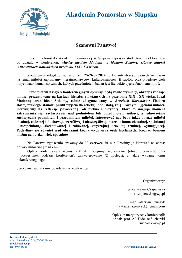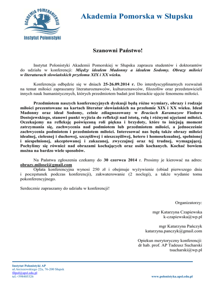 Akademia Pomorska w Słupsku Szanowni Państwo! Instytut Polonistyki Akademii Pomorskiej w Słupsku zaprasza studentów i doktorantów do udziału w konferencji: Między ideałem Madonny a ideałem Sodomy. Obrazy miłości w literaturach słowiańskich przełomu XIX i XX wieku. Konferencja odbędzie się w dniach 25-26.09.2014 r. Do interdyscyplinarnych rozważań na temat miłości zapraszamy literaturoznawców, kulturoznawców, filozofów oraz przedstawicieli innych nauk humanistycznych, których przedmiotem badań jest literackie ujęcie fenomenu miłości. Przedmiotem naszych konferencyjnych dyskusji będą różne wymiary, obrazy i rodzaje miłości prezentowane na kartach literatur słowiańskich na przełomie XIX i XX wieku. Ideał Madonny oraz ideał Sodomy, celnie zdiagnozowany w Braciach Karamazow Fiodora Dostojewskiego, stanowi punkt wyjścia do refleksji nad istotą, rolą i różnymi ujęciami miłości. Oczekujemy na refleksję poświęconą roli piękna i brzydoty, które to inicjują moment zatrzymania się, zachwycenia nad podmiotem lub przedmiotem miłości, a jednocześnie zachwycenia podmiotem i przedmiotem miłości. Interesować nas będą także obrazy miłości idealnej, cielesnej i duchowej, szczęśliwej i nieszczęśliwej, hetero i homoseksualnej, spełnionej i niespełnionej, akceptowanej i zakazanej, zwyczajnej oraz tej trudnej, wymagającej. Pochylimy się również nad obrazami kochających oraz osób kochanych. Kochać bowiem można na bardzo wiele sposobów. Na Państwa zgłoszenia czekamy do 30 czerwca 2014 r. Prosimy je kierować na adres: [email protected] Opłata konferencyjna wynosi 250 zł i obejmuje wyżywienie (obiad pierwszego dnia i poczęstunek podczas konferencji), zakwaterowanie (2 noclegi), a także wydanie tomu pokonferencyjnego. Serdecznie zapraszamy do udziału w konferencji! Organizatorzy: mgr Katarzyna Czapiewska [email protected] mgr Katarzyna Pańczyk [email protected] Opiekun merytoryczny konferencji: dr hab. prof. AP Tadeusz Sucharski [email protected] Instytut Polonistyki AP ul.Arciszewskiego 22a, 76-200 Słupsk [email protected] tel.+598405326 www.polonistyka.apsl.edu.pl