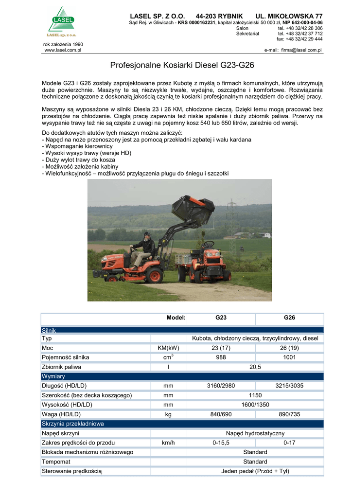 LASEL SP. Z O.O. 44-203 RYBNIK UL. MIKOŁOWSKA 77 Sąd Rej. w Gliwicach - KRS 0000163231, kapitał załoŜycielski 50 000 zł, NIP 642-000-04-06 Salon tel. +48 32/42 28 306 Sekretariat tel. +48 32/42 37 712 fax: +48 32/42 29 444 rok załoŜenia 1990 www.lasel.com.pl e-mail: [email protected] Profesjonalne Kosiarki Diesel G23-G26 Modele G23 i G26 zostały zaprojektowane przez Kubotę z myślą o firmach komunalnych, które utrzymują duŜe powierzchnie. Maszyny te są niezwykle trwałe, wydajne, oszczędne i komfortowe. Rozwiązania techniczne połączone z doskonałą jakością czynią te kosiarki profesjonalnym narzędziem do cięŜkiej pracy. Maszyny są wyposaŜone w silniki Diesla 23 i 26 KM, chłodzone cieczą. Dzięki temu mogą pracować bez przestojów na chłodzenie. Ciągłą pracę zapewnia teŜ niskie spalanie i duŜy zbiornik paliwa. Przerwy na wysypanie trawy teŜ nie są częste z uwagi na pojemny kosz 540 lub 650 litrów, zaleŜnie od wersji. Do dodatkowych atutów tych maszyn moŜna zaliczyć: - Napęd na noŜe przenoszony jest za pomocą przekładni zębatej i wału kardana - Wspomaganie kierownicy - Wysoki wysyp trawy (wersje HD) - DuŜy wylot trawy do kosza - MoŜliwość załoŜenia kabiny - Wielofunkcyjność – moŜliwość przyłączenia pługu do śniegu i szczotki Model: Silnik Typ Moc Pojemność silnika Zbiornik paliwa G23 G26 Kubota, chłodzony cieczą, trzycylindrowy, diesel KM(kW) cm 3 23 (17) 26 (19) 988 1001 l 20,5 Wymiary Długość (HD/LD) mm Szerokość (bez decka koszącego) mm 1150 Wysokość (HD/LD) mm 1600/1350 Waga (HD/LD) kg 3160/2980 3215/3035 840/690 890/735 Skrzynia przekładniowa Napęd skrzyni Zakres prędkości do przodu Napęd hydrostatyczny km/h 0-15,5 0-17 Blokada mechanizmu róŜnicowego Standard Tempomat Standard Sterowanie prędkością Jeden pedał (Przód + Tył) Hamulce Wielotarczowe, mokre Układ kierowniczy Hydrostatyczny (wspomaganie) Pokład operatora Płaski Typ pojemnika na trawę Pojemność kosza na trawę (LD/HD) Maksymalna wysokość wysypu Niski lub wysoki wysyp l 560/640 m 1,93 Dane techniczne kosiarki Szerokość koszenia cm Liczba noŜy Ilość pozycji wysokości 137 2 Przekaz mocy Wysokość koszenia 122 Przekładnia kątowa mm 25-102 tarcza, 13 pozycji LD - Low Dump - Niski wysyp trawy HD - High Dump - Wysoki wysyp trawy Dostępne opcje: Kabina, Szczotka uniwersalna, Szczotka boczna, pług do śniegu.