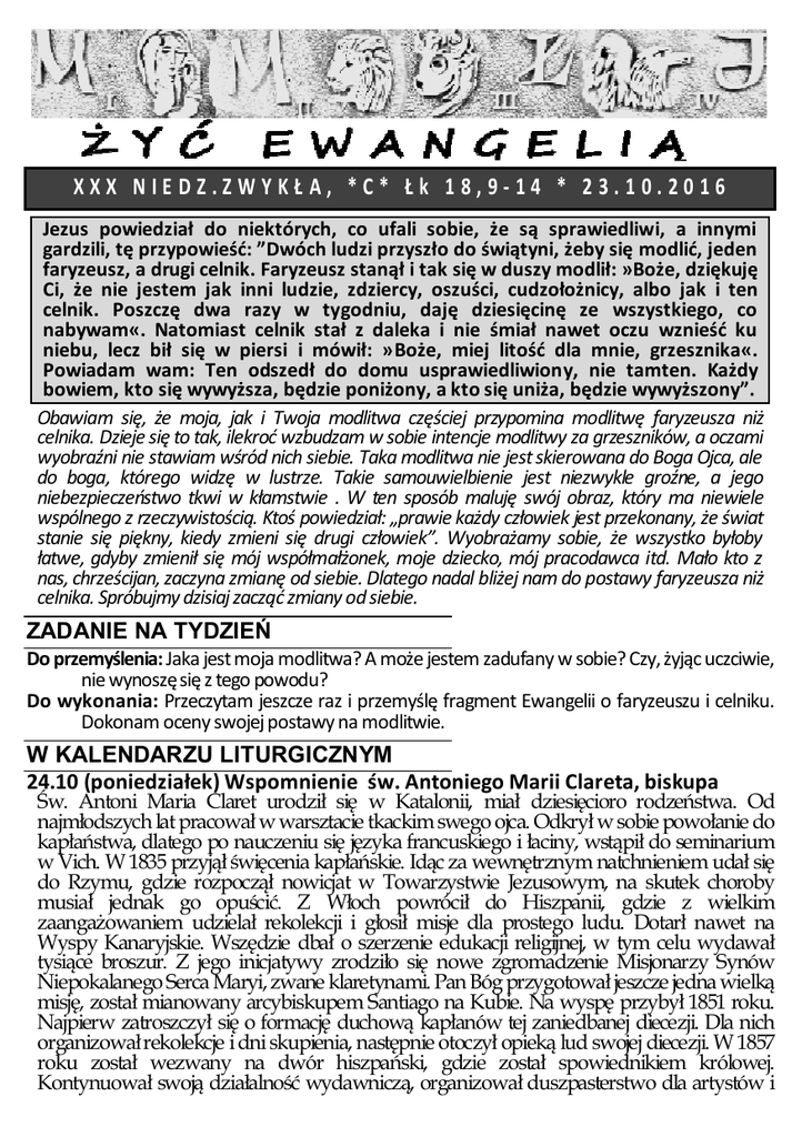 XXX NIEDZ.ZWYKŁA, *C* Łk 18,9-14 * 23.10.2016 Jezus powiedział do niektórych, co ufali sobie, że są sprawiedliwi, a innymi gardzili, tę przypowieść: ”Dwóch ludzi przyszło do świątyni, żeby się modlić, jeden faryzeusz, a drugi celnik. Faryzeusz stanął i tak się w duszy modlił: »Boże, dziękuję Ci, że nie jestem jak inni ludzie, zdziercy, oszuści, cudzołożnicy, albo jak i ten celnik. Poszczę dwa razy w tygodniu, daję dziesięcinę ze wszystkiego, co nabywam«. Natomiast celnik stał z daleka i nie śmiał nawet oczu wznieść ku niebu, lecz bił się w piersi i mówił: »Boże, miej litość dla mnie, grzesznika«. Powiadam wam: Ten odszedł do domu usprawiedliwiony, nie tamten. Każdy bowiem, kto się wywyższa, będzie poniżony, a kto się uniża, będzie wywyższony”. Obawiam się, że moja, jak i Twoja modlitwa częściej przypomina modlitwę faryzeusza niż celnika. Dzieje się to tak, ilekroć wzbudzam w sobie intencje modlitwy za grzeszników, a oczami wyobraźni nie stawiam wśród nich siebie. Taka modlitwa nie jest skierowana do Boga Ojca, ale do boga, którego widzę w lustrze. Takie samouwielbienie jest niezwykle groźne, a jego niebezpieczeństwo tkwi w kłamstwie . W ten sposób maluję swój obraz, który ma niewiele wspólnego z rzeczywistością. Ktoś powiedział: „prawie każdy człowiek jest przekonany, że świat stanie się piękny, kiedy zmieni się drugi człowiek”. Wyobrażamy sobie, że wszystko byłoby łatwe, gdyby zmienił się mój współmałżonek, moje dziecko, mój pracodawca itd. Mało kto z nas, chrześcijan, zaczyna zmianę od siebie. Dlatego nadal bliżej nam do postawy faryzeusza niż celnika. Spróbujmy dzisiaj zacząć zmiany od siebie. ZADANIE NA TYDZIEŃ Do przemyślenia: Jaka jest moja modlitwa? A może jestem zadufany w sobie? Czy, żyjąc uczciwie, nie wynoszę się z tego powodu? Do wykonania: Przeczytam jeszcze raz i przemyślę fragment Ewangelii o faryzeuszu i celniku. Dokonam oceny swojej postawy na modlitwie. W KALENDARZU LITURGICZNYM 24.10 (poniedziałek) Wspomnienie św. Antoniego Marii Clareta, biskupa Św. Antoni Maria Claret urodził się w Katalonii, miał dziesięcioro rodzeństwa. Od najmłodszych lat pracował w warsztacie tkackim swego ojca. Odkrył w sobie powołanie do kapłaństwa, dlatego po nauczeniu się języka francuskiego i łaciny, wstąpił do seminarium w Vich. W 1835 przyjął święcenia kapłańskie. Idąc za wewnętrznym natchnieniem udał się do Rzymu, gdzie rozpoczął nowicjat w Towarzystwie Jezusowym, na skutek choroby musiał jednak go opuścić. Z Włoch powrócił do Hiszpanii, gdzie z wielkim zaangaŜowaniem udzielał rekolekcji i głosił misje dla prostego ludu. Dotarł nawet na Wyspy Kanaryjskie. Wszędzie dbał o szerzenie edukacji religijnej, w tym celu wydawał tysiące broszur. Z jego inicjatywy zrodziło się nowe zgromadzenie Misjonarzy Synów Niepokalanego Serca Maryi, zwane klaretynami. Pan Bóg przygotował jeszcze jedna wielką misję, został mianowany arcybiskupem Santiago na Kubie. Na wyspę przybył 1851 roku. Najpierw zatroszczył się o formację duchową kapłanów tej zaniedbanej diecezji. Dla nich organizował rekolekcje i dni skupienia, następnie otoczył opieką lud swojej diecezji. W 1857 roku został wezwany na dwór hiszpański, gdzie został spowiednikiem królowej. Kontynuował swoją działalność wydawniczą, organizował duszpasterstwo dla artystów i pisarzy. Towarzyszył rodzinie królewskiej na wygnaniu we Francji, gdy w Hiszpanii wybuchła rewolucja. Przebywał później w Rzymie, gdzie bronił nieomylności papieŜa w sprawach wiary i moralności. Zmarł jako wygnaniec we Francji w 1870 roku. 26.10 (środa) Wspomnienie bł. Celiny Borzęckiej, zakonnicy Urodziła się 29 października 1833 r. w Antowilu koło Orszy na terenie dzisiejszej Białorusi w zamoŜnej rodzinie ziemiańskiej Chludzińskich. W domu rodzinnym otrzymała staranne wykształcenie i wychowanie. Jako młoda dziewczyna zapragnęła wstąpić do klasztoru wizytek w Wilnie, ale posłuszna woli rodziców i radzie spowiednika w 1853 r. wyszła za mąŜ za Józefa Borzęckiego. Było to szczęśliwe małŜeństwo. Celina była oddaną Ŝoną i matką. Urodziła czworo dzieci, z których dwoje – Marynia i Kazimierz - zmarło w niemowlęctwie. Przy Ŝyciu pozostały dwie córki – Celina i Jadwiga. Ich matka prowadziła pracę charytatywną wśród ludności wiejskiej, a w 1863 r. wspierała powstańców, za co znalazła się nawet w rosyjskim więzieniu w Grodnie wraz z kilkutygodniową Jadwigą. Po śmierci męŜa Celina wraz z córkami zamieszkała w Rzymie. Tam powróciła do niej myśl o Ŝyciu zakonnym. Poznała generała zmartwychwstańców, ks. Piotra Semenenkę. Pod jego wpływem postanowiła wraz z córką Jadwigą załoŜyć Ŝeńską gałąź tego zgromadzenia. Nie było to łatwe – obie musiały znieść wiele przeciwności i upokorzeń zanim ostatecznie 6 stycznia 1891 r. zmartwychwstanki zostały zatwierdzone jako zgromadzenie kontemplacyjno-czynne, którego zadaniem było nauczanie i chrześcijańskie wychowanie dziewcząt. Zmarła w Krakowie 26 października 1913 r. Pochowana została w Kętach, obok Jadwigi. Beatyfikowana została w Rzymie w 2007 r. 28.10 (piątek) Święto św. Apostołów Szymona i Judy Tadeusza Ewangelie wymieniają św. Szymona w ścisłym gronie uczniów Pana Jezusa. Jest on chyba najmniej znanym spośród nich. Ewangelie wspominają o nim tylko trzy razy. Mateusz i Marek dają mu przydomek Kananejczyk Dlatego niektórzy Ojcowie Kościoła przypuszczali, Ŝe pochodził on z Kany Galilejskiej i był panem młodym, na którego weselu Chrystus Pan uczynił pierwszy cud. Współczesna egzegeza dopatruje się jednak w słowie Kananejczyk raczej znaczenia "gorliwy", gdyŜ tak je równieŜ moŜna tłumaczyć. Łukasz wprost daje Szymonowi przydomek Zelotes, czyli gorliwy Specjalne podkreślenie w gronie Apostołów, Ŝe Szymon by