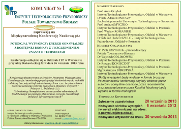 KOMUNIKAT Nr 1 LSK IE PO TOW A R ZY ST WO B IOM A SY INSTYTUT TECHNOLOGICZNO-PRZYRODNICZY POLSKIE TOWARZYSTWO BIOMASY zapraszaj¹ na Miêdzynarodow¹ Konferencjê Naukow¹ pt.: POTENCJA£ WYTWÓRCZY ENERGII ODNAWIALNEJ Z DOSTÊPNEJ BIOMASY Z UWZGLÊDNIENIEM ZNANYCH TECHNOLOGII Konferencja odbêdzie siê w Oddziale ITP w Warszawie przy ulicy Rakowieckiej 32 w dniu 26 wrzeœnia 2013 roku Konferencja finansowana ze œrodków Programu Wieloletniego: “Standaryzacja i monitoring przedsiêwziêæ œrodowiskowych, techniki rolniczej i rozwi¹zañ infrastrukturalnych na rzecz bezpieczeñstwa i zrównowa¿onego rozwoju rolnictwa i obszarów wiejskich” Priorytet 3. Dzia³anie 3.1.: “Monitoring i kompleksowa ocena zasobu odnawialnych Ÿróde³ energii na potrzeby planowania, rozwoju i lokalizacji instalacji agroenergetycznych” ADRES ORGANIZATORA Instytut Technologiczno-Przyrodniczy w Falentach, Oddzia³y w Poznaniu i Warszawie Polskie Towarzystwo Biomasy POLBIOM KONTAKT Piotr Pasyniuk tel. 22/542 1180 e-mail: [email protected] strony internetowe: www.itep.edu.pl; www.polbiom.pl KOMITET NAUKOWY Prof. Anna Grzybek Instytut Technologiczno-Przyrodniczy, Oddzia³ w Warszawie. Dr hab. Adam KONIUSZY Zachodniopomorski Uniwersytet Technologiczny w Szczecinie Prof. Andrzej MYCZKO Instytut Technologiczno-Przyrodniczy, Oddzia³ w Poznaniu Prof. Wac³aw ROMANIUK Instytut Technologiczno-Przyrodniczy, Oddzia³ w Warszawie Dr hab. in¿ Robert SZULC - Instytut TechnologicznoPrzyrodniczy, Oddzia³ w Poznaniu KOMITET ORGANIZACYJNY Dr Piotr PASYNIUK - przewodnicz¹cy Polskie Towarzystwo Biomasy Dr Wojciech GOLIMOWSKI Instytut Technologiczno-Przyrodniczy, Oddzia³ w Poznaniu Dr Ryszard KONIECZNY Instytut Technologiczno-Przyrodniczy, Oddzia³ w Poznaniu Mgr Katarzyna BISKUPSKA Instytut Technologiczno-Przyrodniczy, Oddzia³ w Warszawie Skróty wyst¹pieñ bêd¹ wydane w formie broszury. Po zakoñczeniu konferencji artyku³y z³o¿one przez autorów i pomyœlnie ocenione przez recenzentów oraz zaakceptowane przez Komitet Naukowy bêd¹ wydane w formie monografii. TERMINARZ KONFERENCJI 20 wrzeœnia 2013 Zg³oszenie uczestnictwa Nadsy³anie skrótów wyst¹pieñ 6 wrzeœnia 2013 (w wersji elektronicznej na adres: [email protected]) Nadsy³anie artyku³ów do druku 30 wrzeœnia 2013