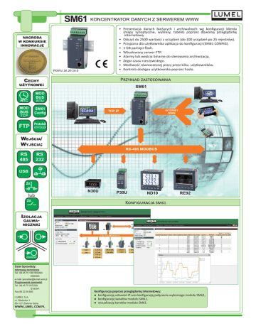 • Prezentacja danych bieżących i archiwalnych wg konfiguracji klienta (mapy synoptyczne, wykresy, tabele) poprzez dowolną przeglądarkę internetową. • Odczyt do 2500 wartości z urządzeń (do 100 urządzeń po 25 rejestrów). • Przyjazna dla użytkownika aplikacja do konfiguracji (SM61 CONFIG). • 1 GB pamięci flash. • Wbudowany serwer FTP. • Alarmy lub wejścia binarne do sterowania archiwizacją. • Zegar czasu rzeczywistego. • Możliwość równoczesnej pracy przez kilku użytkowników. • Kontrola dostępu użytkownika poprzez hasło. NaGRoDa W kONkURSIe INNoWacJE PKWiU 26.20.16.0 Przykład zastosowania cEcHY UżYtkOWe: SM61 RTC ETH TCP IP SCADA RS 485 ETH WeJŚCIa/ WYJŚCIa: INTERNET WWW RS-485 MODBUS RS 232 USB lub N30U P30U ND10 RE92 Konfiguracja sm61 IZoLacJa GaLWaNIcZNa: Zasilanie Dział Sprzedaży: Informacja techniczna Tel: 684575106/180/260/ /306/353 e-mail:[email protected] Przyjmowanie zamówień Tel: 684575207/209 /218/341 Fax:683255650 LUMELS.A. ul. Słubicka 1 65-127ZielonaGóra WWW.LUMEL.COM.PL Konfiguracja poprzez przeglądarkę internetową: konfigurację ustawień IP oraz konfigurację połączenia wybranego modułu SM61, konfigurację kanałów modułu SM61, wizualizację kanałów modułu SM61. Interfejs komunikacyjny Interfejs Funkcja Port 1:RS-485, RS-232, Komunikacja z komputerami PC i panelami HMI Prędkość transmisji Jednostka informacyjna Port 2: RS-485 Komunikacja z urządzeniami typu Slave Konfiguracja urządzenia Ethernet 10/100Base-T Komunikacja i konfiguracja urządzenia 1200, 2400, 4800, 9600, 19200, 38400, 57600, 115200 bit/s 115200 bit/s 10, 100 Mbit/s 1 bit startu, 7 lub 8 bitów danych, 1 bit nieparzystości/parzystości, 1 lub 2 bity stopu 1 bit startu, 8 bitów danych, 1 bit parzystości, 1 bit stopu TCP/UDP Protokół transmisji TCP/IP, HTTP, ICMP, DHCP, ARP, Modbus TCP MODBUS RTU max. długość przewodu zależna od prędkości transmisji Uwagi USB max. długość przewodu: do 2 m max. długość przewodu: do 100 m Cechy zewnętrzne Masa < 0,25 kg Wymiary gabarytowe Stopień ochrony (wg PN-EN 60529) 45 ´ 120 ´ 100 mm od strony obudowy: IP40 Mocowanie montaż na szynie 35 mm Temperatura otoczenia 20...24...40 V a.c., 20...24...60 V d.c. 10...16 V a.c. , 10...20 V d.c. 85...230...253 V a.c., 90...300 V d.c. pracy: 0...23...55˚C Wilgotność względna < 95% Pozycja pracy dowolna Zewnętrzne pole magnetyczne < 400 A/m Moduły I/O serii SM SM1, SM2, SM3, SM4, SM5. od strony zacisków: IP20 Panele operatorskie serii HMI. Znamionowe warunki użytkowania Napięcie zasilania Zobacz także: pobór mocy: < 4 VA 40...50/60...440 Hz przechowywania: -20...70˚C niedopuszczalna kondensacja Wymagania bezpieczeństwa i kompatybilności Kompatybilność elektromagnetyczna odporność na zakłócenia wg PN-EN 61000-6-2 emisja zakłóceń wg PN-EN 61000-6-4 kategoria instalacji III Wymagania bezpieczeństwa stopień zanieczyszczenia 2 dla obwodu zasilania: 300 V Maksymalne napięcie pracy względem ziemi Systemy SCADA Lumel-Proces wg PN-EN 61010-1 dla pozostałych obwodów: 50 V Schematy podłączeń ZASILANIE ZALEŻNE OD KODU WYKONANIA (85...253 V a.c., 90...300 V d.c. lub 20...40 V a.c., 20...60 V d.c. lub 10...16 V a.c., 10...20 V d.c.) Port 1 LAN Zamawianie Napięcie zasilania: 85...253 V a.c., 90...300 V d.c. 20...40 V a.c., 20...60 V d.c. 10...16 V a.c., 10...20 V d.c. Wejście/wyjście: 2 wyjścia przekaźnikowe 2 wejścia binarne Wykonanie: standardowe specjalne* Wersja językowa: polska angielska inna* Próby odbiorcze: bez dodatkowych wymagań z atestami Kontroli Jakości wg uzgodnień z odbiorcą* SM61 - X X XX X X 1 2 3 1 2 00 XX P E X Dział Sprzedaży: 0 1 X * - tylko po uzgodnieniu z producentem Przykład kodowania: Port 2 Produkt nagrodzodzony w konkursie INNOWACJE 2012 Kod SM61 - 1 2 00 P 1 oznacza wykonanie urządzenia z zasilaniem 85...253 V a.c., 90...300 V d.c., z 2 wejściami binarnymi, wykonanie standardowe, polska wersja językowa, z atestem Kontroli Jakości. Informacja techniczna Tel: 68 45 75 106/180/260/ /306/353 e-mail: [email protected] Przyjmowanie zamówień Tel: 68 45 75 207/209 /218/341 Fax:68 32 55 650 LUMEL S.A. ul. Słubicka 1 65-127 Zielona Góra WWW.LUMEL.COM.PL SM61-19