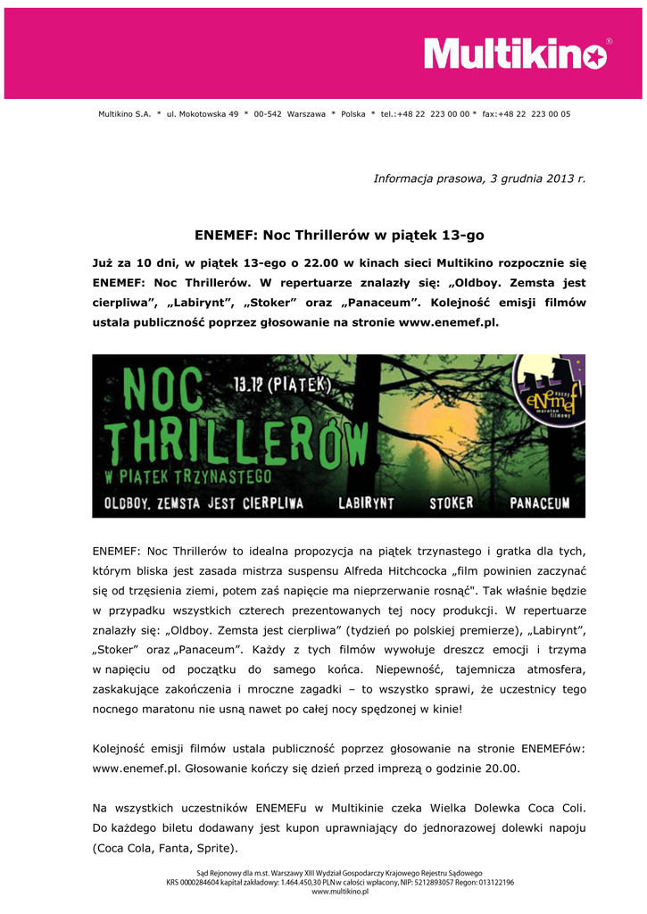 Multikino S.A. * ul. Mokotowska 49 * 00-542 Warszawa * Polska * tel.:+48 22 223 00 00 * fax:+48 22 223 00 05 Informacja prasowa, 3 grudnia 2013 r. ENEMEF: Noc Thrillerów w piątek 13-go Już za 10 dni, w piątek 13-ego o 22.00 w kinach sieci Multikino rozpocznie się ENEMEF: Noc Thrillerów. W repertuarze znalazły się: „Oldboy. Zemsta jest cierpliwa”, „Labirynt”, „Stoker” oraz „Panaceum”. Kolejność emisji filmów ustala publiczność poprzez głosowanie na stronie www.enemef.pl. ENEMEF: Noc Thrillerów to idealna propozycja na piątek trzynastego i gratka dla tych, którym bliska jest zasada mistrza suspensu Alfreda Hitchcocka „film powinien zaczynać się od trzęsienia ziemi, potem zaś napięcie ma nieprzerwanie rosnąć". Tak właśnie będzie w przypadku wszystkich czterech prezentowanych tej nocy produkcji. W repertuarze znalazły się: „Oldboy. Zemsta jest cierpliwa” (tydzień po polskiej premierze), „Labirynt”, „Stoker” oraz „Panaceum”. Każdy z tych filmów wywołuje dreszcz emocji i trzyma w napięciu od początku do samego końca. Niepewność, tajemnicza atmosfera, zaskakujące zakończenia i mroczne zagadki – to wszystko sprawi, że uczestnicy tego nocnego maratonu nie usną nawet po całej nocy spędzonej w kinie! Kolejność emisji filmów ustala publiczność poprzez głosowanie na stronie ENEMEFów: www.enemef.pl. Głosowanie kończy się dzień przed imprezą o godzinie 20.00. Na wszystkich uczestników ENEMEFu w Multikinie czeka Wielka Dolewka Coca Coli. Do każdego biletu dodawany jest kupon uprawniający do jednorazowej dolewki napoju (Coca Cola, Fanta, Sprite). ENEMEF: Noc Thrillerów odbędzie się 13 grudnia (piątek) jednocześnie w 22 kinach sieci Multikino: Bydgoszcz, Gdańsk, Gdynia, Koszalin, Kraków, Lublin, Łódź, Poznań Malta, Poznań 51, Rumia, Rybnik, Rzeszów, Słupsk, Szczecin, Tychy, Warszawa Targówek, Warszawa Wola, Warszawa Złote Tarasy, Warszawa Ursynów, Wrocław Arkady, Wrocław Pasaż Grunwaldzki, Zabrze. Dołącz na Facebooku: http://on.fb.me/1cMAanG *** Informacje o filmach: „Oldboy. Zemsta jest cierpliwa” Oldboy, USA 2013, 104' Reżyseria: Spike Lee Scenariusz: Mark Protosevich Obsada: Josh Brolin, Samuel L. Jackson, Elizabeth Olsen Muzyka: Roque Banos Wersja: oryginalna z polskimi napisami Przepełniony mroczną atmosferą tajemnicy thriller dwukrotnie nominowanego do Oscara Spike'a Lee, oparty na motywach kultowego filmu Parka Chan-Wooka, o którym Quentin Tarantino powiedział, że „ten film jest bardziej tarantinowski niż wszystko co do tej pory zrobiłem". Joe Doucett zostaje porwany i uwięziony. Nie wie, kto jest jego oprawcą ani jakie ma wobec niego zamiary. Po 20 latach niewoli Joe zostaje niespodziewanie wypuszczony na wolność. Owładnięty obsesyjną żądzą zemsty, próbuje odkryć, kto go uwięził i za co. Nie wie, że uwolnienie jest kolejnym etapem okrutnego planu. Składając hołd koreańskiemu oryginałowi Spike Lee wkracza jednocześnie na nowy teren, ukazując mroczne oblicze współczesnej popkultury: emocjonalną izolację, żądzę zemsty, ból, zbrodnię i karę. „Labirynt” Prisoners, USA 2013, 153' Reżyseria: Denis Villeneuve Scenariusz: Aaron Guzikowski Obsada: Hugh Jackman, Jake Gyllenhaal, Viola Davis Muzyka: Johan Johansson Wersja: oryginalna z polskimi napisami Fascynujący, wciągający thriller psychologiczny Denisa Villeneuve'a trzyma w napięciu, zarówno przeraża, jak i skłania do refleksji. Córka Kellera Dovera oraz jej koleżanka zostają porwane. Pierwszy trop prowadzi do samochodu zaparkowanego na ulicy. Prowadzący śledztwo detektyw Loki aresztuje jego kierowcę, jednak wkrótce musi go wypuścić z braku dowodów. Zdeterminowany Dover świadomy, że życie jego dziecka jest w niebezpieczeństwie bierze sprawy w swoje ręce. Do czego może posunąć się zrozpaczony ojciec, by chronić swoją rodzinę? „Labirynt" nie jest typową "porwaniową" produkcją, łamie jej zasady i zaskakuje nowatorstwem i pełną napięcia atmosferą. Jest wymieniany jako kandydat do Oscarów. „Stoker” Stoker, Wielka Brytania, USA 2013, 98' Reżyseria: Park Chan-Wook Scenariusz: Wentworth Miller Obsada: Mia Wasikowska, Matthew Goode, Nicole Kidman Muzyka: Clint Mansell Wersja: oryginalna z polskimi napisami „Stoker" to kameralny, brutalnie piękny thriller, wizualny majstersztyk, klimatem przywodzący na myśl filmy Hitchcocka. India Stoker traci w wypadku ojca, swojego najlepszego przyjaciela. Wrażliwa dziewczyna, chcąc ukryć cierpienie udaje obojętność. Niespodziewanie na pogrzeb jej ojca przyjeżdża stryj Charlie, który postanawia zaopiekować się bratanicą i jej matką, Evie. Dziewczyna początkowo nie ufa stryjowi, jednocześnie mężczyzna fascynuje ją i powoli odkrywa, jak wiele ich łączy. Jego przyjazd to nie przypadek - stryj ma być przewodnikiem, który poprowadzi ją ku jej przeznaczeniu. Park Chan-Wook to jeden z najwybitniejszych współczesnych koreańskich twórców. Jego filmy łączą liryczne piękno, brutalne sceny i wielkie emocje, jednocześnie dotykając kwestii dobra i zła oraz cienkiej granicy jaka je dzieli. „Panaceum” Side Effects, USA 2013, 106' Reżyseria: Steven Soderbergh Scenariusz: Scott Z. Burns Obsada: Jude Law, Catherine Zeta-Jones, Rooney Mara Muzyka: Thomas Newman Wersja: oryginalna z polskimi napisami Film legendarnego twórcy amerykańskiego kina niezależnego, który stoi za takimi produkcjami jak: „Seks, kłamstwa i kasety wideo", „Traffic", „Erin Brockovich". Emily i Martin są młodzi, piękni i bogaci, żyją w luksusie. Kiedy mężczyzna trafia do więzienia za przekręty finansowe, świat Emily rozpada się. Z pomocą psychiatry, udaje się jej przetrwać cztery lata, czekając na męża. Powrót Martina niewiele jednak pomaga. Starając się za wszelką cenę uniknąć hospitalizacji, Emily zaczyna zażywać nowe środki antydepresyjne. Nie zdaje sobie sprawy, że zmieni to na zaws