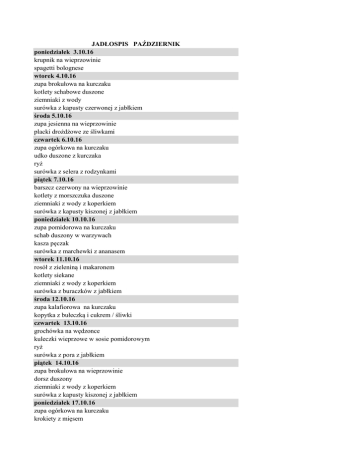 JADŁOSPIS PAŹDZIERNIK poniedziałek 3.10.16 krupnik na wieprzowinie spagetti bolognese wtorek 4.10.16 zupa brokułowa na kurczaku kotlety schabowe duszone ziemniaki z wody surówka z kapusty czerwonej z jabłkiem środa 5.10.16 zupa jesienna na wieprzowinie placki drożdżowe ze śliwkami czwartek 6.10.16 zupa ogórkowa na kurczaku udko duszone z kurczaka ryż surówka z selera z rodzynkami piątek 7.10.16 barszcz czerwony na wieprzowinie kotlety z morszczuka duszone ziemniaki z wody z koperkiem surówka z kapusty kiszonej z jabłkiem poniedziałek 10.10.16 zupa pomidorowa na kurczaku schab duszony w warzywach kasza pęczak surówka z marchewki z ananasem wtorek 11.10.16 rosół z zieleniną i makaronem kotlety siekane ziemniaki z wody z koperkiem surówka z buraczków z jabłkiem środa 12.10.16 zupa kalafiorowa na kurczaku kopytka z bułeczką i cukrem / śliwki czwartek 13.10.16 grochówka na wędzonce kuleczki wieprzowe w sosie pomidorowym ryż surówka z pora z jabłkiem piątek 14.10.16 zupa brokułowa na wieprzowinie dorsz duszony ziemniaki z wody z koperkiem surówka z kapusty kiszonej z jabłkiem poniedziałek 17.10.16 zupa ogórkowa na kurczaku krokiety z mięsem surówka z marchewki z jabłkiem wtorek 18.10.16 zupa porowa na kurczaku indyk w warzywach ryż surówka z buraczków z jabłkiem środa 19.10.16 barszcz ukraiński na wieprzowinie makaron z twarogiem i truskawkami czwartek 20.10.16 barszcz biały z ziemniakami gołąbki w sosie pomidorowym ziemniaki puree surówka z pora z jabłkiem piątek 21.10.16 krem z zielonego groszku kotlety rybne z mintaja kasza wiejska z sosem koperkowym surówka z kapusty kiszonej z jabłkiem poniedziałek 24.10.16 zupa jarzynowa na kurczaku gulasz wieprzowy z makaronem surówka z buraczków z jabłkiem wtorek 25.10.16 zupa pomidorowa na wieprzowinie kotlety mielone duszone ziemniaki z wody z koperkiem surówka z marchewki z brzoskwinią środa 26.10.16 kapuśniaczek na wędzonce pierogi z truskawkami ze śmietaną czwartek 27.10.16 żurek z ziemniakami na wieprzowinie bitki w sosie własnym ziemniaki z wody surówka z selera z rodzynkami piątek 28.10.16 rosół z zieleniną i makaronem ryba morszczuk duszona kasza gryczana surówka z kapusty pekińskiej z jabłkiem poniedziałek 31.10.16 krupnik na wieprzowinie risotto z piersi z kurczaka w warzywach surówka z marchewki z jabłkiem