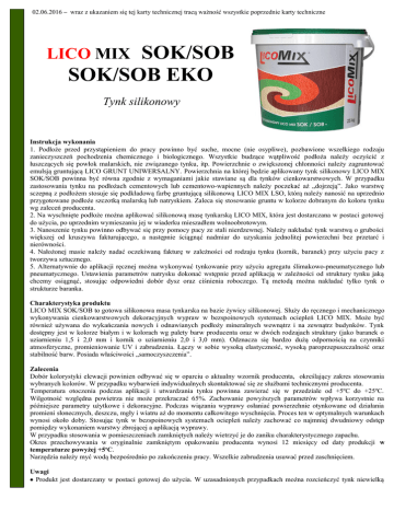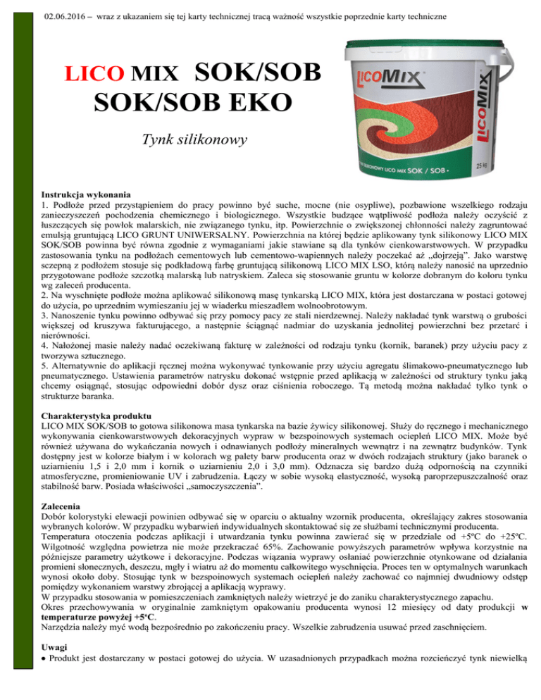 02.06.2016 – wraz z ukazaniem się tej karty technicznej tracą ważność wszystkie poprzednie karty techniczne SOK/SOB SOK/SOB EKO LICO MIX Tynk silikonowy Instrukcja wykonania 1. Podłoże przed przystąpieniem do pracy powinno być suche, mocne (nie osypliwe), pozbawione wszelkiego rodzaju zanieczyszczeń pochodzenia chemicznego i biologicznego. Wszystkie budzące wątpliwość podłoża należy oczyścić z łuszczących się powłok malarskich, nie związanego tynku, itp. Powierzchnie o zwiększonej chłonności należy zagruntować emulsją gruntującą LICO GRUNT UNIWERSALNY. Powierzchnia na której będzie aplikowany tynk silikonowy LICO MIX SOK/SOB powinna być równa zgodnie z wymaganiami jakie stawiane są dla tynków cienkowarstwowych. W przypadku zastosowania tynku na podłożach cementowych lub cementowo-wapiennych należy poczekać aż „dojrzeją”. Jako warstwę sczepną z podłożem stosuje się podkładową farbę gruntującą silikonową LICO MIX LSO, którą należy nanosić na uprzednio przygotowane podłoże szczotką malarską lub natryskiem. Zaleca się stosowanie gruntu w kolorze dobranym do koloru tynku wg zaleceń producenta. 2. Na wyschnięte podłoże można aplikować silikonową masę tynkarską LICO MIX, która jest dostarczana w postaci gotowej do użycia, po uprzednim wymieszaniu jej w wiaderku mieszadłem wolnoobrotowym. 3. Nanoszenie tynku powinno odbywać się przy pomocy pacy ze stali nierdzewnej. Należy nakładać tynk warstwą o grubości większej od kruszywa fakturującego, a następnie ściągnąć nadmiar do uzyskania jednolitej powierzchni bez przetarć i nierówności. 4. Nałożonej masie należy nadać oczekiwaną fakturę w zależności od rodzaju tynku (kornik, baranek) przy użyciu pacy z tworzywa sztucznego. 5. Alternatywnie do aplikacji ręcznej można wykonywać tynkowanie przy użyciu agregatu ślimakowo-pneumatycznego lub pneumatycznego. Ustawienia parametrów natrysku dokonać wstępnie przed aplikacją w zależności od struktury tynku jaką chcemy osiągnąć, stosując odpowiedni dobór dysz oraz ciśnienia roboczego. Tą metodą można nakładać tylko tynk o strukturze baranka. Charakterystyka produktu LICO MIX SOK/SOB to gotowa silikonowa masa tynkarska na bazie żywicy silikonowej. Służy do ręcznego i mechanicznego wykonywania cienkowarstwowych dekoracyjnych wypraw w bezspoinowych systemach ociepleń LICO MIX. Może być również używana do wykańczania nowych i odnawianych podłoży mineralnych wewnątrz i na zewnątrz budynków. Tynk dostępny jest w kolorze białym i w kolorach wg palety barw producenta oraz w dwóch rodzajach struktury (jako baranek o uziarnieniu 1,5 i 2,0 mm i kornik o uziarnieniu 2,0 i 3,0 mm). Odznacza się bardzo dużą odpornością na czynniki atmosferyczne, promieniowanie UV i zabrudzenia. Łączy w sobie wysoką elastyczność, wysoką paroprzepuszczalność oraz stabilność barw. Posiada właściwości „samoczyszczenia”. Zalecenia Dobór kolorystyki elewacji powinien odbywać się w oparciu o aktualny wzornik producenta, określający zakres stosowania wybranych kolorów. W przypadku wybarwień indywidualnych skontaktować się ze służbami technicznymi producenta. Temperatura otoczenia podczas aplikacji i utwardzania tynku powinna zawierać się w przedziale od +5ºC do +25ºC. Wilgotność względna powietrza nie może przekraczać 65%. Zachowanie powyższych parametrów wpływa korzystnie na późniejsze parametry użytkowe i dekoracyjne. Podczas wiązania wyprawy osłaniać powierzchnie otynkowane od działania promieni słonecznych, deszczu, mgły i wiatru aż do momentu całkowitego wyschnięcia. Proces ten w optymalnych warunkach wynosi około doby. Stosując tynk w bezspoinowych systemach ociepleń należy zachować co najmniej dwudniowy odstęp pomiędzy wykonaniem warstwy zbrojącej a aplikacją wyprawy. W przypadku stosowania w pomieszczeniach zamkniętych należy wietrzyć je do zaniku charakterystycznego zapachu. Okres przechowywania w oryginalnie zamkniętym opakowaniu producenta wynosi 12 miesięcy od daty produkcji w temperaturze powyżej +5oC. Narzędzia należy myć wodą bezpośrednio po zakończeniu pracy. Wszelkie zabrudzenia usuwać przed zaschnięciem. Uwagi Produkt jest dostarczany w postaci gotowej do użycia. W uzasadnionych przypadkach można rozcieńczyć tynk niewielką ilością czystej wody do uzyskania pożądanej konsystencji roboczej. Jakakolwiek inna ingerencja w jego skład jakościowy i ilościowy powoduje wyłączenie odpowiedzialności producenta za efekt finalny z jego zastosowaniem. Niesprzyjające warunki atmosferyczne podczas procesu wiązania (wysoka wilgotność, niskie temperatury) znacznie wydłużają czas schnięcia tynku; nawet do kilku tygodni. W przypadku dużej wilgotności podłoża lub stałego zawilgocenia podłoża należy je osuszyć a przyczynę podsiąkania wyeliminować przed aplikacją. Zbyt szybkie wysychanie spowodowane wysoką temperaturą lub suszącym wpływem wiatru może doprowadzić do powstania mikropęknięć znacznie skracających żywotność wyprawy tynkarskiej. Wyrób zawiera wypełniacze mineralne, co może spowodować różnicę w odcieniu tynku pochodzącego z różnych szarż, z tego powodu wykonywanie wyprawy tynkarskiej na poszczególnych elementach elewacji powinno być realizowane przy użyciu materiału pochodzącego z tych samych partii produkcyjnych lub ze zmieszanego razem (w przypadku różnych partii) na miejscu budowy przed aplikacją; w celu ujednorodnienia. Wykonywać prace tynkarskie w możliwie jednakowych warunkach atmosferycznych, aby nie dopuścić do powstania różnych odcieni związanej wyprawy. Po zakończeniu prac tynkarskich pozostawić rusztowania wraz z osłonami do czasu wyschnięcia i uzyskania przez powierzchnię odporności na czynniki atmosferyczne. Nie pozostawiać rusztowania bez osłon. Może ono pod wpływem promieniowania słonecznego odbić ślady na fasadzie. Po