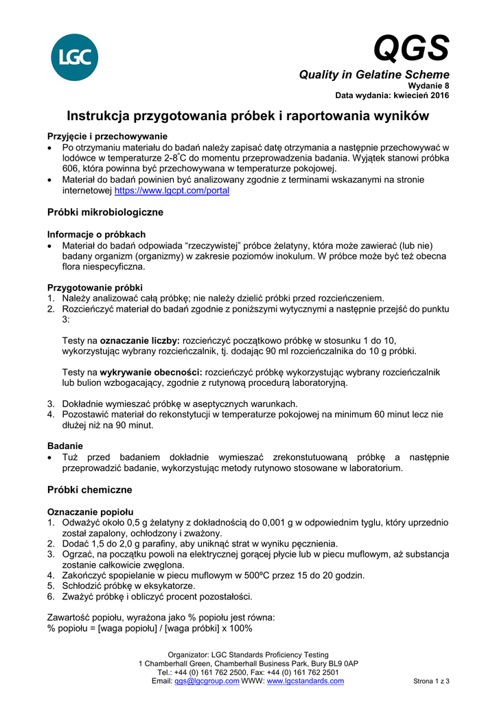 QGS Quality in Gelatine Scheme Wydanie 8 Data wydania: kwiecień 2016 Instrukcja przygotowania próbek i raportowania wyników Przyjęcie i przechowywanie • Po otrzymaniu materiału do badań należy zapisać datę otrzymania a następnie przechowywać w lodówce w temperaturze 2-8ºC do momentu przeprowadzenia badania. Wyjątek stanowi próbka 606, która powinna być przechowywana w temperaturze pokojowej. • Materiał do badań powinien być analizowany zgodnie z terminami wskazanymi na stronie internetowej https://www.lgcpt.com/portal Próbki mikrobiologiczne Informacje o próbkach • Materiał do badań odpowiada “rzeczywistej” próbce żelatyny, która może zawierać (lub nie) badany organizm (organizmy) w zakresie poziomów inokulum. W próbce może być też obecna flora niespecyficzna. Przygotowanie próbki 1. Należy analizować całą próbkę; nie należy dzielić próbki przed rozcieńczeniem. 2. Rozcieńczyć materiał do badań zgodnie z poniższymi wytycznymi a następnie przejść do punktu 3: Testy na oznaczanie liczby: rozcieńczyć początkowo próbkę w stosunku 1 do 10, wykorzystując wybrany rozcieńczalnik, tj. dodając 90 ml rozcieńczalnika do 10 g próbki. Testy na wykrywanie obecności: rozcieńczyć próbkę wykorzystując wybrany rozcieńczalnik lub bulion wzbogacający, zgodnie z rutynową procedurą laboratoryjną. 3. Dokładnie wymieszać próbkę w aseptycznych warunkach. 4. Pozostawić materiał do rekonstytucji w temperaturze pokojowej na minimum 60 minut lecz nie dłużej niż na 90 minut. Badanie • Tuż przed badaniem dokładnie wymieszać zrekonstutuowaną próbkę a następnie przeprowadzić badanie, wykorzystując metody rutynowo stosowane w laboratorium. Próbki chemiczne Oznaczanie popiołu 1. Odważyć około 0,5 g żelatyny z dokładnością do 0,001 g w odpowiednim tyglu, który uprzednio został zapalony, ochłodzony i zważony. 2. Dodać 1,5 do 2,0 g parafiny, aby uniknąć strat w wyniku pęcznienia. 3. Ogrzać, na początku powoli na elektrycznej gorącej płycie lub w piecu muflowym, aż substancja zostanie całkowicie zwęglona. 4. Zakończyć spopielanie w piecu muflowym w 500ºC przez 15 do 20 godzin. 5. Schłodzić próbkę w eksykatorze. 6. Zważyć próbkę i obliczyć procent pozostałości. Zawartość popiołu, wyrażona jako % popiołu jest równa: % popiołu = [waga popiołu] / [waga próbki] x 100% Organizator: LGC Standards Proficiency Testing 1 Chamberhall Green, Chamberhall Business Park, Bury BL9 0AP Tel.: +44 (0) 161 762 2500, Fax: +44 (0) 161 762 2501 Email: [email protected] WWW: www.lgcstandards.com Strona 1 z 3 QGS Quality in Gelatine Scheme Wydanie 8 Data wydania: kwiecień 2016 Instrukcja przygotowania próbek i raportowania wyników Oznaczanie odporności żelu na ścinanie 1. Aparatura: Analizator tekstury lub gelometer z cylindrycznym tłokiem o średnicy 12,7 ± 0,1 mm z płaszczyzną powierzchni naciskowej z ostrą krawędzią dolną, albo z butelką o średnicy wewnętrznej 59 ± 1 mm, wysokiej na 85 mm. 2. Ustawić aparaturę zgodnie z instrukcją producenta. Ustawienia: odległość 4 mm, prędkość testowa 0,5 mm / s. 3. Metoda: Należy wykonać test w dwóch powtórzeniach. Umieścić 7,5 g substancji do testowania w każdej butelce. Dodać 105 ml wody R, umieścić szkiełko zegarkowe nad każdą butelką i odstawić na 1-4 godziny. Ogrzewać w łaźni wodnej w temperaturze 65 ± 2°C przez 15 minut. Podczas ogrzewania delikatnie mieszać przy pomocy szklanej pałeczki. Upewnić się, że roztwór jest jednorodny, włącznie z wszelką skroploną wodą z wewnętrznych ścian butelki. Pozostawić do ochłodzenia w temperaturze pokojowej przez 15 minut i przenieść do butelek do łaźni sterowanej termostatem, w temperaturze 10,0 ± 0,1°C, wyposażonej w urządzenia zapewniające, że platforma, na której stoi butelka jest całkowicie pozioma. Zamknąć butelki gumowym korkiem i odstawić na 17 ± 1 godz. Wyjąć szklaną próbkę z kąpieli i szybko wytrzeć wodę z zewnątrz butelki. Wyśrodkować kolejno dwie butelki na platformie aparatu tak, aby nurnik stykał się z próbką tak blisko jej punktu środkowego jak to możliwe i rozpocząć pomiar. 4. Należy wyraportować wyniki jako średnią z dwóch pomiarów. Oznaczanie punktu izoelektrycznego 1. Przygotować 5% roztwór żelatyny i całkowicie zjonizować poprzez działanie żywic jonowymiennych. 2. Mierzyć pH uzyskanego roztworu w temperaturze 30°C, odczyt odpowiada punktowi izoelektrycznemu żelatyny. Oznaczanie wilgotności 1. Umyć szalki do odparowywania bardzo dokładnie w gorącej wodzie. 2. Umieścić naczynie w suszarce w 105°C przez co najmniej godzinę. 3. Schłodzić naczynie w eksykatorze aż do osiągnięcia temperatury pokojowej. 4. Odważyć około 5,0 g żelatyny do najbliższego mg i zanotować wagę próbki (m0) i wagę próbki wraz z parownicą (m1). 5. Umieścić parownicę zawierając próbkę w suszarce w 105 ± 2ºC przez 16 do 18 godzin. 6. Schłodzić naczynie w eksykatorze, aż do osiągnięcia temperatury pokojowej i zważyć z dokładnością do miligrama (m2), zważyć i obliczyć procent pozostałości. Zawartość wilgoci, wyrażona jako procent wagowy, jest równa: % Wilgotności = [(m1) - m2) / m0] X 100% Gdzie: m0 to waga w gramach próbki do badań, m1 waga w gramach próbki do badań i parownicy przed suszeniem, m2 to waga próbki do badań i parownicy po wysuszeniu. Oznaczanie pH 1. Rozpuścić 1,00 g żelatyny w wodzie R wolnej od dwutlenku węgla, rozcieńczyć w 100 ml tym samym rozcieńczalnikiem i utrzymywać w tej temperaturze roztwór do przeprowadzania testów. Woda R wolna od dwutlenku węgla: Woda, która była gotowana przez kilka minut i zabezpieczona przed dostępem powietrza z atmosfery podczas schładzania i przechowywania. Organizator: LGC Standards Proficiency Testing 1 Chamberhall Green, Chamberhall Business Park, Bury BL9 0AP Tel.: +44 (0) 161 762 2500, Fax: +44 (0) 161 762