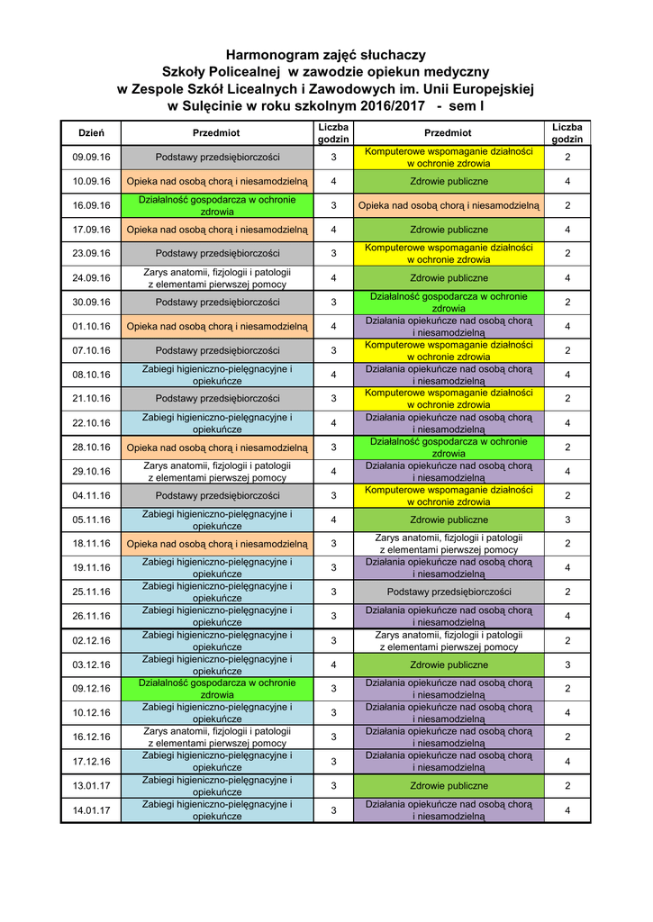 Harmonogram zajęć słuchaczy Szkoły Policealnej w zawodzie opiekun medyczny w Zespole Szkół Licealnych i Zawodowych im. Unii Europejskiej w Sulęcinie w roku szkolnym 2016/2017 - sem I Dzień Przedmiot Liczba godzin Przedmiot Liczba godzin 09.09.16 Podstawy przedsiębiorczości 3 Komputerowe wspomaganie działności w ochronie zdrowia 2 10.09.16 Opieka nad osobą chorą i niesamodzielną 4 Zdrowie publiczne 4 16.09.16 Działalność gospodarcza w ochronie zdrowia 3 Opieka nad osobą chorą i niesamodzielną 2 17.09.16 Opieka nad osobą chorą i niesamodzielną 4 Zdrowie publiczne 4 23.09.16 Podstawy przedsiębiorczości 3 Komputerowe wspomaganie działności w ochronie zdrowia 2 24.09.16 Zarys anatomii, fizjologii i patologii z elementami pierwszej pomocy 4 Zdrowie publiczne 4 30.09.16 Podstawy przedsiębiorczości 3 01.10.16 Opieka nad osobą chorą i niesamodzielną 4 07.10.16 Podstawy przedsiębiorczości 3 08.10.16 Zabiegi higieniczno-pielęgnacyjne i opiekuńcze 4 21.10.16 Podstawy przedsiębiorczości 3 22.10.16 Zabiegi higieniczno-pielęgnacyjne i opiekuńcze 4 28.10.16 Opieka nad osobą chorą i niesamodzielną 3 29.10.16 Zarys anatomii, fizjologii i patologii z elementami pierwszej pomocy 4 04.11.16 Podstawy przedsiębiorczości 3 05.11.16 Zabiegi higieniczno-pielęgnacyjne i opiekuńcze 4 18.11.16 Opieka nad osobą chorą i niesamodzielną 3 19.11.16 25.11.16 26.11.16 02.12.16 03.12.16 09.12.16 10.12.16 16.12.16 17.12.16 13.01.17 14.01.17 Zabiegi higieniczno-pielęgnacyjne i opiekuńcze Zabiegi higieniczno-pielęgnacyjne i opiekuńcze Zabiegi higieniczno-pielęgnacyjne i opiekuńcze Zabiegi higieniczno-pielęgnacyjne i opiekuńcze Zabiegi higieniczno-pielęgnacyjne i opiekuńcze Działalność gospodarcza w ochronie zdrowia Zabiegi higieniczno-pielęgnacyjne i opiekuńcze Zarys anatomii, fizjologii i patologii z elementami pierwszej pomocy Zabiegi higieniczno-pielęgnacyjne i opiekuńcze Zabiegi higieniczno-pielęgnacyjne i opiekuńcze Zabiegi higieniczno-pielęgnacyjne i opiekuńcze 3 3 3 3 4 3 3 3 3 Działalność gospodarcza w ochronie zdrowia Działania opiekuńcze nad osobą chorą i niesamodzielną Komputerowe wspomaganie działności w ochronie zdrowia Działania opiekuńcze nad osobą chorą i niesamodzielną Komputerowe wspomaganie działności w ochronie zdrowia Działania opiekuńcze nad osobą chorą i niesamodzielną Działalność gospodarcza w ochronie zdrowia Działania opiekuńcze nad osobą chorą i niesamodzielną Komputerowe wspomaganie działności w ochronie zdrowia Zdrowie publiczne Zarys anatomii, fizjologii i patologii z elementami pierwszej pomocy Działania opiekuńcze nad osobą chorą i niesamodzielną Podstawy przedsiębiorczości Działania opiekuńcze nad osobą chorą i niesamodzielną Zarys anatomii, fizjologii i patologii z elementami pierwszej pomocy Zdrowie publiczne Działania opiekuńcze nad osobą chorą i niesamodzielną Działania opiekuńcze nad osobą chorą i niesamodzielną Działania opiekuńcze nad osobą chorą i niesamodzielną Działania opiekuńcze nad osobą chorą i niesamodzielną 2 4 2 4 2 4 2 4 2 3 2 4 2 4 2 3 2 4 2 4 3 Zdrowie publiczne 2 3 Działania opiekuńcze nad osobą chorą i niesamodzielną 4