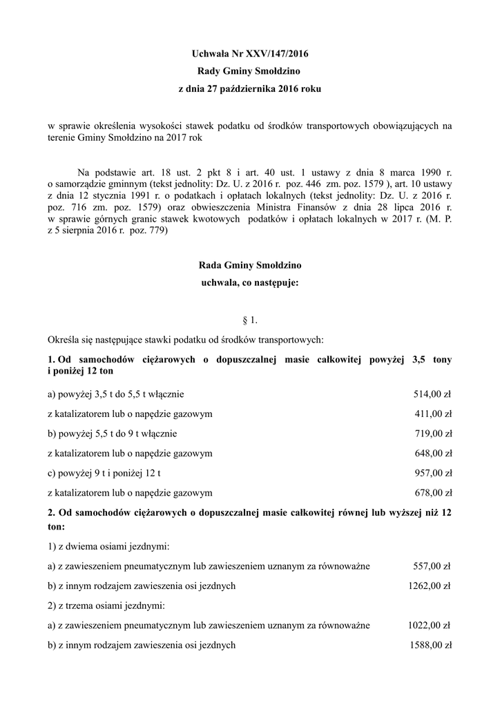 Uchwała Nr XXV/147/2016 Rady Gminy Smołdzino z dnia 27 października 2016 roku w sprawie określenia wysokości stawek podatku od środków transportowych obowiązujących na terenie Gminy Smołdzino na 2017 rok Na podstawie art. 18 ust. 2 pkt 8 i art. 40 ust. 1 ustawy z dnia 8 marca 1990 r. o samorządzie gminnym (tekst jednolity: Dz. U. z 2016 r. poz. 446 zm. poz. 1579 ), art. 10 ustawy z dnia 12 stycznia 1991 r. o podatkach i opłatach lokalnych (tekst jednolity: Dz. U. z 2016 r. poz. 716 zm. poz. 1579) oraz obwieszczenia Ministra Finansów z dnia 28 lipca 2016 r. w sprawie górnych granic stawek kwotowych podatków i opłatach lokalnych w 2017 r. (M. P. z 5 sierpnia 2016 r. poz. 779) Rada Gminy Smołdzino uchwala, co następuje: § 1. Określa się następujące stawki podatku od środków transportowych: 1. Od samochodów ciężarowych o dopuszczalnej masie całkowitej powyżej 3,5 tony i poniżej 12 ton a) powyżej 3,5 t do 5,5 t włącznie 514,00 zł z katalizatorem lub o napędzie gazowym 411,00 zł b) powyżej 5,5 t do 9 t włącznie 719,00 zł z katalizatorem lub o napędzie gazowym 648,00 zł c) powyżej 9 t i poniżej 12 t 957,00 zł z katalizatorem lub o napędzie gazowym 678,00 zł 2. Od samochodów ciężarowych o dopuszczalnej masie całkowitej równej lub wyższej niż 12 ton: 1) z dwiema osiami jezdnymi: a) z zawieszeniem pneumatycznym lub zawieszeniem uznanym za równoważne b) z innym rodzajem zawieszenia osi jezdnych 557,00 zł 1262,00 zł 2) z trzema osiami jezdnymi: a) z zawieszeniem pneumatycznym lub zawieszeniem uznanym za równoważne 1022,00 zł b) z innym rodzajem zawieszenia osi jezdnych 1588,00 zł 3) z czterema i więcej osiami jezdnymi: a) z zawieszeniem pneumatycznym lub zawieszeniem uznanym za równoważne 1667,00 zł b) z innym rodzajem zawieszenia osi jezdnych o DMC od 12 ton do mniej niż 29 ton 1667,00 zł c) z innym rodzajem zawieszenia osi jezdnych o DMC równej i wyższej niż 29 ton 2472,00 zł 3. Od ciągników siodłowych lub balastowych przystosowanych do używania łącznie z przyczepą lub naczepą o dopuszczalnej masie całkowitej zespołu pojazdów od 3,5 tony i poniżej 12 ton 617,00 zł 4. Od ciągników siodłowych i balastowych przystosowanych do używania łącznie z przyczepą lub naczepą o dopuszczalnej masie całkowitej zespołu pojazdów równej lub wyższej niż 12 ton 1) z dwiema osiami jezdnymi: a) z zawieszeniem pneumatycznym lub zawieszeniem uznanym za równoważne 1400,00 zł b) z innym rodzajem zawieszenia osi jezdnych o DMC od 12 ton do mniej niż 31 ton c) z innym rodzajem zawieszenia osi jezdnych o DMC równej i wyższej niż 31 ton 911,00 zł 1952,00 zł 2) z trzema i więcej osiami jezdnymi: a) z zawieszeniem pneumatycznym lub zawieszeniem uznanym za równoważne 1736,00 zł b) z innym rodzajem zawieszenia osi jezdnych o DMC od 12 ton do mniej niż 40 ton c) z innym rodzajem zawieszenia osi jezdnych o DMC równej i wyższej niż 40 ton 1736,00 zł 2568,00 zł 5. Od przyczep lub naczep, które łącznie z pojazdem silnikowym posiadają dopuszczalną masę całkowitą od 7 ton i poniżej 12 ton z wyjątkiem związanych wyłącznie z działalnością rolniczą prowadzoną przez podatnika podatku rolnego 551,00 zł 6. Od przyczep lub naczep, które łącznie z pojazdem silnikowym posiadają dopuszczalną masę całkowitą równą lub wyższą niż 12 ton z wyjątkiem związanych wyłącznie z działalnością rolniczą prowadzoną przez podatnika podatku rolnego 1) z jedną osią jezdną: a) z zawieszeniem pneumatycznym lub zawieszeniem uznanym za równoważne 322,00 zł b) z innym rodzajem zawieszenia osi jezdnych 565,00 zł 2) z dwiema osiami jezdnymi: a) z zawieszeniem pneumatycznym lub zawieszeniem uznanym za równoważne 1158,00 zł b) z innym rodzajem zawieszenia osi jezdnych 1713,00 zł 3) z trzema i więcej osiami jezdnymi: a) z zawieszeniem pneumatycznym lub zawieszeniem uznanym za równoważne b) z innym rodzajem zawieszenia osi jezdnych 950,00 zł 1291,00 zł 7. Od autobusów, w zależności od liczby miejsc do siedzenia poza miejscem kierowcy a) mniejszej niż 22 miejsca 536,00 zł z katalizatorem lub o napędzie gazowym 469,00 zł b) równej lub większej niż 22 miejsca 1000,00 zł z katalizatorem lub o napędzie gazowym 937,00 zł § 2. 1. Podstawę do zastosowania niższej stawki podatku od środków transportowych od samochodów wyposażonych w katalizator spalin lub instalację zasilania gazem propan-butan stanowić będzie: a) wpis w dowodzie rejestracyjnym o zainstalowanym urządzeniu wymienionym w ust. 1 oraz wymagane badania techniczne (atest), b) w przypadku braku wpisu w dowodzie rejestracyjnym, zaświadczenie wydane przez stacje diagnostyczne aktualizowane w ramach badań technicznych. 2. W przypadku niewykonania przeglądu technicznego (atestu) na urządzenia wymienione w ust. 1 w ciągu roku podatkowego podatnik ma prawo opłacania podatku od środków transportowych wg niższej stawki, jeżeli wg stanu na pierwszy ustawowy termin płatności atest taki posiadał. § 3. Wykonanie uchwały powierza się Wójtowi Gminy Smołdzino. § 4. Traci moc uchwała Nr XVI/101/2015 Rady Gminy Smołdzino z dnia 30 listopada 2015 r. w sprawie określenia wysokości stawek podatku od środków transportowych obowiązujących na terenie Gminy Smołdzino na 2016 rok. § 5. Uchwała wchodzi w życie po upływie 14 dni od dnia ogłoszenia w Dzienniku Urzędowym Województwa Pomorskiego z mocą obowiązującą od 01 stycznia 2017 roku. Przewodniczący Rady Gminy /-/Marek Krystjańczuk