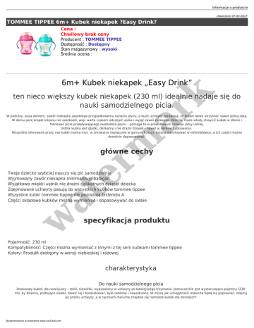 Informacje o produkcie Utworzono 07-03-2017 TOMMEE TIPPEE 6m+ Kubek niekapek ?Easy Drink? Cena : Chwilowy brak ceny Producent : TOMMEE TIPPEE Dostępność : Dostępny Stan magazynowy : wysoki Średnia ocena : er m ar k 6m+ Kubek niekapek „Easy Drink” ten nieco większy kubek niekapek (230 ml) idealnie nadaje się do nauki samodzielnego picia. W podróży, poza domem, zawór niekapka zapobiega przypadkowemu rozlaniu płynu, a duże uchwyty sprawiają, że kubek łatwo utrzymać nawet jedną ręką. W domu parę kropel nikomu nie zaszkodzi, więc warto czasem odczepić uszka i wyjąć zawór niekapka. Dziecko może wtedy chwycić kubek w dłonie i trenować picie przepływającego swobodnie płynu – pomaga to w prawidłowym rozwoju jamy ustnej. Ustnik kubka jest gładki, delikatny i nie drażni dziąseł – nawet w okresie ząbkowania. Wszystkie oferowane przez nas kubki można myć w zmywarce (wyłącznie w górnym koszu), można sterylizować w mikrofalówce, a ich części można dowolnie dopasowywać! główne cechy w at Twoje dziecko szybciej nauczy się pić samodzielnie Wyjmowany zawór niekapka minimalizuje bałagan Wyjątkowo miękki ustnik nie drażni delikatnych dziąseł dziecka Zdejmowane uchwyty pasują do wszystkich kubków tommee tippee Wszystkie kubki tommee tippee nie posiadają bisfenolu A Części składowe kubków można wymieniać i dopasowywać do siebie specyfikacja produktu Pojemność: 230 ml Kompatybilność: Części można wymieniać z innymi z tej serii kubkami tommee tippee Kolory: Produkt dostępny w wersji niebieskiej i różowej charakterystyka Do nauki samodzielnego picia Doskonały kubek dla nowicjuszy – lekki, niewielki, wyposażony w uchwyty do łatwiejszego trzymania. Jednocześnie jest wystarczająco pojemny (230 ml), by dziecko, próbujące siadać, bawić się i baraszkować, było radosne i nawodnione. W miarę jak umiejętności malucha będą się poprawiać, zdejmij po prostu uchwyty, a w rączkach malucha znajdzie się niemalże kubek dla dorosłych! Wygenerowano w programie www.oscGold.com Frajda picia, mniej mycia Nauka picia powinna być przyjemna i – dzięki naszemu sprytnemu niekapiącemu zaworowi– wcale nie musi oznaczać bałaganu. A jeśli chcesz, by dziecko poznało uroki przepływającego swobodnie płynu – wystarczy jeden pstryk i zawór zdjęty! Picie nie sprawia trudności er m ar k Wszystkie nasze kubki gwarantują łatwość picia. Sprytny zawór niekapka pozwala na swobodny przepływ płynu przez ustnik, gdy dziecko chce pić, zapewniając całkowitą szczelność kubka między łykami. Delikatny i bezpieczny Dziąsła Twojego dziecka mogą być bardzo wrażliwe – szczególnie w okresie ząbkowania – ale nie martw się! Wyjątkowo miękki ustnik kubka jest całkowicie bezpieczny dla buzi malucha. Oczywiście wszystkie oferowane przez nas kubki nie zawierają bisfenolu A i można je poddawać sterylizacji parowej. Łatwe w użytkowaniu w at Wiemy, że opieka nad dzieckiem to ciężka praca, więc zadbaliśmy o to, by wszystkie nasze kubki były łatwe w montażu i myciu (ciepłą wodą z dodatkiem środka myjącego albo w górnym koszu zmywarki). Co więcej, części składowe kubka można stosować wymiennie z innymi z tej samej linii. Wszystko będzie do siebie pasować. Kombinacje, które przyciągają wzrok Wybieraj z gamy kolorów i wzorów, znajdź idealny kubek dla siebie i swojego dziecka! Dostępne opcje TOMMEE TIPPEE 6m+ Kubek niekapek ?Easy Drink? » TOMMEE TIPPEE: Easy Drink Różowy, Easy Drink Niebieski.