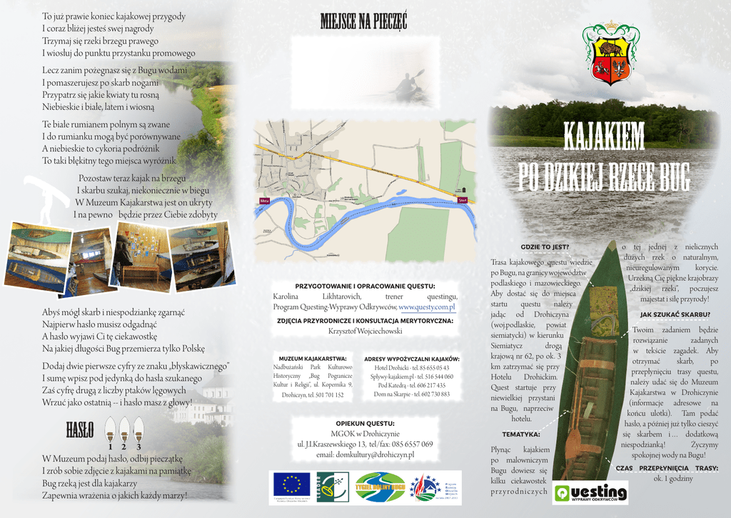 To już prawie koniec kajakowej przygody I coraz bliżej jesteś swej nagrody Trzymaj się rzeki brzegu prawego I wiosłuj do punktu przystanku promowego MIEJSCE NA PIECZEC Lecz zanim pożegnasz się z Bugu wodami I pomaszerujesz po skarb nogami Przypatrz się jakie kwiaty tu rosną Niebieskie i białe, latem i wiosną KAJAKIEM PO DZIKIEJ RZECE BUG Te białe rumianem polnym są zwane I do rumianku mogą być porównywane A niebieskie to cykoria podróżnik To taki błękitny tego miejsca wyróżnik Pozostaw teraz kajak na brzegu I skarbu szukaj, niekoniecznie w biegu W Muzeum Kajakarstwa jest on ukryty I na pewno będzie przez Ciebie zdobyty GDZIE TO JEST? PRZYGOTOWANIE I OPRACOWANIE QUESTU: Abyś mógł skarb i niespodziankę zgarnąć Najpierw hasło musisz odgadnąć A hasło wyjawi Ci tę ciekawostkę Na jakiej długości Bug przemierza tylko Polskę Dodaj dwie pierwsze cyfry ze znaku „błyskawicznego” I sumę wpisz pod jedynką do hasła szukanego Zaś cyfrę drugą z liczby ptaków lęgowych Wrzuć jako ostatnią -- i hasło masz z głowy! HASŁO 1 2 3 W Muzeum podaj hasło, odbij pieczątkę I zrób sobie zdjęcie z kajakami na pamiątkę Bug rzeką jest dla kajakarzy Zapewnia wrażenia o jakich każdy marzy! Karolina Likhtarovich, trener questingu, Program Questing-Wyprawy Odkrywców, www.questy.com.pl ZDJĘCIA PRZYRODNICZE I KONSULTACJA MERYTORYCZNA: Krzysztof Wojciechowski MUZEUM KAJAKARSTWA: ADRESY WYPOŻYCZALNI KAJAKÓW: Nadbużański Park Kulturowo Historyczny „Bug Pogranicze Kultur i Religii”, ul. Kopernika 9, Drohiczyn, tel. 501 701 152 Hotel Drohicki - tel. 85 655 05 43 Spływy-kajakiem.pl - tel. 516 544 060 Pod Katedrą - tel. 606 217 435 Dom na Skarpie - tel. 602 730 883 OPIEKUN QUESTU: MGOK w Drohiczynie ul. J.I.Kraszewskiego 13, tel/fax: 085 6557 069 email: [email protected] Trasa kajakowego questu wiedzie po Bugu, na granicy województw podlaskiego i mazowieckiego. Aby dostać się do miejsca startu questu należy jadąc od Drohiczyna (woj.podlaskie, powiat siemiatycki) w kierunku Siemiatycz drogą krajową nr 62, po ok. 3 km zatrzymać się przy Hotelu Drohickim. Quest startuje przy niewielkiej przystani na Bugu, naprzeciw hotelu. TEMATYKA: Płynąc kajakiem po malowniczym Bugu dowiesz się kilku ciekawostek pr z y rodnic z ych o tej jednej z nielicznych dużych rzek o naturalnym, nieuregulowanym korycie. Urzekną Cię piękne krajobrazy „dzikiej rzeki”, poczujesz majestat i siłę przyrody! JAK SZUKAĆ SKARBU? Twoim zadaniem będzie rozwiązanie zadanych w tekście zagadek. Aby otrzymać skarb, po przepłynięciu trasy questu, należy udać się do Muzeum Kajakarstwa w Drohiczynie (informacje adresowe na końcu ulotki). Tam podać hasło, a później już tylko cieszyć się skarbem i… dodatkową niespodzianką! Życzymy spokojnej wody na Bugu! CZAS PRZEPŁYNIĘCIA TRASY: ok. 1 godziny Witamy Cię u nas drogi Kajakarzu Na Bugu wielkiego wodnym korytarzu Dzisiaj przygoda prawdziwa Cię czeka Wskakuj więc w kajak - dłużej nie zwlekaj! START Pamiętaj o odpowiednim ubraniu Bo możesz ulec drobnemu zalaniu Wszak to rzeka i fale na niej bywają I zmoczyć mogą tych, co pływają. Usiądź w kajaku, chwyć w ręce wiosło Bo samo niestety nie będzie Cię niosło A jeszcze długopis będzie potrzebny Byś na końcu questu hasła był pewny. Dziś zapraszamy na przyrodniczą wyprawę A będą tu różne informacje ciekawe Bo Bug to prawdziwie dzika rzeka „Łyk natury” na każdego tutaj czeka! Bug takim korytem się charakteryzuje Że często na swej długości kluczy, meandruje. Od samych źródeł, na Ukrainie Prawie bez ingerencji człowieka płynie. To rzeka z licznymi wyspami, skarpami I starorzeczami, zwanymi bużyskami. A jakże bogata tu fauna i flora! Zacząć opowieść o tym najwyższa pora! Choć Bug jest rzeką dosyć szeroką I wielu miejscach naprawdę głęboką Woda jest na nim zwykle spokojna Dla kajakarzy, można rzec - hojna. Linia brzegowa jest urozmaicona To tuż przy wodzie, to wysoko wzniesiona A teraz spojrzyj na lewą stronę Niejednego drzewa zobaczysz koronę Spotkać tu możesz olszę szarą Wierzbę kruchą i topolę białą A te dwa drzewa tym się wyróżniają Że srebrnego koloru spody liści mają Trzymaj się blisko brzegu lewego I śladów wypatruj działania bobrowego Bobry i wydry tu licznie mieszkają Bo dobre warunki do życia mają. Gdy zaś spojrzysz na brzeg prawy Zobaczysz tam raczej trzciny i trawy Znana Ci pałka jest wspomnienia godna A także manna mielec – taka trawa wodna. Niechaj twej uwadze także nie umyka. Piękny, pyszny i biały kwiat kielisznika. Nie brak tutaj również fioletowych kwiatów To psianka słodkogórz – kuzynka ziemniaków. A jeśli płyniesz po Bugu wiosną Kosaćce żółte i przytulie tu rosną Słonecznego uroku rzece dodają Żółtymi kwiatami brzegi rozświetlają Po przepłynięciu części trasy Zobaczysz po prawej iglasty lasek Na pewno znasz te drzewa żywiczne? To sosny, w tym miejscu jak widzisz liczne Bug jest związany z liczną awifauną 179 gatunków ptaków lęgowych nie jest liczbą marną Gdy zobaczysz skarpę z norką pod trawami Wiedz, że żyje tam ptak, co żywi się…rybami! Może będziesz miał szczęście go spotkać? Bo chodzi o żółto-niebieskiego zimorodka! Ryby też mają swą silną reprezentację Jeśli masz wędkę, może „złowisz” kolację? Płocie, ukleje, klenie, leszcze I wiele innych gatunków jeszcze. Gdy zobaczysz w prawo zakręt rzeki To znaczy że koniec wyprawy już niedaleki A przed zakrętem odszukaj błyskawicy na znaku I numer z niej wpisz obok dzielny brachu Wiosłuj teraz żwawo i radośnie Bo za chwilę skarpa przed Tobą wyrośnie Której widok w piersi dech zapiera I czasem z wrażenia mowę odbiera Na pierwszym planie Góra Zamkowa Która niejedną legendę chowa Ale to od niej się także zaczyna Burzliwa historia miasta Drohiczyna Zobaczysz fragment cerkwi i kościołów ściany Ale o tym w innym queście opowiad