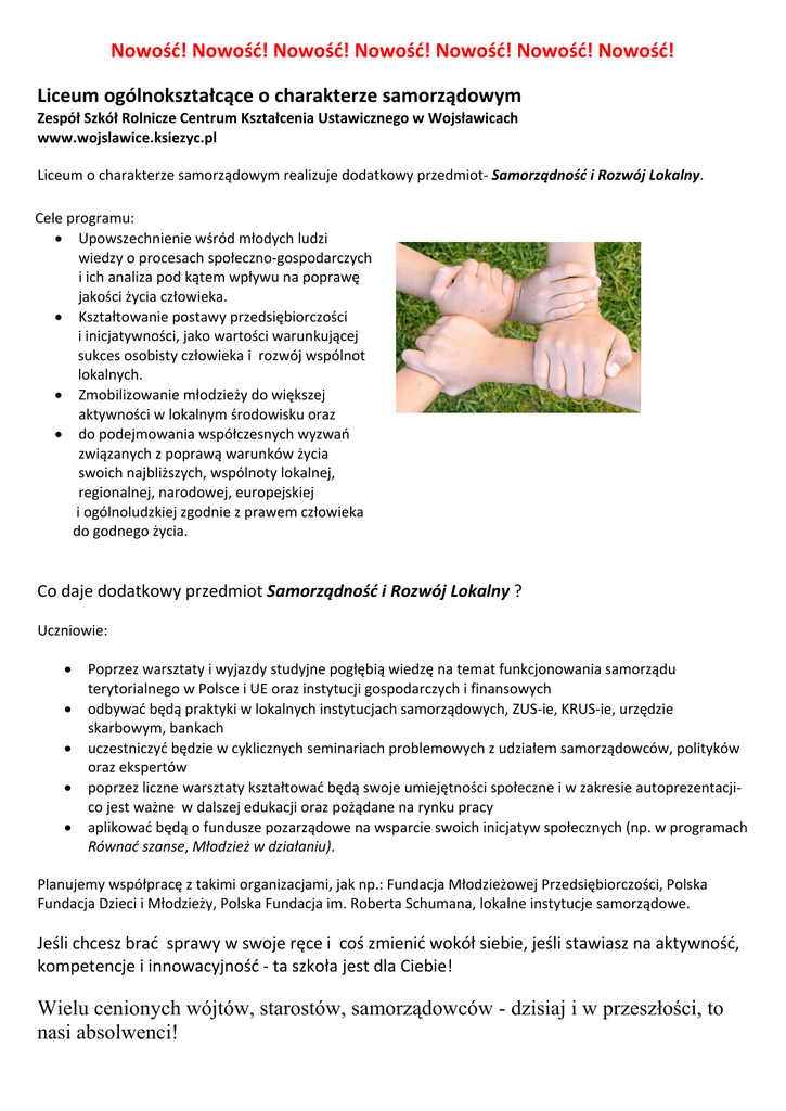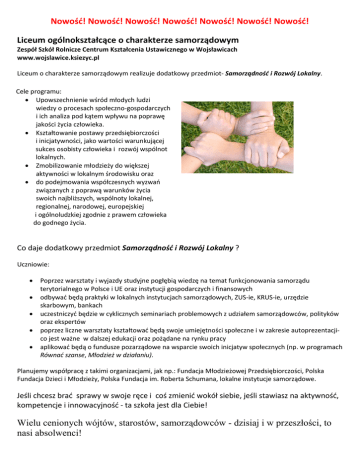 Nowość! Nowość! Nowość! Nowość! Nowość! Nowość! Nowość! Liceum ogólnokształcące o charakterze samorządowym Zespół Szkół Rolnicze Centrum Kształcenia Ustawicznego w Wojsławicach www.wojslawice.ksiezyc.pl Liceum o charakterze samorządowym realizuje dodatkowy przedmiot- Samorządność i Rozwój Lokalny. Cele programu: Upowszechnienie wśród młodych ludzi wiedzy o procesach społeczno-gospodarczych i ich analiza pod kątem wpływu na poprawę jakości życia człowieka. Kształtowanie postawy przedsiębiorczości i inicjatywności, jako wartości warunkującej sukces osobisty człowieka i rozwój wspólnot lokalnych. Zmobilizowanie młodzieży do większej aktywności w lokalnym środowisku oraz do podejmowania współczesnych wyzwań związanych z poprawą warunków życia swoich najbliższych, wspólnoty lokalnej, regionalnej, narodowej, europejskiej i ogólnoludzkiej zgodnie z prawem człowieka do godnego życia. Co daje dodatkowy przedmiot Samorządność i Rozwój Lokalny ? Uczniowie: Poprzez warsztaty i wyjazdy studyjne pogłębią wiedzę na temat funkcjonowania samorządu terytorialnego w Polsce i UE oraz instytucji gospodarczych i finansowych odbywać będą praktyki w lokalnych instytucjach samorządowych, ZUS-ie, KRUS-ie, urzędzie skarbowym, bankach uczestniczyć będzie w cyklicznych seminariach problemowych z udziałem samorządowców, polityków oraz ekspertów poprzez liczne warsztaty kształtować będą swoje umiejętności społeczne i w zakresie autoprezentacjico jest ważne w dalszej edukacji oraz pożądane na rynku pracy aplikować będą o fundusze pozarządowe na wsparcie swoich inicjatyw społecznych (np. w programach Równać szanse, Młodzież w działaniu). Planujemy współpracę z takimi organizacjami, jak np.: Fundacja Młodzieżowej Przedsiębiorczości, Polska Fundacja Dzieci i Młodzieży, Polska Fundacja im. Roberta Schumana, lokalne instytucje samorządowe. Jeśli chcesz brać sprawy w swoje ręce i coś zmienić wokół siebie, jeśli stawiasz na aktywność, kompetencje i innowacyjność - ta szkoła jest dla Ciebie! Wielu cenionych wójtów, starostów, samorządowców - dzisiaj i w przeszłości, to nasi absolwenci!