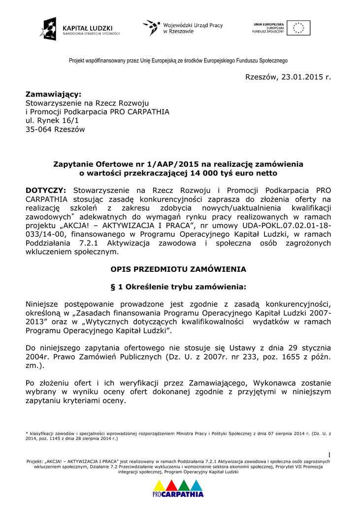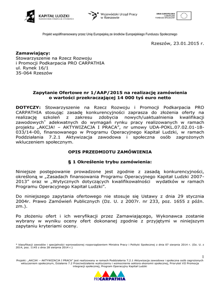Projekt współfinansowany przez Unię Europejską ze środków Europejskiego Funduszu Społecznego Rzeszów, 23.01.2015 r. Zamawiający: Stowarzyszenie na Rzecz Rozwoju i Promocji Podkarpacia PRO CARPATHIA ul. Rynek 16/1 35-064 Rzeszów Zapytanie Ofertowe nr 1/AAP/2015 na realizację zamówienia o wartości przekraczającej 14 000 tyś euro netto DOTYCZY: Stowarzyszenie na Rzecz Rozwoju i Promocji Podkarpacia PRO CARPATHIA stosując zasadę konkurencyjności zaprasza do złożenia oferty na realizację szkoleń z zakresu zdobycia nowych/uaktualnienia kwalifikacji zawodowych* adekwatnych do wymagań rynku pracy realizowanych w ramach projektu „AKCJA! – AKTYWIZACJA I PRACA”, nr umowy UDA-POKL.07.02.01-18033/14-00, finansowanego w Programu Operacyjnego Kapitał Ludzki, w ramach Poddziałania 7.2.1 Aktywizacja zawodowa i społeczna osób zagrożonych wkluczeniem społecznym. OPIS PRZEDMIOTU ZAMÓWIENIA § 1 Określenie trybu zamówienia: Niniejsze postępowanie prowadzone jest zgodnie z zasadą konkurencyjności, określoną w „Zasadach finansowania Programu Operacyjnego Kapitał Ludzki 20072013” oraz w „Wytycznych dotyczących kwalifikowalności wydatków w ramach Programu Operacyjnego Kapitał Ludzki”. Do niniejszego zapytania ofertowego nie stosuje się Ustawy z dnia 29 stycznia 2004r. Prawo Zamówień Publicznych (Dz. U. z 2007r. nr 233, poz. 1655 z późn. zm.). Po złożeniu ofert i ich weryfikacji przez Zamawiającego, Wykonawca zostanie wybrany w wyniku oceny ofert dokonanej zgodnie z przyjętymi w niniejszym zapytaniu kryteriami oceny. * klasyfikacji zawodów i specjalności wprowadzonej rozporządzeniem Ministra Pracy i Polityki Społecznej z dnia 07 sierpnia 2014 r. (Dz. U. z 2014, poz. 1145 z dnia 28 sierpnia 2014 r.) 1 Projekt: „AKCJA! – AKTYWIZACJA I PRACA” jest realizowany w ramach Poddziałania 7.2.1 Aktywizacja zawodowa i społeczna osób zagrożonych wkluczeniem społecznym, Działanie 7.2 Przeciwdziałanie wykluczeniu i wzmocnienie sektora ekonomii społecznej, Priorytet VII Promocja integracji społecznej, Program Operacyjny Kapitał Ludzki Projekt współfinansowany przez Unię Europejską ze środków Europejskiego Funduszu Społecznego § 2 Przedmiot zamówienia Przedmiotem zamówienia jest kompleksowa realizacja szkoleń z zakresu zdobycia nowych/uaktualnienia kwalifikacji zawodowych adekwatnych do wymagań rynku pracy obejmujących zarówno zajęcia teoretyczne jak i praktyczne z zakresu: 1. Masażysta I i II stopnia Ilość godzin min: 150 Kod zawodu: 325990 Wspólny Słownik Zamówień (CPV): 80530000-8 Liczba osób: 2 Miejsce przeprowadzenia szkolenia: Rzeszów Zakres tematyczny: Podstawy anatomii i fizjologii, teoria masażu, masaż klasyczny, masaż leczniczy, masaż odchudzający, masaż sportowy, masaż relaksujący, masaż kosmetyczny twarzy dekoltu i szyi, kinezyterapia, fizykoterapia, dalekowschodnie metody leczenia 2. Kadry i płace z obsługą programu OPTIMA Ilość godzin min: 80 Kod zawodu: 42307 Wspólny Słownik Zamówień (CPV): 80530000-8 Liczba osób: 8 Miejsce przeprowadzenia szkolenia: Rzeszów Zakres tematyczny: Nawiązywanie i rozwiązywanie stosunku pracy, zakładanie i prowadzenie akt osobowych pracownika, umowy o pracę i ich rodzaje, umowy cywilnoprawne, świadectwa pracy, urlopy wypoczynkowe, okolicznościowe, macierzyńskie, bezpłatne, szkoleniowe, czas pracy, regulaminy pracy, regulaminy wynagradzania, odpowiedzialność porządkowa i materialna pracownika, ochrona pracy kobiet, zatrudnianie młodocianych, naliczanie płac + składek ZUS, zagadnienia bhp, obsługa program komputerowy CDN Optima 3. Kadry i płace z obsługą programu OPTIMA Ilość godzin min: 80 Kod zawodu: 42307 Wspólny Słownik Zamówień (CPV): 80530000-8 Liczba osób: 1 Miejsce przeprowadzenia szkolenia: Stalowa Wola Zakres tematyczny: Nawiązywanie i rozwiązywanie stosunku pracy, zakładanie i prowadzenie akt osobowych pracownika, umowy o pracę i ich rodzaje, umowy cywilnoprawne, 2 Projekt: „AKCJA! – AKTYWIZACJA I PRACA” jest realizowany w ramach Poddziałania 7.2.1 Aktywizacja zawodowa i społeczna osób zagrożonych wkluczeniem społecznym, Działanie 7.2 Przeciwdziałanie wykluczeniu i wzmocnienie sektora ekonomii społecznej, Priorytet VII Promocja integracji społecznej, Program Operacyjny Kapitał Ludzki Projekt współfinansowany przez Unię Europejską ze środków Europejskiego Funduszu Społecznego świadectwa pracy, urlopy wypoczynkowe, okolicznościowe, macierzyńskie, bezpłatne, szkoleniowe, czas pracy, regulaminy pracy, regulaminy wynagradzania, odpowiedzialność porządkowa i materialna pracownika, ochrona pracy kobiet, zatrudnianie młodocianych, naliczanie płac + składek ZUS, zagadnienia bhp, obsługa program komputerowy CDN Optima 4. Spawanie metodą MIG/MAG Ilość godzin min: 110 Kod zawodu: 721204 Wspólny Słownik Zamówień (CPV): 80530000-8 Liczba osób: 1 Miejsce przeprowadzenia szkolenia: Lesko Zakres tematyczny: Spawania stali, spawanie metodą 135 i 131, kontrola złącz spawanych, obróbka złącz spawanych, czytanie i sporządzanie rysunku technicznego 5. Spawanie metodą MIG/MAG Ilość godzin min: 110 Kod zawodu: 721204 Wspólny Słownik Zamówień (CPV): 80530000-8 Liczba osób: 2 Miejsce przeprowadzenia szkolenia: Rzeszów Zakres tematyczny: Spawania stali, spawanie metodą 135 i 131, kontrola złącz spawanych, obróbka złącz spawanych, czytanie i sporządzanie rysunku technicznego 6. Pełna księgowość – poziom II Ilość godzin min: 135 Kod zawodu: 331301 Wspólny Słownik Zamówień (CPV): 80530000-8 Liczba osób: 2 Miejsce przeprowadzenia szkolenia: Rzeszów Zakres tematyczny: Przepisy rachunkowe, aktywa i pasywa, wycena bilansowa, ewidencja: środków pieniężnych, kredytów i pożyczek oraz rozrachunków, wynagrodzeń za pracę, materiałów, towarów, usług, majątku trwałego i inwestycji, produktów i przychodów ze sprzedaży, kapitałów, funduszy specjalnych i rezerw, koszty o