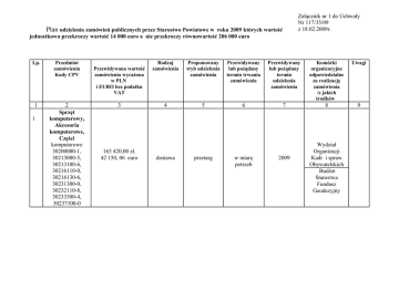 Załącznik nr 1 do Uchwały Nr 117/35/09 z 18.02.2009r. Plan udzielenia zamówień publicznych przez Starostwo Powiatowe w roku 2009 których wartość jednostkowa przekroczy wartość 14 000 euro a nie przekroczy równowartość 206 000 euro Lp. 1 1 Przedmiot zamówienia Kody CPV 2 Sprzęt komputerowy, Akcesoria komputerowe, Części komputerowe 30200000-1, 30213000-5, 30213100-6, 30216110-0, 30216130-6, 30231300-0, 30232110-8, 30233300-4, 30237100-0 Przewidywana wartość zamówienia wyrażona w PLN i EURO bez podatku VAT 3 163 420,00 zł. 42 150, 06 euro Rodzaj zamówienia Proponowany tryb udzielenia zamówienia Przewidywany lub pożądany termin trwania zamówienia Przewidywany lub pożądany termin udzielenia zamówienia Komórki organizacyjne odpowiedzialne za realizację zamówienia /z jakich środków Uwagi 4 5 6 7 8 9 dostawa przetarg w miarę potrzeb 2009 Wydział Organizacji Kadr i spraw Obywatelskich Budżet Starostwa Fundusz Geodezyjny 2 Urządzenia Sieciowe Rutery Sieciowe 32413100-2, 32420000-3 80 300,00 zł 20711,36 euro dostawa przetarg w miarę potrzeb 2009 Wydział Organizacji Kadr i spraw Obywatelskich Budżet Starostwa Fundusz Geodezyjny Wydział Organizacji Kadr i spraw Obywatelskich 3 Oprogramowanie i Systemy Informatyczne 48000000-8 114 000,00 zł 29403,42 euro dostawa przetarg w miarę potrzeb 2009 Budżet Starostwa, Fundusz Geodezyjny Wydział Organizacji Kadr i spraw Obywatelskich 4 Serwery sieciowe 48820000-2 35 000,00 zł. 9027,37 euro dostawa rozpoznanie cenowe I kwartał 2009 Budżet Starostwa Fundusz Geodezyjny 5 Wycena nieruchomości 120 000 zł. 30 950,96 euro usługi przetarg w miarę potrzeb 2009 6 Materiały biurowe i tusze 30192000-1, 30125110-5, 22600000-6 198 000 zł. 51 069,09 euro dostawa przetarg II półrocze 2009 Wydział Geodezji i Gospodarki Gruntami Budżet Starostwa Wydział Organizacji Kadr i spraw Obywatelskich Budżet Starostwa 7 Kserokopiarki, Telefaksy 30121410-0, 30121100-4 8 9 Tablice rejestracyjne 30195000-2 Urządzenia do wykonywania zadań z zakresu Geodezji (globalny system do nawigacji i pozycjonowania GPS) 38112100-4 32 000 zł 8 253,59 euro dostawa rozpoznanie cenowe w miarę potrzeb 2009 Wydział Organizacji Kadr i spraw Obywatelskich Budżet Starostwa 797 862 72 zł. 205 787,53 euro 100 000 zł. 25 792,47euro dostawa dostawa przetarg zapytanie o cenę styczeń 2009 I półrocze 2009 Wydział Komunikacji i Transportu Budżet Starostwa 2009 Wydział Organizacji Kadr i spraw Obywatelskich w porozumieniu z Powiatowym Zakładem Usług Budżet Starostwa ………………………………. ( podpis pracownika sporządzającego) ………………………………………….. ( podpis kierującego komórką organizacyjną ) ……………………………………………. ( podpis osoby akceptującej )