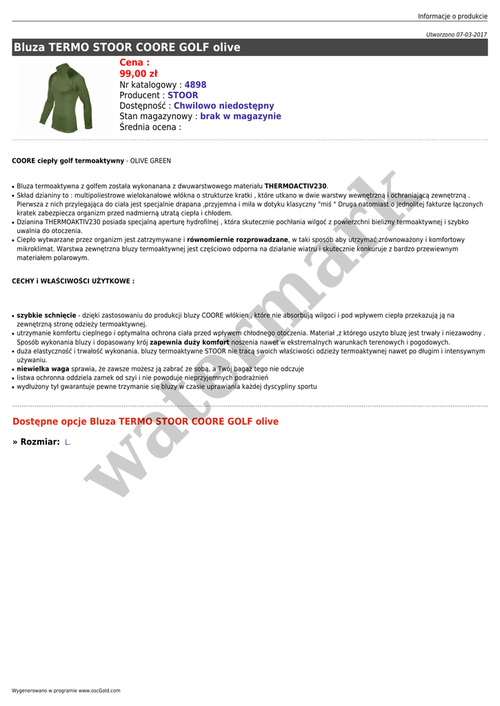 Informacje o produkcie Utworzono 07-03-2017 Bluza TERMO STOOR COORE GOLF olive Cena : 99,00 zł Nr katalogowy : 4898 Producent : STOOR Dostępność : Chwilowo niedostępny Stan magazynowy : brak w magazynie Średnia ocena : COORE ciepły golf termoaktywny - OLIVE GREEN ● ● ● Bluza termoaktywna z golfem została wykonanana z dwuwarstwowego materiału THERMOACTIV230. Skład dzianiny to : multipoliestrowe wielokanałowe włókna o strukturze kratki , które utkano w dwie warstwy wewnętrzną i ochraniającą zewnętrzną . Pierwsza z nich przylegająca do ciała jest specjalnie drapana ,przyjemna i miła w dotyku klasyczny "miś " Druga natomiast o jednolitej fakturze łączonych kratek zabezpiecza organizm przed nadmierną utratą ciepła i chłodem. Dzianina THERMOAKTIV230 posiada specjalną aperturę hydrofilnej , która skutecznie pochłania wilgoć z powierzchni bielizny termoaktywnej i szybko uwalnia do otoczenia. Ciepło wytwarzane przez organizm jest zatrzymywane i równomiernie rozprowadzane, w taki sposób aby utrzymać zrównoważony i komfortowy mikroklimat. Warstwa zewnętrzna bluzy termoaktywnej jest częściowo odporna na działanie wiatru i skutecznie konkuruje z bardzo przewiewnym materiałem polarowym. CECHY i WŁAŚCIWOŚCI UŻYTKOWE : ● ● ● ● ● szybkie schnięcie - dzięki zastosowaniu do produkcji bluzy COORE włókien , które nie absorbują wilgoci i pod wpływem ciepła przekazują ją na zewnętrzną stronę odzieży termoaktywnej. utrzymanie komfortu cieplnego i optymalna ochrona ciała przed wpływem chłodnego otoczenia. Materiał ,z którego uszyto bluzę jest trwały i niezawodny . Sposób wykonania bluzy i dopasowany krój zapewnia duży komfort noszenia nawet w ekstremalnych warunkach terenowych i pogodowych. duża elastyczność i trwałość wykonania. bluzy termoaktywne STOOR nie tracą swoich właściwości odzieży termoaktywnej nawet po długim i intensywnym używaniu. niewielka waga sprawia, że zawsze możesz ją zabrać ze sobą, a Twój bagaż tego nie odczuje listwa ochronna oddziela zamek od szyi i nie powoduje nieprzyjemnych podrażnień wydłużony tył gwarantuje pewne trzymanie się bluzy w czasie uprawiania każdej dyscypliny sportu at ● er m ar k ● Dostępne opcje Bluza TERMO STOOR COORE GOLF olive w » Rozmiar: L. Wygenerowano w programie www.oscGold.com