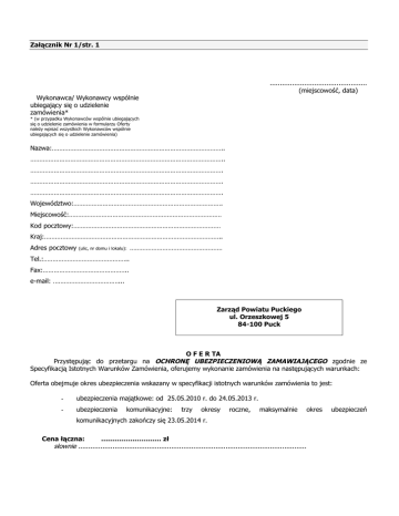 Załącznik Nr 1/str. 1 ................................................ (miejscowość, data) Wykonawca/ Wykonawcy wsp‚lnie ubiegający się o udzielenie zam‚wienia* * (w przypadku Wykonawc‚w wsp‚lnie ubiegających się o udzielenie zam‚wienia w formularzu Oferty należy wpisać wszystkich Wykonawc‚w wsp‚lnie ubiegających się o udzielenie zam‚wienia) Nazwa:………………………………………………………………………………….. …………………………………………………………………………………………….. ……………………………………………………………………………………………. ……………………………………………………………………………………………. ……………………………………………………………………………………………. Wojew‚dztwo:………………………………………………………………………. Miejscowość:………………………………………………………………………… Kod pocztowy:……………………………………………………………………… Kraj:…………………………………………………………………………………….. Adres pocztowy (ulic, nr domu i lokalu): …………………………………………… Tel.:……………………………………….. Fax:……………………………………….. e-mail: ………………………………... Zarząd Powiatu Puckiego ul. Orzeszkowej 5 84-100 Puck O F E R TA Przystępując do przetargu na OCHRONĘ UBEZPIECZENIOWĄ ZAMAWIAJĄCEGO zgodnie ze Specyfikacją Istotnych Warunk‚w Zam‚wienia, oferujemy wykonanie zam‚wienia na następujących warunkach: Oferta obejmuje okres ubezpieczenia wskazany w specyfikacji istotnych warunk‚w zam‚wienia to jest: - ubezpieczenia majątkowe: od 25.05.2010 r. do 24.05.2013 r. - ubezpieczenia komunikacyjne: trzy okresy roczne, maksymalnie komunikacyjnych zakończy się 23.05.2014 r. Cena łączna: ……………………… zł słownie ................................................................................................................. okres ubezpieczeń Załącznik Nr 1/str. 2 Akceptujemy wszystkie klauzule obligatoryjne od nr 1 do 14 oraz następujące klauzule fakultatywne: Nr klauzuli Nazwa klauzuli TAK/NIE Uwagi 15. Klauzula wypłaty odszkodowania 3 pkt. 16. Klauzula automatycznego wyr‚wnania sumy ubezpieczenia 5 pkt. 17. Klauzula rozszerzająca ochronę o konsekwencje opad‚w śniegu 5 pkt. 18. Klauzula miejsca ubezpieczenia 5 pkt. 19. Klauzula zgłaszania szk‚d 5 pkt. 20. Klauzula zaliczki na poczet odszkodowania 3 pkt. 21. Klauzula usunięcia pozostałości po szkodzie 5 pkt. 22. Klauzula składowania 5 pkt. 23. Klauzula funduszu prewencyjnego 10 pkt. 24. Klauzula zabezpieczeń przeciwpożarowych i przeciw kradzieżowych 10 pkt. 25. Klauzula ochrony mienia nie przygotowanego do pracy 5 pkt. 26. Klauzula katastrofy budowlanej 5 pkt. 27. Klauzula zalaniowa 5 pkt. 28. Klauzula ubezpieczenia prac budowlano-montażowych 7 pkt. 29. Klauzula ochrony mienia wyłączonego z eksploatacji 7 pkt. 30. Klauzula ubezpieczenia mienia będącego poza ewidencją 5 pkt. 31. Klauzula transportowania 5 pkt. 32. Klauzula likwidacyjna dotycząca szk‚d powstałych w wyniku kradzieży oraz wandalizmu 5 pkt. Załącznik Nr 1/str. 3 Dotyczy wszystkich części Zam‚wienia: 1. Zobowiązujemy się, w przypadku wyboru naszej oferty, do przedstawienia Zamawiającemu rozbicia składki na poszczeg‚lne jednostki Zamawiającego i ryzyka, przed podpisaniem umowy o udzielenie zam‚wienia publicznego (dotyczy to r‚wnież ubezpieczeń wsp‚lnych). 2. Oświadczamy, że uzyskaliśmy informacje niezbędne do przygotowania oferty i właściwego wykonania zam‚wienia oraz przyjmujemy warunki określone w Specyfikacji Istotnych Warunk‚w Zam‚wienia. 3. Oświadczamy, że jesteśmy związani niniejszą ofertą przez okres 30 dni od daty upływu terminu składania ofert. 4. Oświadczamy, że przyjmujemy wartości podane w Specyfikacji Istotnych Warunk‚w Zam‚wienia jako podstawę do ustalenia wysokości każdego odszkodowania bez odnoszenia ich do wartości nowej danego środka trwałego. 5. Oświadczamy, że zawarte w warunkach umownych SIWZ zaproponowane przez Zamawiającego warunki płatności zostały przez naszą firmę zaakceptowane. 6. Oświadczamy, że akceptujemy treść wzoru umowy o udzielenie zm‚wienia publicznego. 7. Następujące części niniejszego zam‚wienia powierzamy podwykonawcom: L.p. Nazwa części zam‚wienia Uwaga: wypełniają tylko Wykonawcy, kt‚rzy powierzą wykonanie części zam‚wienia podwykonawcom 8. Oświadczamy, że (dotyczy Towarzystw ubezpieczeń Wzajemnych): - w naszym statucie przewidujemy możliwość ubezpieczania os„b nie będących członkami towarzystwa; - Zamawiający (jednostki Zamawiającego) są osobami nie będącymi członkami towarzystwa i nie będą zobowiązane do udziału w pokrywaniu straty towarzystwa przez wnoszenie dodatkowej składki ubezpieczeniowej w całym okresie realizacji zam„wienia, zgodnie z art. 44 ust. 2 Ustawy o działalności ubezpieczeniowej; - składka przypisana Zamawiającemu (jednostkom Zamawiającego) w okresie realizacji zam„wienia mieści się w 10% składki przypisanej towarzystwu przypadającej na osoby nie będące członkami towarzystwa, zgodnie z art. 44 ust. 3 Ustawy o działalności ubezpieczeniowej. 9. Oświadczamy, że: osobą wyznaczoną przez Wykonawcę do informowania przedstawiciela Zamawiającego – Maximus Broker Sp. z o.o. o bieżącym etapie likwidacji szkody jest: ………………………………………………………………………………………………….…………………….…, imię i nazwisko ……………………………………………………………………………………………
