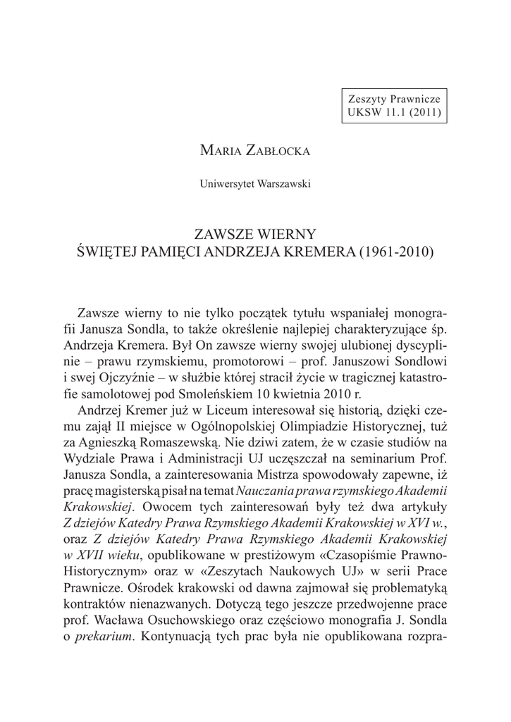 Zeszyty Prawnicze UKSW 11.1 (2011) Maria Zabłocka Uniwersytet Warszawski Zawsze wierny Świętej Pamięci Andrzeja Kremera (1961-2010) Zawsze wierny to nie tylko początek tytułu wspaniałej monografii Janusza Sondla, to także określenie najlepiej charakteryzujące śp. Andrzeja Kremera. Był On zawsze wierny swojej ulubionej dyscyplinie – prawu rzymskiemu, promotorowi – prof. Januszowi Sondlowi i swej Ojczyźnie – w służbie której stracił życie w tragicznej katastrofie samolotowej pod Smoleńskiem 10 kwietnia 2010 r. Andrzej Kremer już w Liceum interesował się historią, dzięki czemu zajął II miejsce w Ogólnopolskiej Olimpiadzie Historycznej, tuż za Agnieszką Romaszewską. Nie dziwi zatem, że w czasie studiów na Wydziale Prawa i Administracji UJ uczęszczał na seminarium Prof. Janusza Sondla, a zainteresowania Mistrza spowodowały zapewne, iż pracę magisterską pisał na temat Nauczania prawa rzymskiego Akademii Krakowskiej. Owocem tych zainteresowań były też dwa artykuły Z dziejów Katedry Prawa Rzymskiego Akademii Krakowskiej w XVI w., oraz Z dziejów Katedry Prawa Rzymskiego Akademii Krakowskiej w XVII wieku, opublikowane w prestiżowym «Czasopiśmie PrawnoHistorycznym» oraz w «Zeszytach Naukowych UJ» w serii Prace Prawnicze. Ośrodek krakowski od dawna zajmował się problematyką kontraktów nienazwanych. Dotyczą tego jeszcze przedwojenne prace prof. Wacława Osuchowskiego oraz częściowo monografia J. Sondla o prekarium. Kontynuacją tych prac była nie opublikowana rozpra- 10 Maria Zabłocka [2] wa doktorska Andrzeja Kremera pt. Kontrakty nienazwane w prawie rzymskim w świetle kazuistyki, Kraków 1991, oraz późniejsze artykuły pogłębiające to zagadnienie: Titus Aristos Ansichten im Bereich der ungenannten Kontrakte; Die Verhältnisse ‘do ut facias’ und ‘facio ut des’ als ausgewählte Beispiele der Innominatkontrakte im klassischen römischen Recht; Wybrane zagadnienia ‘aestimatum’ w prawie klasycznym i Die Anfänge der unbenannten Verträge in Gutachten der Juristen im klassischen römischen Recht. Jeszcze w trakcie studiów w 1983 r. został zatrudniony w Instytucie Historii Prawa, a następnie w Katedrze Prawa Rzymskiego Wydziału Prawa i Administracji UJ. W latach 80. odbył aplikację w Sądzie Wojewódzkim w Krakowie i zdał egzamin sędziowski z wynikiem bardzo dobrym W latach 1988-1990 był stypendystą na uniwersytecie w Getyndze i Salzburgu, a w 1989 r., pracownikiem naukowym Katedry Prawa Rzymskiego na Uniwersytecie w Bochum. Zawsze żywo zainteresowany sprawami politycznymi, po 1989 r. postanowił poświęcić swój czas nie tylko na badania naukowe, ale też na prace dla Ojczyzny. Świetna znajomość języków obcych, nie tylko niemieckiego, angielskiego i włoskiego, ale także np. rosyjskiego, spowodowała, że zaczął pracować w służbach dyplomatycznych. Pracę dyplomatyczną rozpoczął w 1991 r. jako Wicekonsul, potem Konsul w Konsulacie Generalnym RP w Hamburgu, następnie od 1995 r. jako Kierownik Wydziału Konsularnego RP w Bonn, kolejno w randze radcy i radcy ministra pełnomocnego. W 1998 r. został Wicedyrektorem Departamentu Konsularnego i Wychodźstwa, a po reorganizacji Dyrektorem Departamentu Konsularnego MSZ. W 2001 r. został Konsulem Generalnym RP w Hamburgu. W 2005 r. powrócił do pracy w MSZ w Warszawie, gdzie został Ambasadorem tytularnym w służbie zagranicznej i pracował jako Zastępca, a od 2007 r. jako Dyrektor Departamentu Prawno-Traktatowego. W 2008 r. został Wiceministrem Spraw Zagranicznych w randze Podsekretarza Stanu nadzorując, między innymi, służbę konsularną, relacje ze Wschodem oraz sprawy prawno-traktatowe. Negocjował, a później parafował polsko-amerykańskie porozumienie o stacjonowaniu wojsk amerykańskich w Polsce. Brał udział w negocjacjach nad kształtem nowego [3] Zawsze wierny. Świętej pamięci Andrzeja Kremera (1961-2010) 11 traktatu Unii Europejskiej, tzw. Lizbońskiego. Był jednym z autorów programu „Partnerstwa Wschodniego”, który miał na celu zacieśnienie stosunków między Unią Europejską a jej wschodnimi sąsiadami: Armenią, Azerbejdżanem, Białorusią, Gruzją, Mołdawią i Ukrainą. Reanimował też polsko-rosyjską grupę ds. trudnych i przyczynił się do wznowienia dialogu między Polską i Rosją. Brał udział w licznych konferencjach międzynarodowych i seminariach, gdzie wygłaszał referaty, np. w Chińskiej Akademii Nauk (publikowany w języku chińskim). Praktyczna znajomość spraw związanych z dyplomacją owocowała też licznymi artykułami z zakresu prawa dyplomatycznego i konsularnego oraz publicznego prawa międzynarodowego, by wymienić tylko przykładowo: Niektóre aspekty realizacji Traktatu pomiędzy Rzeczypospolita Polską a Republiką Federalną Niemiec z dnia 1991 r.; Zawarcie związku małżeńskiego przed konsulem (wybrane zagadnienia); Udział Polski w Konferencji Międzynarodowej 2007 r. – aspekty prawne; Basic Principles for the Settlement of the Conflicts on the Territories of the GUAM States; Opieka dyplomatyczna i konsularna nad turystą – wybrane aspekty; Prawno-międzynarodowew znaczenie Globalnego Kodeksu Etyki w Turystyce. Brał udział w pracach legislacyjnych nad ustawami o repatriacji, o podpisie elektronicznym, o służbie zagranicznej, w latach 1999-2000 nad ustawą reprywatyzacyjną zawetowaną przez Prezydenta RP, licznymi ustawami wyrażającymi zgodę na ratyfikację przez Prezydenta RP umowy międzynarodowej, nowelizacją ustawy o funkcjach konsulów. Liczne publikacje z szeroko pojętego prawa międzynarodowego pozwalały Mu ubiegać się o habilitację z tego zakresu. Jednak Andrzej Kremer był wierny historii, przygotowywał rozprawę habilitacyjną na temat Piotra Rojzjusza jako przykładu renesansowego romanisty. Opublikował już z tego zakresu artykuły: Decisiones... von Pedro Ruiz de Moros – ein Beispiel der juristischen Literatur in Polen des 16. Jahrhunderts; Pe