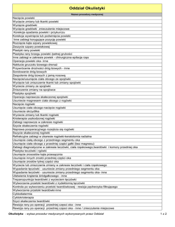 Oddział Okulistyki Nazwa procedury medycznej Nacięcie powieki Wycięcie zmiany lub tkanki powieki Wycięcie gradówki Wycięcie gradówki znieczulenie miejscowe Korekcja opadania powieki i przykurczu Korekcja wywinięcia lub podwinięcia powieki Inne zabiegi korygujące pozycję powieki Rozcięcie kąta szpary powiekowej Zeszycie szpary powiekowej Plastyki rany powieki Plastyka rany brzegu powieki /pełnej grubości Inne zabiegi w zakresie powiek - chirurgiczna epilacja rzęs Operacja powieki oka- inne Nakłucie gruczołu łzowego-drenaż Przywrócenie drożności dróg łzowych - inne Sondowanie dróg łzowych Zespolenie dróg łzowych z jamą nosową Nacięcie/usunięcie ciała obcego ze spojówki Wycięcie lub zniszczenie tkanki lub zmiany spojówki Wyciecie zmiany ze spojówki Zniszczenie zmiany na spojówce Plastyka spojówki Operacja naprawcza skaleczonej spojówki Usuniecie magnesem ciała obcego z rogówki Nacięcie rogówki Usunięcie ciała obcego-nacięcie rogówki Usuniecie skrzydlika Wyciecie zmiany lub tkanki rogówki Krioterapia uszkodzonej rogówki Zabiegi naprawcze w zakresie rogówki Szycie skaleczenia rogówki Naprawa pooperacyjnego rozejścia się rogówki Sszycie skaleczonej rogówki Refrakcyjne zabiegi w zkaresie rogówki-keratotomia radialna Usunięcie ciałą obcego z przedniego segmentu oka Usunięcie ciała obcego z przedniej cząści gałki (bez magnesu) Zabiegi diagnostyczne w zakresie teczówki, ciała rzęskowego,twardówki i komory przedniej oka Plastyka teczówki i rgówki Usunięcie zrosostów kąta przesącznia Usunięcie innych zrostó przedniej części oka Usunięcie zrostów tylnej części oka Wyciecie lub zniszczenie zmiany w zakresie teczówki i ciała rzęskowego Wypadanie tęczówki - usuniecie zmiany przedniego segmentu oka Wypadanie teczówki - usuniecie zmiany przedniego segmentu oka- inne Ułatwienie krążenia śródgałkowego - inne Trepanopunkcja twardówki z wycieciem tęczówki Wytworzenie przetoki twardówki z irydektomią tęczówki Kontrola po wytworzeniu przetoki twardówkowej - rewizja pęcherzyka filtrującego Wytworzenie przetoki twardówki-inne Cyklodiatermia Cyklokrioterapia Szyci skaleczenia twardówki Rewizja rany po operacji przedniej częsci oka - inne Rewizja rany po operacji przedniej częsci oka - inne / znieczulenie miejscowe Okulistyka - wykaz procedur medycznych wykonywanych przez Oddział 1z2 Usunięcie zmiany twardówki Opercja twardówki - inne Lecznicze opróznienie komory przedniej oka Krioekstrakcja soczewki Zewnątrztorebkowe usunięcie soczewki przez prostą aspirację i wypłukanie Wypłukanie urazowej zaćmy Zewnątrztorebkowe usunięcie soczewki przez rozdrobnienie i aspirację Przecięcie wtórnej błony po zaćmie Rozdrobnienie wtórnej błony po zaćmie Wyciecie wtórnej błony ( po zaćmie)-kapsulektomia wprowadzenie sztucznej soczewki do oka afakijnego Wszczep soczewki przy usunięciu zaćmy-soczewka zwykła Wszczep soczewki przy usunięciu zaćmy-soczewka zwijana Usunięcie wszczepionej soczewki Operacje soczewki - inne Usunięcie ciałą obcego z tylnego segmentu oka (magnesem) Zniszczenie zmiany naczyniówki/siatkówki krioterapia Rozerwanie siatkówki - diatermia Rozerwanie siatkówki - krioterapia Podanie gazu do komory ciała szklistego Zabiegi naprawcze siatkówki z klamrowaniem twardówki wszczepem Klamrowanie twardóki z wszczepem Inne zabiegi naprawcze ( głobienie i plomby) Usuniecie wszczepionego materiału z tylnej części oka Usuniecie ciałą szklistego z dostępu przedniego. Usunięcie ciała szklistego z wymianą Mechaniczan Vitrektomia-inne Wzmocnienie twardówki - inne - skleroplastyka Zabiegi diagnostyczne w zakresie mięśni i ściegien okołoruchowych Cofnięcie jednego mięśnia okołoruchowego Skrócenie jednego mięśnia okołoruchowego Operacje więcej niż jednego mięśnia okołoruchowego Kontrola po zabiegu na mięsniu okołoruchowym Opracja mięśni/ścięgien okołoruchowych - inne Wypatroszenie oczodołu- inne Enukleacja Enukleacja - inne Kontrola oczodołu po enukleacji - inne Zaopatrzenie urazu gałki ocznej i oczodołu Zaopatrzenie gałki ocznej ( zabieg naprawczy wiele struktur oka) Usunięcie ciała obcego wklinowanego do twardówki - bez nacięcia Okulistyka - wykaz procedur medycznych wykonywanych przez Oddział 2z2