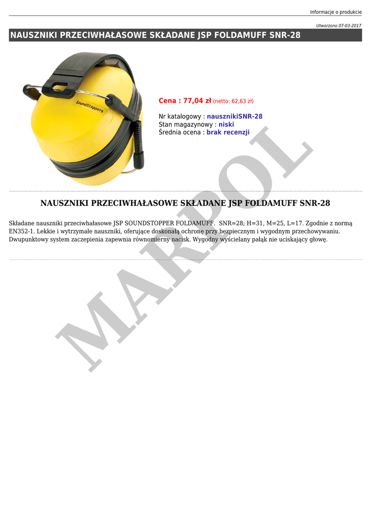 Informacje o produkcie Utworzono 07-03-2017 NAUSZNIKI PRZECIWHAŁASOWE SKŁADANE JSP FOLDAMUFF SNR-28 Cena : 77,04 zł (netto: 62,63 zł) PO L Nr katalogowy : nausznikiSNR-28 Stan magazynowy : niski Średnia ocena : brak recenzji NAUSZNIKI PRZECIWHAŁASOWE SKŁADANE JSP FOLDAMUFF SNR-28 M AR Składane nauszniki przeciwhałasowe JSP SOUNDSTOPPER FOLDAMUFF. SNR=28; H=31, M=25, L=17. Zgodnie z normą EN352-1. Lekkie i wytrzymałe nauszniki, oferujące doskonałą ochronę przy bezpiecznym i wygodnym przechowywaniu. Dwupunktowy system zaczepienia zapewnia równomierny nacisk. Wygodny wyścielany pałąk nie uciskający głowę.