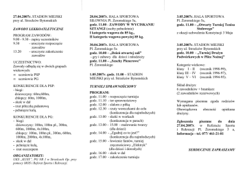 27.04.2007r. STADION MIEJSKI przy ul. Strzelców Bytomskich ZAWODY LEKKOATLETYCZNE PROGRAM ZAWODÓW: 9.00 - 9.30 - zapisy uczestników 9.30 - uroczyste rozpoczęcie zawodów 13.20 - uroczyste zakończenie zawodów UCZESTNICTWO: Zawody odbędą się w dwóch grupach wiekowych: • uczniowie PSP • uczniowie PG KONKURENCJE DLA PSP: - biegi: dziewczyny: 60m,600m, chłopcy: 60m, 1000m, - skok w dal - rzut piłeczką palantową - pchnięcie kulą. KONKURENCJE DLA PG: - biegi: dziewczyny: 100m, 100m pł., 300m, 600m, 1000m, 4x100m, chłopcy: 100m, 100m pł., 300m, 600m, 1000m, 2000m, 4x100m, - skok w dal - pchnięcie kulą, - rzut oszczepem ORGANIZATORZY: UKS „KUSY”, PG NR 1 w Strzelcach Op. przy pomocy MOS i Referat Sportu i Rekreacji. 28.04.2007r. HALA SPORTOWA SIŁOWNIA Pl. śeromskiego 5a, godz. 11.00 - ZAWODY W WYCISKANIU SZTANGI (osoby pełnoletnie) I kategoria wagowa do 85 kg., II kategoria wagowa powyŜej 85 kg. 3.05.2007r. HALA SPORTOWA Pl. śeromskiego 5a, godz. 11.00 – „Otwarty Turniej Tenisa Stołowego” z okazji uchwalenia Konstytucji 3 Maja 30.04.2007r. HALA SPORTOWA Pl. śeromskiego 5a godz. 10.00 – „Dzień otwartej sali” - gry i zabawy dla dzieci i młodzieŜy godz. 11.00 – „Szachy Plenerowe” Pl. śeromskiego 3.05.2007r. STADION MIEJSKI przy ul. Strzelców Bytomskich godz. 10.00 - „Turniej DruŜyn Podwórkowych w Piłce NoŜnej” 1.05.2007r. godz. 11.00 – STADION MIEJSKI przy ul. Strzelców Bytomskich TURNIEJ SPRAWNOŚCIOWY PROGRAM: godz. 11.00 - rozpoczęcie turnieju godz. 11.10 - tor sprawnościowy godz. 12.00 - slalom z piłką godz. 12.30 - rzuty woreczkami do celu (konkurencja dla najmłodszych) godz. 13.00 - skoki w workach (konkurencja w parach) godz. 13.00 – 15.00 - malowanie twarzy (dla dzieci) godz. 14.00 - „Zgadnij co to jest?” (konkurencja dla najmłodszych) godz. 15.00 - łowienie fantów, turniej zręcznościowy „Elektryk” (dla dzieci i dorosłych) godz. 16.00 - skok w dal godz. 17.00 - zakończenie turnieju Kategorie wiekowe: klasy I – II (rocznik 1998-99), klasy III – IV (rocznik 1996-97), klasy V – VI (rocznik 1994-95). Skład druŜyn: 6 zawodników + bramkarz (2 zawodników rezerwowych) Wymagana pisemna zgoda rodziców lub opiekunów. Obowiązkowa obecność opiekuna druŜyny. Zgłoszenia pisemne do dnia 27.04.2007r. w Referacie Sportu i Rekreacji Pl. śeromskiego 5 a, Informacje - tel. 077/ 461-21-81 SERDECZNIE ZAPRASZAMY