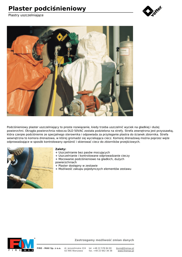 Plaster podciśnieniowy Plastry uszczelniające Podciśnieniowy plaster uszczelniający to proste rozwiązanie, kiedy trzeba uszczelnić wyciek na gładkiej i dużej powierzchni. Okrągła powierzchnia robocza DLD 50VAC została podzielona na strefy. Strefa zewnętrzna jest przyssawką, która czerpie podciśnienie ze specjalnego sterownika i odpowiada za przyleganie plastra do ścianek zbiornika. Strefa wewnętrzna to komora drenażowa, w której gromadzi się wyciekająca ciecz. Komorę drenażową można poprzez węże odprowadzające w sposób kontrolowany opróżnić i skierować ciecz do zbiorników przejściowych. Zalety: + Uszczelnianie bez pasów mocujących + Uszczelnianie i kontrolowane odprowadzanie cieczy + Mocowanie podciśnieniowe na gładkich, dużych powierzchniach + Plaster dostępny w zestawie + Możliwość zakupu pojedynczych elementów zestawu Zastrzegamy możliwość zmian danych FIRE - MAX Sp. z o.o. Al. Jerozolimskie 224 02-495 Warszawa tel. +48 22 578 84 00 fax. +48 22 662 38 38 [email protected] www.firemax.pl Plaster podciśnieniowy Plastry uszczelniające Zestaw DLD 50 VAC, nr kat. 1500019700 skład zestawu: + plaster podciśnieniowy typ DLD 50 VAC + wąż odprowadzający kwasoodporny 5 m, złączka V4A + zawór odcinający typ D, stal szlachetna + waliza Zastrzegamy możliwość zmian danych FIRE - MAX Sp. z o.o. Al. Jerozolimskie 224 02-495 Warszawa tel. +48 22 578 84 00 fax. +48 22 662 38 38 [email protected] www.firemax.pl Plaster podciśnieniowy Plastry uszczelniające Dane techniczne DLD 50 VAC Wymiary plastra Ø 50cm Wymiar komory drenażowej Ø 20 cm Ciśnienie robocze wytwarzania próżni 6 bar Podciśnienie 0,45 bar Zapotrzebowanie powietrza 200 l/min Waga plastra 5,2 kg Zastrzegamy możliwość zmian danych FIRE - MAX Sp. z o.o. Al. Jerozolimskie 224 02-495 Warszawa tel. +48 22 578 84 00 fax. +48 22 662 38 38 [email protected] www.firemax.pl