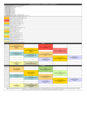 | STUDIA ZAOCZNE 2016/2017 | 1 ROK. SEMESTR 1 | 2 ROK. SEMESTR 3 | • • • • • • • • • • • • 05 października 2016. Inauguracja roku akademickiego 07 października 2016. Spotkanie organizacyjne 08-09.10.2016. zjazd pierwszy 22-23.10.2016. zjazd drugi 05-06.11.2016. zjazd trzeci 19-20.11.2016. zjazd czwarty 03-04.12.2016. zjazd piąty 17-18.12.2016. zjazd szósty 14-15.01.2017. zjazd siódmy 28-29.01.2017. zjazd ósmy 11-12.02.2017. zjazd dziewiąty – sesja egzaminacyjna 25-26.02.2017. sesja poprawkowa, zakończenie semestru pierwszego Grafika projektowa i komunikacja wizualna | 1 rok Grafika projektowa i komunikacja wizualna | 2 rok Malarstwo i kreacja artystyczna | 1 rok Malarstwo i kreacja artystyczna | 2 rok Grafika interaktywna i multimedia | 1 rok Grafika interaktywna i multimedia | 2 rok Projektowanie krojów pism | 2 rok Fotografia kreacyjna | 1 rok Analiza filmoznawcza i film animowany | 1 rok Konserwatorium lekturowe | 2 rok Grafika warsztatowa | 1 rok Grafika warsztatowa | 2 rok Rysunek i narracja rysunkowa | 1 rok Rysunek i narracja rysunkowa | 2 rok Ilustracja i grafika wydawnicża | 1 rok Ilustracja i grafika wydawnicża | 1 rok Typografia kinetyczna | 1 rok Obraz cyfrowy i wideomapowanie | 2 rok Antropologia sztuki | 1 rok Projektowanie i obrazowanie nowoczesności SOBOTA 08.30-09.15 09.30-10.15 10.30-11.15 1 Rok. Specjalizacja 2 Rok Grafika projektowa i komunikacja wizualna Malarstwo i kreacja artystyczna H. Gostyński A. Nowaczyk 2 Rok. Specjalizacja Grafika projektowa i komunikacja 11.30-12.15 12.30-13.15 2 Rok. Grupa 1 13.30-14.15 Projektowanie krojów pism M. Machalski 1 Rok Malarstwo i kreacja artystyczna wizualna A. Nowaczyk 2 Rok. Grupa 2 Projektowanie krojów pism M. Machalski 14.15-15.00 H. Gostyński 1 Rok. Specjalizacja Grafika interaktywna i multimedia P. Welk 1 Rok. Grupa 1 2 Rok. Specjalizacja 15.15-16.00 1 Rok. Grupa 2 Fotografia kreacyjna M. Filipowicz 16.15-17.00 17.15-18.00 18.15-19.00 Grafika interaktywna i multimedia P. Welk Fotografia kreacyjna M. Filipowicz 1 Rok Analiza filmoznawcza i film 2 Rok animowany A. Trwoga Konserwatorium lekturowe NIEDZIELA 08.30-09.15 09.30-10.15 1 Rok. Specjalizacja 2 Rok Grafika warsztatowa P. Smolnicki Rysunek i narracja rysunkowa R. Kochański 10.30-11.15 11.30-12.15 12.30-13.15 2 Rok. Grupa 1 Obraz cyfrowy i wideomapowanie 13.30-14.15 R. Forowicz 2 Rok. Specjalizacja 1 Rok Grafika warsztatowa Rysunek i narracja rysunkowa P. Smolnicki R. Kochański 2 Rok. Grupa 2 Obraz cyfrowy i wideomapowanie 1 Rok. Specjalizacja Ilustracja i grafika wydawnicza B. Ostoja Lniski R. Forowicz 14.15-15.00 1 Rok. Grupa 1 2 Rok. Specjalizacja 15.15-16.00 1 Rok. Grupa 2 16.15-17.00 Typografia kinetyczna A. Dudek 17.15-18.00 1 Rok Antropologia sztuki 18.15-19.00 K. Urbańska Ilustracja i grafika wydawnicza B. Ostoja Lniski Typografia kinetyczna A. Dudek 2 Rok Projektowanie i obrazowanie nowoczesności B. Deptuła Student studiów stacjonarnych (III-IV rok) i niestacjonarnych (I-II rok studiów magisterskich oraz I-II rok studiów magisterskich w trybie zaocznym) Wydziału Grafiki ma prawo uczestniczyć z organizowanych przez Wydział zajęciach fakultatywnych. Odbywają się one wg poniższego planu i nie są punktowane punktami ECTS. O ilości studentów uczęszczających na zjęcia decyduje ich prowadzący mając na uwadze liczbę studentów i możliwości techniczno-warsztatowe pracowni. Studenci chętni do udziału w zajęciach zapisują się na nie bezpośrednio u prowadzącego.