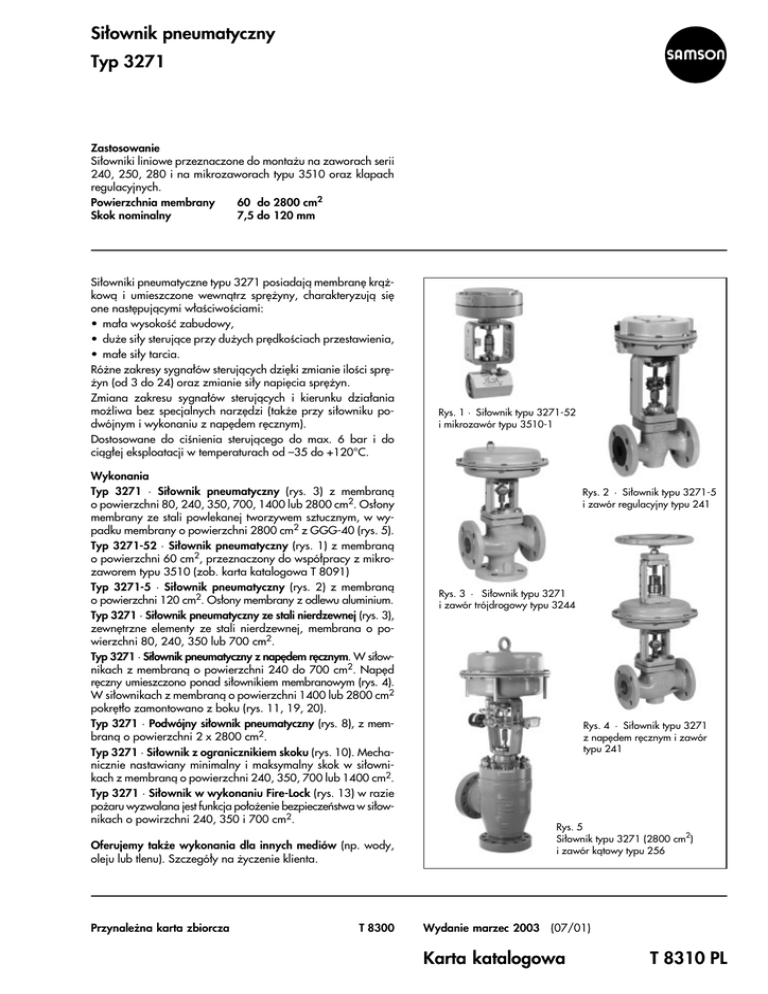 Si³ownik pneumatyczny Typ 3271 Zastosowanie Si³owniki liniowe przeznaczone do monta¿u na zaworach serii 240, 250, 280 i na mikrozaworach typu 3510 oraz klapach regulacyjnych. Powierzchnia membrany 60 do 2800 cm2 Skok nominalny 7,5 do 120 mm Si³owniki pneumatyczne typu 3271 posiadaj¹ membranê kr¹¿kow¹ i umieszczone wewn¹trz sprê¿yny, charakteryzuj¹ siê one nastêpuj¹cymi w³aœciwoœciami: ¢ ma³a wysokoœæ zabudowy, ¢ du¿e si³y steruj¹ce przy du¿ych prêdkoœciach przestawienia, ¢ ma³e si³y tarcia. Ró¿ne zakresy sygna³ów steruj¹cych dziêki zmianie iloœci sprê¿yn (od 3 do 24) oraz zmianie si³y napiêcia sprê¿yn. Zmiana zakresu sygna³ów steruj¹cych i kierunku dzia³ania mo¿liwa bez specjalnych narzêdzi (tak¿e przy si³owniku podwójnym i wykonaniu z napêdem rêcznym). Dostosowane do ciœnienia steruj¹cego do max. 6 bar i do ci¹g³ej eksploatacji w temperaturach od –35 do +120°C. Wykonania Typ 3271 · Si³ownik pneumatyczny (rys. 3) z membran¹ o powierzchni 80, 240, 350, 700, 1400 lub 2800 cm2. Os³ony membrany ze stali powlekanej tworzywem sztucznym, w wypadku membrany o powierzchni 2800 cm2 z GGG-40 (rys. 5). Typ 3271-52 · Si³ownik pneumatyczny (rys. 1) z membran¹ o powierzchni 60 cm2, przeznaczony do wspó³pracy z mikrozaworem typu 3510 (zob. karta katalogowa T 8091) Typ 3271-5 · Si³ownik pneumatyczny (rys. 2) z membran¹ o powierzchni 120 cm2. Os³ony membrany z odlewu aluminium. Typ 3271 · Si³ownik pneumatyczny ze stali nierdzewnej (rys. 3), zewnêtrzne elementy ze stali nierdzewnej, membrana o powierzchni 80, 240, 350 lub 700 cm2. Typ 3271 · Si³ownik pneumatyczny z napêdem rêcznym. W si³ownikach z membran¹ o powierzchni 240 do 700 cm2. Napêd rêczny umieszczono ponad si³ownikiem membranowym (rys. 4). W si³ownikach z membran¹ o powierzchni 1400 lub 2800 cm2 pokrêt³o zamontowano z boku (rys. 11, 19, 20). Typ 3271 · Podwójny si³ownik pneumatyczny (rys. 8), z membran¹ o powierzchni 2 x 2800 cm2. Typ 3271 · Si³ownik z ogranicznikiem skoku (rys. 10). Mechanicznie nastawiany minimalny i maksymalny skok w si³ownikach z membran¹ o powierzchni 240, 350, 700 lub 1400 cm2. Typ 3271 · Si³ownik w wykonaniu Fire-Lock (rys. 13) w razie po¿aru wyzwalana jest funkcja po³o¿enie bezpieczeñstwa w si³ownikach o powirzchni 240, 350 i 700 cm2. Oferujemy tak¿e wykonania dla innych mediów (np. wody, oleju lub tlenu). Szczegó³y na ¿yczenie klienta. Przynale¿na karta zbiorcza T 8300 Rys. 1 · Si³ownik typu 3271-52 i mikrozawór typu 3510-1 Rys. 2 · Si³ownik typu 3271-5 i zawór regulacyjny typu 241 Rys. 3 · Si³ownik typu 3271 i zawór trójdrogowy typu 3244 Rys. 4 · Si³ownik typu 3271 z napêdem rêcznym i zawór typu 241 Rys. 5 Si³ownik typu 3271 (2800 cm2) i zawór k¹towy typu 256 Wydanie marzec 2003 (07/01) Karta katalogowa T 8310 PL Sposób dzia³ania Ciœnienie steruj¹ce pst wytwarza na powierzchni membrany A (2) si³ê F = pst · A przeciwdzia³aj¹c¹ sile napiêcia sprê¿yn (4). Liczba i si³a napiêcia wstêpnego sprê¿yn okreœla zakres sygna³u steruj¹cego przy uwzglêdnieniu skoku nominalnego. Skok H jest proporcjonalny do ciœnienia steruj¹cego pst. Kierunek dzia³ania trzpienia si³ownika (7) zale¿y od po³o¿enia monta¿owego sprê¿yn i przy³¹cza ciœnienia steruj¹cego. Trzpieñ si³ownika (7) po³¹czony jest z trzpieniem grzyba (V6) zaworu regulacyjnego lub nawrotnic¹ innego zaworu za pomoc¹ sprzêg³a (8). Po zamontowaniu si³ownika na zaworze za pomoc¹ nakrêtki sprzêg³a (V 6.1) mo¿na dodatkowo ustawiæ napiêcie sprê¿yn (patrz tab. 2). Rys. 9 przedstawia przekrój si³ownika z napêdem rêcznym umieszczonym u góry dla powierzchni 240 do 700 cm2. Podczas pracy nominalnej trzpienie si³ownika (7 i 12) i gwintowany trzpieñ (10) nie s¹ ze sob¹ po³¹czone. Po zdjêciu nakrêtki kontruj¹cej (11) mo¿liwe jest rêczne ustawienie zaworu. Rys. 11 przedstawia sposób dzia³ania zamontowanego z boku pokrêt³a do napêdu rêcznego dla si³owników z membran¹ o powierzchni 1400 i 2800 cm2 i skoku maksymalnym do 80 mm. Pokrêt³o nastawy rêcznej (23) po³¹czone jest na sta³e ze œlimacznic¹ (20) mocowan¹ na zatrzask i porusza trzpieñ si³ownika za pomoc¹ ko³a œlimakowego (21) i tulei gwintowanej (22). W wyposa¿eniu zaworów o skoku 120 mm i si³owników z membran¹ o powierzchni 2800 cm2 znajduje siê montowane z boku pokrêt³o nastawy rêcznej przedstawione na rys. 20. Si³owniki z membran¹ o powierzchni 240 do 1400 cm2 mo¿na wyposa¿yæ w ogranicznik skoku (rys. 10) zmniejszaj¹cy skok o max. 50% w obu kierunkach (trzpieñ si³ownika wysuwany na zewn¹trz i trzpieñ si³ownika wci¹gany do wewn¹trz) i ustawienie go na sta³e. Si³ownik podwójny (rys. 8) wyposa¿ony jest w dwie po³¹czone ze sob¹ membrany, dziêki czemu si³a nastawcza jest dwa razy wiêksza od si³y wytwarzanej w standardowym si³owniku (rys. 6). W wykonaniu Fire-Lock (rys. 13) zawór przechodzi w po³o¿enie bezpieczeñstwa za pomoc¹ zamontowanych w si³owniku wk³adek, które ekspanduj¹ w wypadku po¿aru. Si³owniki przyjmuj¹ nastêpuj¹ce po³o¿enia bezpieczeñstwa: "Trzpieñ si³ownika wysuwany na zewn¹trz", w wypadku odci¹¿enia ciœnieniowego membrany lub zaniku ciœnienia steruj¹cego si³a napiêcia sprê¿yn przesuwa trzpieñ si³ownika w dó³ (na przekrojach przedstawiony z prawej strony) "Trzpieñ si³ownika wci¹gany do wewn¹trz", w wypadku odci¹¿enia ciœnieniowego membrany lub zaniku ciœnienia steruj¹cego si³a napiêcia sprê¿yn przesuwa trzpieñ si³ownika w górê (na przekrojach przedstawiony z lewej strony) Legenda do rys. 6 do 11 1 2 3 4 5 6 7 8 10 11 2 przy³¹cze ciœnienia steruj¹cego membrana œruba odpowietrzaj¹ca sprê¿yny os³ona membrany nakrêtka oczkowa trzpieñ si³ownika sprzêg³o ze wskaŸnikiem skoku pokrêt³o z gwintowanym trzpieniem nakrêtka kontruj¹ca 12 trzpieñ si³ownika napêdu rêcznego 14 ko³pak 15 nakrêtka 16 trzpieñ 17 ³o¿ysko 
