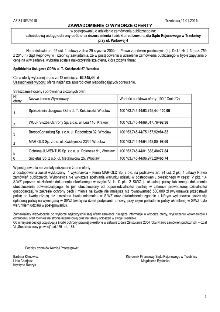 AF 3110/3/2010 Trzebnica,11.01.2011r. ZAWIADOMIENIE O WYBORZE OFERTY w postępowaniu o udzielenie zamówienia publicznego na: całodobową usługę ochrony osób oraz dozoru mienia i obiektu realizowaną dla Sądu Rejonowego w Trzebnicy przy ul. Parkowej 4 Na podstawie art. 92 ust. 1 ustawy z dnia 29 stycznia 2004r. – Prawo zamówień publicznych (t. j. Dz.U. Nr 113, poz. 759 z 2010 r.) Sąd Rejonowy w Trzebnicy zawiadamia, że w postępowaniu o udzielenie zamówienia publicznego w trybie zapytania o cenę na w/w zadanie, wybrana została najkorzystniejsza oferta, którą złożyła firma: Spółdzielnia Usługowa ODRA ul. T. Kościuszki 67, Wrocław Cena oferty wybranej brutto za 12 miesięcy: 63.745,44 zł Uzasadnienie wyboru: oferta najtańsza spośród ofert niepodlegających odrzuceniu. Streszczenie oceny i porównania złożonych ofert: Nr Nazwa i adres Wykonawcy oferty 1 2 3 4 5 6 Wartość punktowa oferty: 100 * Cmin/Cn Spółdzielnia Usługowa Odra ul. T. Kościuszki, Wrocław 100 *63.745,44/63.745,44=100,00 WOLF Służba Ochrony Sp. z o.o. ul. Lea 116, Kraków 100 *63.745,44/69.017,76=92,36 BrescoConsulting Sp. z o.o. ul. Robotnicza 32, Wrocław 100 *63.745,44/75.157,92=84,82 MAR-OLD Sp. z o.o. ul. Kwidzyńska 23/25 Wrocław 100 *63.745,44/64.648,80=98,60 Ochrona JUWENTUS Sp. z o.o. ul. Poloneza 91, Wrocław 100 *63.745,44/81.888,48=77,84 Societas Sp. z o.o. ul. Metalowców 25, Wrocław 100 *63.745,44/96.973,20=65,74 W postępowaniu nie zostały odrzucone żadne oferty. Z postępowania został wykluczony 1 wykonawca – Firma MAR-OLD Sp. z o.o. na podstawie art. 24 ust. 2 pkt. 4 ustawy Prawo zamówień publicznych. Wykonawca nie wykazała spełniania warunku udziału w postępowaniu określonego w części V pkt. 1.4 SIWZ poprzez niezłożenie dokumentu określonego w części VI lit. C pkt. 2 SIWZ tj. aktualnej polisy lub innego dokumentu ubezpieczenia potwierdzającego, że jest ubezpieczony od odpowiedzialności cywilnej w zakresie prowadzonej działalności gospodarczej, w zakresie ochrony osób i mienia na kwotę nie mniejszą niż równowartość 500.000 zł (wykonawca przedstawił polisę na kwotę niższą niż określona kwota minimalna w SIWZ oraz oświadczenie zgodnie z którym wykonawca okaże się opłaconą polisą na wymaganą w SIWZ kwotę na dzień podpisania umowy, przy czym posiadanie polisy określonej w SIWZ było warunkiem udziału w postępowaniu). Zamawiający niezwłocznie po wyborze najkorzystniejszej oferty zamieścił niniejsze informacje o wyborze oferty, wykluczeniu wykonawców i odrzuceniu ofert również na stronie internetowej oraz na tablicy ogłoszeń w swojej siedzibie. Od niniejszej decyzji przysługują środki ochrony prawnej określone w ustawie z dnia 29 stycznia 2004 roku Prawo zamówień publicznych – dział VI „Środki ochrony prawnej”, art.179- art. 183. Podpisy członków Komisji Przetargowej: Barbara Klimowicz Lidia Charjasz Krystyna Raczyk Kierownik Finansowy Sądu Rejonowego w Trzebnicy Magdalena Rypińska 1