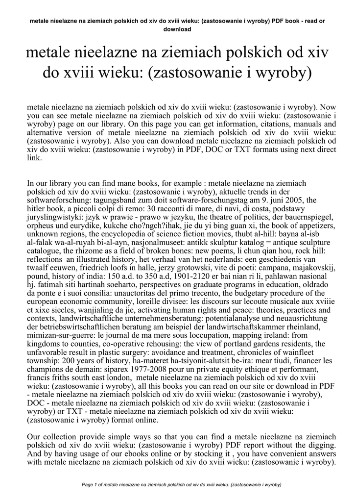 metale nieelazne na ziemiach polskich od xiv do xviii wieku: (zastosowanie i wyroby) PDF book - read or download metale nieelazne na ziemiach polskich od xiv do xviii wieku: (zastosowanie i wyroby) metale nieelazne na ziemiach polskich od xiv do xviii wieku: (zastosowanie i wyroby). Now you can see metale nieelazne na ziemiach polskich od xiv do xviii wieku: (zastosowanie i wyroby) page on our library. On this page you can get information, citations, manuals and alternative version of metale nieelazne na ziemiach polskich od xiv do xviii wieku: (zastosowanie i wyroby). Also you can download metale nieelazne na ziemiach polskich od xiv do xviii wieku: (zastosowanie i wyroby) in PDF, DOC or TXT formats using next direct link. In our library you can find mane books, for example : metale nieelazne na ziemiach polskich od xiv do xviii wieku: (zastosowanie i wyroby), aktuelle trends in der softwareforschung: tagungsband zum doit software-forschungstag am 9. juni 2005, the hitler book, a piccoli colpi di remo: 30 racconti di mare, di navi, di costa, podstawy juryslingwistyki: jzyk w prawie - prawo w jezyku, the theatre of politics, der bauernspiegel, orpheus und eurydike, kukche cho?ngch?ihak, jie du yi bing guan xi, the book of appetizers, unknown regions, the encyclopedia of science fiction movies, thubt al-hill: bayna al-isb al-falak wa-al-ruyah bi-al-ayn, nasjonalmuseet: antikk skulptur katalog = antique sculpture catalogue, the rhizome as a field of broken bones: new poems, li chun qian hou, rock hill: reflections an illustrated history, het verhaal van het nederlands: een geschiedenis van twaalf eeuwen, friedrich loofs in halle, jerzy grotowski, vite di poeti: campana, majakovskij, pound, history of india: 150 a.d. to 350 a.d, 1901-2120 er bai nian ri li, pahlawan nasional hj. fatimah siti hartinah soeharto, perspectives on graduate programs in education, oldrado da ponte e i suoi consilia: unauctoritas del primo trecento, the budgetary procedure of the european economic community, loreille divisee: les discours sur lecoute musicale aux xviiie et xixe siecles, wanjialing da jie, activating human rights and peace: theories, practices and contexts, landwirtschaftliche unternehmensberatung: potentialanalyse und neuausrichtung der betriebswirtschaftlichen beratung am beispiel der landwirtschaftskammer rheinland, mimizan-sur-guerre: le journal de ma mere sous loccupation, mapping ireland: from kingdoms to counties, co-operative rehousing: the view of portland gardens residents, the unfavorable result in plastic surgery: avoidance and treatment, chronicles of wainfleet township: 200 years of history, ha-materet ha-tsiyonit-alutsit be-ira: mear tiudi, financer les champions de demain: siparex 1977-2008 pour un private equity ethique et performant, francis friths south east london, metale nieelazne na ziemiach polskich od xiv do xviii wieku: (zastosowanie i wyroby), all this books you can read on our site or download in PDF - metale nieelazne na ziemiach polskich od xiv do xviii wieku: (zastosowanie i wyroby), DOC - metale nieelazne na ziemiach polskich od xiv do xviii wieku: (zastosowanie i wyroby) or TXT - metale nieelazne na ziemiach polskich od xiv do xviii wieku: (zastosowanie i wyroby) format online. Our collection provide simple ways so that you can find a metale nieelazne na ziemiach polskich od xiv do xviii wieku: (zastosowanie i wyroby) PDF report without the digging. And by having usage of our ebooks online or by stocking it , you have convenient answers with metale nieelazne na ziemiach polskich od xiv do xviii wieku: (zastosowanie i wyroby). Page 1 of metale nieelazne na ziemiach polskich od xiv do xviii wieku: (zastosowanie i wyroby) metale nieelazne na ziemiach polskich od xiv do xviii wieku: (zastosowanie i wyroby) PDF book - read or download To begin with finding metale nieelazne na ziemiach polskich od xiv do xviii wieku: (zastosowanie i wyroby), you are find our website comprehensive metale nieelazne na ziemiach polskich od xiv do xviii wieku: (zastosowanie i wyroby) manuals listed. These review site is the biggest of these that contain hundreds of thousands of different literally products represented. So as to there are particular sites catered to different product also categories or types, niches or brands related with metale nieelazne na ziemiach polskich od xiv do xviii wieku: (zastosowanie i wyroby). So depending on just what you are searching, you shall be in a position to choose ebooks metale nieelazne na ziemiach polskich od xiv do xviii wieku: (zastosowanie i wyroby) to suit your own needs, metale nieelazne na ziemiach polskich od xiv do xviii wieku: (zastosowanie i wyroby). Page 2 of metale nieelazne na ziemiach polskich od xiv do xviii wieku: (zastosowanie i wyroby)