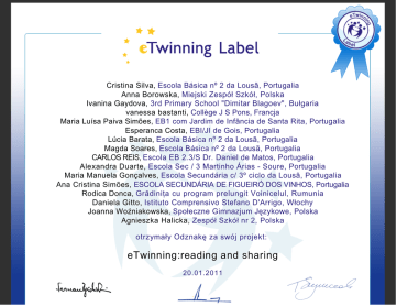 Cristina Silva, Escola Básica nº 2 da Lousã, Portugalia Anna Borowska, Miejski Zespół Szkół, Polska Ivanina Gaydova, 3rd Primary School "Dimitar Blagoev", Bułgaria vanessa bastanti, Collège J S Pons, Francja Maria Luísa Paiva Simões, EB1 com Jardim de Infância de Santa Rita, Portugalia Esperanca Costa, EBI/JI de Gois, Portugalia Lúcia Barata, Escola Básica nº 2 da Lousã, Portugalia Magda Soares, Escola Básica nº 2 da Lousã, Portugalia CARLOS REIS, Escola EB 2.3/S Dr. Daniel de Matos, Portugalia Alexandra Duarte, Escola Sec / 3 Martinho Árias - Soure, Portugalia Maria Manuela Gonçalves, Escola Secundária c/ 3º ciclo da Lousã, Portugalia Ana Cristina Simões, ESCOLA SECUNDÁRIA DE FIGUEIRÓ DOS VINHOS, Portugalia Rodica Donca, Grădiniţa cu program prelungit Voinicelul, Rumunia Daniela Gitto, Istituto Comprensivo Stefano D'Arrigo, Włochy Joanna Woźniakowska, Społeczne Gimnazjum Językowe, Polska Agnieszka Halicka, Zespół Szkół nr 2, Polska otrzymały Odznakę za swój projekt: eTwinning:reading and sharing 20.01.2011 Fernando Egídio Reis Narodowe Biuro Akcji eTwinning Portugalia Marc Durando Centralne Biuro Akcji eTwinning Tomasz Szymczak Narodowe Biuro Akcji eTwinning Polska