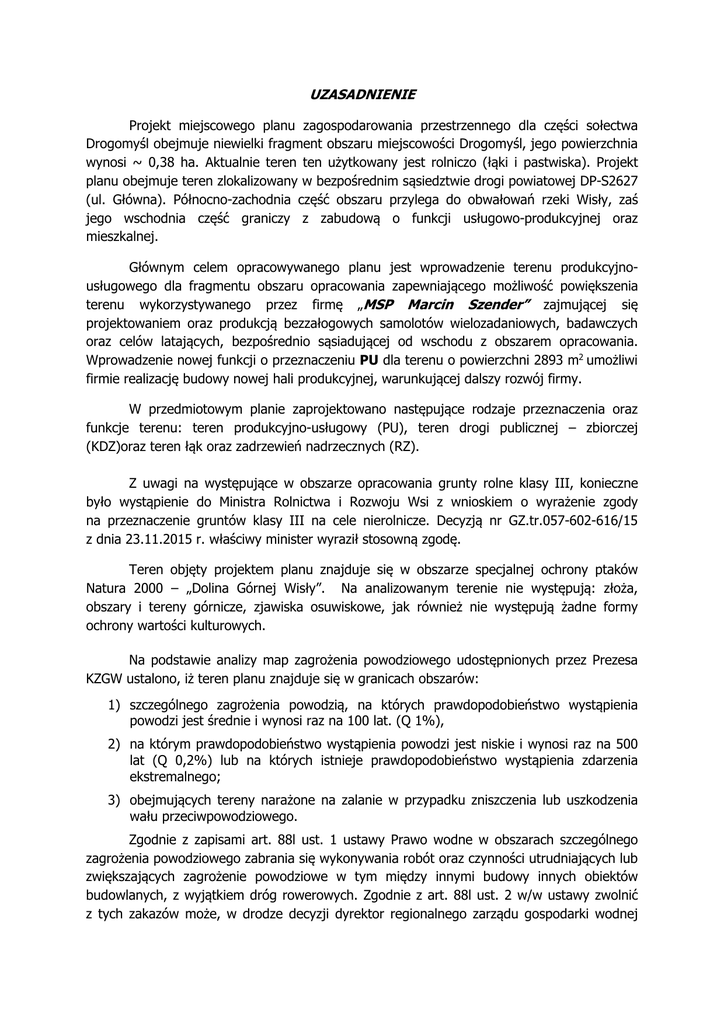 UZASADNIENIE Projekt miejscowego planu zagospodarowania przestrzennego dla części sołectwa Drogomyśl obejmuje niewielki fragment obszaru miejscowości Drogomyśl, jego powierzchnia wynosi ~ 0,38 ha. Aktualnie teren ten użytkowany jest rolniczo (łąki i pastwiska). Projekt planu obejmuje teren zlokalizowany w bezpośrednim sąsiedztwie drogi powiatowej DP-S2627 (ul. Główna). Północno-zachodnia część obszaru przylega do obwałowań rzeki Wisły, zaś jego wschodnia część graniczy z zabudową o funkcji usługowo-produkcyjnej oraz mieszkalnej. Głównym celem opracowywanego planu jest wprowadzenie terenu produkcyjnousługowego dla fragmentu obszaru opracowania zapewniającego możliwość powiększenia terenu wykorzystywanego przez firmę „MSP Marcin Szender” zajmującej się projektowaniem oraz produkcją bezzałogowych samolotów wielozadaniowych, badawczych oraz celów latających, bezpośrednio sąsiadującej od wschodu z obszarem opracowania. Wprowadzenie nowej funkcji o przeznaczeniu PU dla terenu o powierzchni 2893 m2 umożliwi firmie realizację budowy nowej hali produkcyjnej, warunkującej dalszy rozwój firmy. W przedmiotowym planie zaprojektowano następujące rodzaje przeznaczenia oraz funkcje terenu: teren produkcyjno-usługowy (PU), teren drogi publicznej – zbiorczej (KDZ)oraz teren łąk oraz zadrzewień nadrzecznych (RZ). Z uwagi na występujące w obszarze opracowania grunty rolne klasy III, konieczne było wystąpienie do Ministra Rolnictwa i Rozwoju Wsi z wnioskiem o wyrażenie zgody na przeznaczenie gruntów klasy III na cele nierolnicze. Decyzją nr GZ.tr.057-602-616/15 z dnia 23.11.2015 r. właściwy minister wyraził stosowną zgodę. Teren objęty projektem planu znajduje się w obszarze specjalnej ochrony ptaków Natura 2000 – „Dolina Górnej Wisły”. Na analizowanym terenie nie występują: złoża, obszary i tereny górnicze, zjawiska osuwiskowe, jak również nie występują żadne formy ochrony wartości kulturowych. Na podstawie analizy map zagrożenia powodziowego udostępnionych przez Prezesa KZGW ustalono, iż teren planu znajduje się w granicach obszarów: 1) szczególnego zagrożenia powodzią, na których prawdopodobieństwo wystąpienia powodzi jest średnie i wynosi raz na 100 lat. (Q 1%), 2) na którym prawdopodobieństwo wystąpienia powodzi jest niskie i wynosi raz na 500 lat (Q 0,2%) lub na których istnieje prawdopodobieństwo wystąpienia zdarzenia ekstremalnego; 3) obejmujących tereny narażone na zalanie w przypadku zniszczenia lub uszkodzenia wału przeciwpowodziowego. Zgodnie z zapisami art. 88l ust. 1 ustawy Prawo wodne w obszarach szczególnego zagrożenia powodziowego zabrania się wykonywania robót oraz czynności utrudniających lub zwiększających zagrożenie powodziowe w tym między innymi budowy innych obiektów budowlanych, z wyjątkiem dróg rowerowych. Zgodnie z art. 88l ust. 2 w/w ustawy zwolnić z tych zakazów może, w drodze decyzji dyrektor regionalnego zarządu gospodarki wodnej określając warunki niezbędne do ochrony przed powodzią. Mając na uwadze powyższe realizacja obiektu w jednostce PU projektowanego planu uzależniona będzie od wydania przez dyrektora RZGW w Gliwicach przedmiotowej decyzji. W sąsiedztwie terenu opracowania, w odległości około 20 m przepływa rzeka Wisła. Średnia rzędna zwierciadła wody rzeki Wisły w rejonie opracowania wynosi ~ 257,5 m n.p.m. Na podstawie analizy danych z mapy zasadniczej stwierdzono, że żądna powierzchni terenu opracowania znajduje się około 6,5 – 7 m powyżej rzędnej zwierciadła wody rzeki Wisły co sprawia, że prawdopodobieństwo wystąpienia powodzi jest bardzo znikome. Potwierdzaj to wieloletnie obserwacje przedmiotowego obszaru oraz mostu drogowego w ciągu drogi powiatowej znajdującego się w bezpośredniemu sąsiedztwie analizowanego obszaru. Planowana inwestycja związana z realizacją ustaleń planu z uwagi na jej typ i charakter cechuje się bardzo małą wrażliwością na ewentualne skutki wystąpienia powodzi. Jednakże, w celu minimalizacji ewentualnych skutków wynikających z zagrożenia powodziowego w projekcie planu znalazły się zapisy minimalizujące przedmiotowe zagrożenie. W trakcie procedowania nad projektem planu zakłada się realizację zasad partycypacji społecznej poprzez: jego wyłożenie do publicznego wglądu, przeprowadzenie dyskusji publicznej nad przyjętymi w planie założeniami oraz zebranie i przeanalizowanie wszystkich uwag złożonych do przedmiotowego projektu planu. Po przeprowadzeniu wszystkich uzgodnień i opinii projekt planu zostanie zamieszczony na stronie internetowej Urzędu Miejskiego w Strumieniu. W celu określenia wpływu realizacji ustaleń planu na finanse gminy sporządzono prognozę skutków finansowych uchwalenia planu. Projekt planu zakłada wprowadzenie stawki służącej naliczeniu opłaty z tytułu wzrostu wartości nieruchomości dla terenów w obszarze objętym planem: 1) teren o symbolu PU – 25% 2) tereny o symbolach KDZ, RZ- 1% Uchwałą Nr XX.182.2016 Rady Miejskiej w Strumieniu z dnia 25.05.2016 r. w sprawie aktualności studium uwarunkowań i kierunków zagospodarowania przestrzennego oraz miejscowych planów zagospodarowania przestrzennego Gminy Strumień przyjęto ocenę aktualności studium uwarunkowań i kierunków zagospodarowania przestrzennego oraz miejscowych planów zagospodarowania przestrzennego Gminy Strumień zawartą w opracowaniu: „Analiza zmian w zagospodarowaniu przestrzennym Gminy Strumień w latach 2011-2015” Z zapisów powyższej analizy wynika, że dotychczas obowiązujący plan miejscowy na obszarze objętym projektem planu wymaga aktualizacji i dostosowania do aktualnie obowiązujących przepisów prawa.