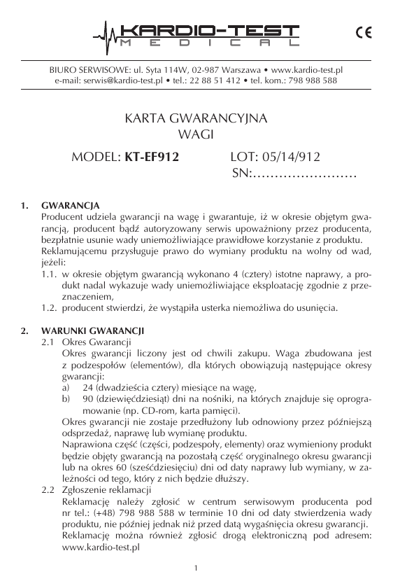BIURO SERWISOWE: ul. Syta 114W, 02-987 Warszawa • www.kardio-test.pl e-mail: [email protected] • tel.: 22 88 51 412 • tel. kom.: 798 988 588 KARTA GWARANCYJNA WAGI MODEL: KT-EF912 LOT: 05/14/912 SN:…………………… 1.GWARANCJA Producent udziela gwarancji na wagę i gwarantuje, iż w okresie objętym gwarancją, producent bądź autoryzowany serwis upoważniony przez producenta, bezpłatnie usunie wady uniemożliwiające prawidłowe korzystanie z produktu. Reklamującemu przysługuje prawo do wymiany produktu na wolny od wad, jeżeli: 1.1. w okresie objętym gwarancją wykonano 4 (cztery) istotne naprawy, a produkt nadal wykazuje wady uniemożliwiające eksploatację zgodnie z przeznaczeniem, 1.2. producent stwierdzi, że wystąpiła usterka niemożliwa do usunięcia. 2. WARUNKI GWARANCJI 2.1 Okres Gwarancji Okres gwarancji liczony jest od chwili zakupu. Waga zbudowana jest z podzespołów (elementów), dla których obowiązują następujące okresy gwarancji: a) 24 (dwadzieścia cztery) miesiące na wagę, b) 90 (dziewięćdziesiąt) dni na nośniki, na których znajduje się oprogramowanie (np. CD-rom, karta pamięci). Okres gwarancji nie zostaje przedłużony lub odnowiony przez późniejszą odsprzedaż, naprawę lub wymianę produktu. Naprawiona część (części, podzespoły, elementy) oraz wymieniony produkt będzie objęty gwarancją na pozostałą część oryginalnego okresu gwarancji lub na okres 60 (sześćdziesięciu) dni od daty naprawy lub wymiany, w zależności od tego, który z nich będzie dłuższy. 2.2 Zgłoszenie reklamacji Reklamację należy zgłosić w centrum serwisowym producenta pod nr tel.: (+48) 798 988 588 w terminie 10 dni od daty stwierdzenia wady produktu, nie później jednak niż przed datą wygaśnięcia okresu gwarancji. Reklamację można również zgłosić drogą elektroniczną pod adresem: www.kardio-test.pl 1 Aby usprawnić procedurę reklamacyjną niezbędne jest podanie przez Reklamującego danych kontaktowych: adres, nr tel., ewentualnie adres e-mail. Producent informuje, że rozpatrzenie reklamacji możliwe będzie wyłącznie po przedstawieniu: a) reklamowanego produktu, b) oryginału dowodu zakupu, który jednoznacznie określa nazwę i adres sprzedającego, datę i miejsce zakupu, rodzaj produktu, c) ważnej karty gwarancyjnej. Producent zobowiązuje się do rozpatrzenia reklamacji w terminie 14 dni od daty otrzymania reklamowanego produktu. 2.3 Gwarancja nie obejmuje: a) normalnego zużycia (w tym bez ograniczeń: zużycia baterii lub wyświetlaczy), b) uszkodzeń spowodowanych nieostrożnym obchodzeniem się z produktem (w tym bez ograniczeń: wad spowodowanych przez ostre przedmioty, zgniecenie, zginanie, uderzenie, upuszczenie itp.), c) uszkodzeń wynikających z niewłaściwego użytkowania wagi, w tym użytkowania w sposób sprzeczny z zaleceniami producenta zawartymi w INSTRUKCJI OBSŁUGI produktu i/lub innych zdarzeń, na które producent nie ma wpływu, d) wad spowodowanych zwarciem w bateriach lub wyciekiem substancji żrących z baterii, 2.3.1. Niniejsza gwarancja nie obowiązuje jeżeli produkt został otwarty, zmieniony lub naprawiony przez osobę inną niż przedstawiciel autoryzowanego serwisu producenta lub jeśli numer seryjny produktu został usunięty, wymazany lub zmieniony w stopniu, który zostanie określony według wyłączonego uznania producenta. 2.3.2. Niniejsza gwarancja nie obowiązuje, jeśli producent lub autoryzowany serwis polecony przez producenta stwierdzi, że produkt narażony był na działanie wilgoci, ekstremalnych warunków termicznych lub na gwałtowne zmiany takich warunków, korozję, utlenianie, zanieczyszczenie płynami lub produktami żywnościowymi, lub wpływ substancji chemicznych. 2.4 Ważne informacje 2.4.1. Reklamujący powinien dostarczyć wagę do siedziby producenta lub autoryzowanego serwisu producenta odpowiednio zabezpieczoną przed uszkodzeniem w czasie transportu. 2.4.2. Reklamujący pokrywa koszty dostarczenia wagi pod wskazany przez centrum serwisowe producenta adres. Reklamujący ponosi odpowiedzialność za zaginięcie towaru w czasie dostarczenia. 2.4.3. Producent zobowiązuje się pokryć koszty dostarczenia naprawionej w ramach gwarancji wagi na adres wskazany przez Reklamującego i bierze odpowiedzialność za zaginięcie towaru w tym czasie. 2.4.4. W przypadku stwierdzenia, że waga nie podlega warunkom niniejszej gwarancji, producent zastrzega sobie prawo pobrania kosztów manipulacyjnych. W przypadku możliwości dokonania odpłatnej naprawy Reklamujący zostanie telefonicznie lub za pomocą poczty 2 elektronicznej powiadomiony o wysokości takich kosztów i zapytany o zgodę na ich poniesienie. 2.4.5. W przypadku opisanym w pkt. 2.4.4 produkt zostanie odesłany do Reklamującego na jego koszt. 2.5 Odpowiedzialność producenta Niniejsza gwarancja stanowi jedyną i wyłączną formę zadośćuczynienia przez producenta oraz jedyną i wyłączną podstawę odpowiedzialności producenta z tytułu wad produktu, zastępując wszystkie gwarancje i zobowiązania producenta (poza bezwzględnie obowiązującymi na podstawie obowiązujących przepisów prawa). W zakresie dozwolonym przez obowiązujące przepisy prawa, producent nie ponosi odpowiedzialności za straty, uszkodzenia lub zniszczenie danych, za utratę jakichkolwiek korzyści, utratę możliwości korzystania z produktu oraz utratę jego funkcjonalności. W zakresie, na jaki zezwalają obowiązujące przepisy prawa, odpowiedzialność producenta ograniczona będzie do wartości zakupu produktu. Powyższe ograniczenia nie będą miały zastosowania w przypadku rażącego niedbalstwa lub umyślnej winy producenta. 2.6 Urządzenie jest objęte ochroną gwarancyjną na terenie Rzeczypospolitej Polskiej. Niniejsza gwarancja nie wyłącza, nie ogranicza ani nie zawiesza uprawnień kupującego wynikających z niezgodności towaru z umową zgodnie z art. 13. Ust. 4 ustawy z dnia 27 lipca 2002 r. o szczególny