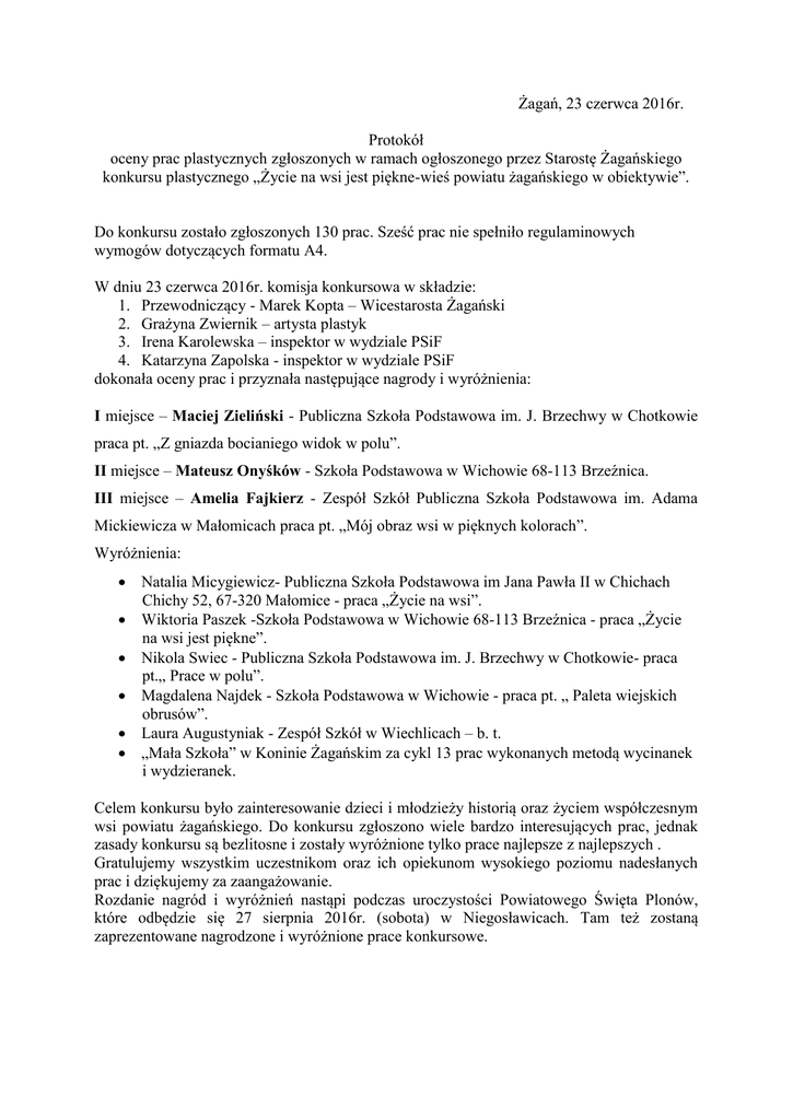 Żagań, 23 czerwca 2016r. Protokół oceny prac plastycznych zgłoszonych w ramach ogłoszonego przez Starostę Żagańskiego konkursu plastycznego „Życie na wsi jest piękne-wieś powiatu żagańskiego w obiektywie”. Do konkursu zostało zgłoszonych 130 prac. Sześć prac nie spełniło regulaminowych wymogów dotyczących formatu A4. W dniu 23 czerwca 2016r. komisja konkursowa w składzie: 1. Przewodniczący - Marek Kopta – Wicestarosta Żagański 2. Grażyna Zwiernik – artysta plastyk 3. Irena Karolewska – inspektor w wydziale PSiF 4. Katarzyna Zapolska - inspektor w wydziale PSiF dokonała oceny prac i przyznała następujące nagrody i wyróżnienia: I miejsce – Maciej Zieliński - Publiczna Szkoła Podstawowa im. J. Brzechwy w Chotkowie praca pt. „Z gniazda bocianiego widok w polu”. II miejsce – Mateusz Onyśków - Szkoła Podstawowa w Wichowie 68-113 Brzeźnica. III miejsce – Amelia Fajkierz - Zespół Szkół Publiczna Szkoła Podstawowa im. Adama Mickiewicza w Małomicach praca pt. „Mój obraz wsi w pięknych kolorach”. Wyróżnienia: Natalia Micygiewicz- Publiczna Szkoła Podstawowa im Jana Pawła II w Chichach Chichy 52, 67-320 Małomice - praca „Życie na wsi”. Wiktoria Paszek -Szkoła Podstawowa w Wichowie 68-113 Brzeźnica - praca „Życie na wsi jest piękne”. Nikola Swiec - Publiczna Szkoła Podstawowa im. J. Brzechwy w Chotkowie- praca pt.„ Prace w polu”. Magdalena Najdek - Szkoła Podstawowa w Wichowie - praca pt. „ Paleta wiejskich obrusów”. Laura Augustyniak - Zespół Szkół w Wiechlicach – b. t. „Mała Szkoła” w Koninie Żagańskim za cykl 13 prac wykonanych metodą wycinanek i wydzieranek. Celem konkursu było zainteresowanie dzieci i młodzieży historią oraz życiem współczesnym wsi powiatu żagańskiego. Do konkursu zgłoszono wiele bardzo interesujących prac, jednak zasady konkursu są bezlitosne i zostały wyróżnione tylko prace najlepsze z najlepszych . Gratulujemy wszystkim uczestnikom oraz ich opiekunom wysokiego poziomu nadesłanych prac i dziękujemy za zaangażowanie. Rozdanie nagród i wyróżnień nastąpi podczas uroczystości Powiatowego Święta Plonów, które odbędzie się 27 sierpnia 2016r. (sobota) w Niegosławicach. Tam też zostaną zaprezentowane nagrodzone i wyróżnione prace konkursowe.