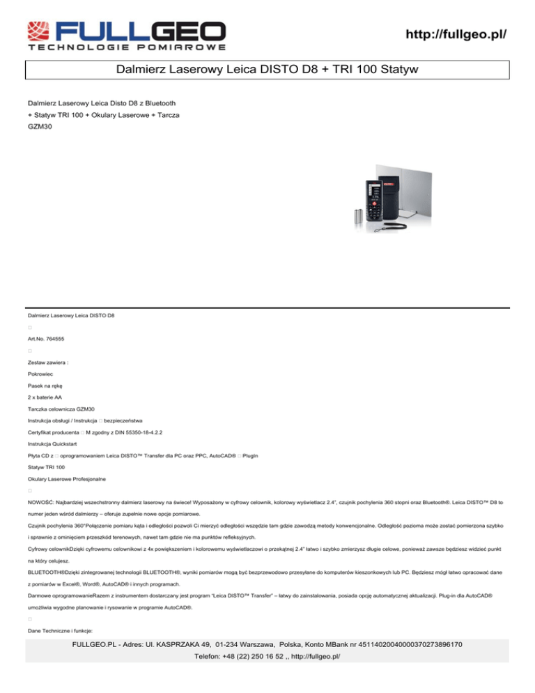 http://fullgeo.pl/ Dalmierz Laserowy Leica DISTO D8 + TRI 100 Statyw Dalmierz Laserowy Leica Disto D8 z Bluetooth + Statyw TRI 100 + Okulary Laserowe + Tarcza GZM30 Dalmierz Laserowy Leica DISTO D8 Art.No. 764555 Zestaw zawiera : Pokrowiec Pasek na rękę 2 x baterie AA Tarczka celownicza GZM30 Instrukcja obsługi / Instrukcja bezpieczeństwa Certyfikat producenta M zgodny z DIN 55350-18-4.2.2 Instrukcja Quickstart Płyta CD z oprogramowaniem Leica DISTO™ Transfer dla PC oraz PPC, AutoCAD® PlugIn Statyw TRI 100 Okulary Laserowe Profesjonalne NOWOŚĆ: Najbardziej wszechstronny dalmierz laserowy na świece! Wyposażony w cyfrowy celownik, kolorowy wyświetlacz 2.4”, czujnik pochylenia 360 stopni oraz Bluetooth®. Leica DISTO™ D8 to numer jeden wśród dalmierzy – oferuje zupełnie nowe opcje pomiarowe. Czujnik pochylenia 360°Połączenie pomiaru kąta i odległości pozwoli Ci mierzyć odległości wszędzie tam gdzie zawodzą metody konwencjonalne. Odległość pozioma może zostać pomierzona szybko i sprawnie z ominięciem przeszkód terenowych, nawet tam gdzie nie ma punktów refleksyjnych. Cyfrowy celownikDzięki cyfrowemu celownikowi z 4x powiększeniem i kolorowemu wyświetlaczowi o przekątnej 2.4” łatwo i szybko zmierzysz długie celowe, ponieważ zawsze będziesz widzieć punkt na który celujesz. BLUETOOTH®Dzięki zintegrowanej technologii BLUETOOTH®, wyniki pomiarów mogą być bezprzewodowo przesyłane do komputerów kieszonkowych lub PC. Będziesz mógł łatwo opracować dane z pomiarów w Excel®, Word®, AutoCAD® i innych programach. Darmowe oprogramowanieRazem z instrumentem dostarczany jest program “Leica DISTO™ Transfer” – łatwy do zainstalowania, posiada opcję automatycznej aktualizacji. Plug-in dla AutoCAD® umożliwia wygodne planowanie i rysowanie w programie AutoCAD®. Dane Techniczne i funkcje: FULLGEO.PL - Adres: Ul. KASPRZAKA 49, 01-234 Warszawa, Polska, Konto MBank nr 45114020040000370273896170 Telefon: +48 (22) 250 16 52 ,, http://fullgeo.pl/ http://fullgeo.pl/ Zasięg : 0,05 do 200 m Dokładność* : ± 1,0 mm Czujnik pochylenia : zakres pomiaru 360° Zapis wartości stałych : 1 Wywołanie ostatnich pomiarów : 30 Wielofunkcyjna stopka odniesienia: automatyczna BLUETOOTH® ( Klasa 2) , przesył danych do komputera Baterie : AA 2 x 1,5V Klasa odporności : IP54 Gwint do statywu : metalowy Kolorowy wyświetlacz 2,4” z 4 x zoom Pomiar ciągły, minimum i maksimum Pomiary z użyciem czujnika pochylenia Pomiary pól powierzchni , trójkąta , trapezu, Cechy instrumentu Twoje korzyści Zasięg pomiaru od 0,05m do 200m, typowa dokładność ± 1.0 mm Precyzyjne, szybkie i wiarygodne pomiary BLUETOOTH® Bezbłędny i szybki transfer danych do komputera kieszonkowego lub PC Dostarczany z instrumentem program “Leica DISTOTM Transfer” Transfer danych do późniejszej obróbki w Excel®, Word®, AutoCAD® lub innym programie dla Windows Plug-in dla AutoCAD® Wygodne rysowanie w programie AutoCAD® Czujnik pochylenia 360° Pomiar kątów pionowych Cyfrowy punktowy celownik z 4x zoomem i kolorowym wyświetlaczem o wysokiej rozdzielczości Wygodne pomiary odległych obiektów, nawet w bardzo jasne dni Pośrednie pomiary przy użyciu czujnika pochylenia Określenie odległości do obiektów, których nie można bezpośrednio pomierzyć, ponieważ nie posiadają powierzchni refleksyjnych Pomiar profili Pomiar wysokich profili terenowych FULLGEO.PL - Adres: Ul. KASPRZAKA 49, 01-234 Warszawa, Polska, Konto MBank nr 45114020040000370273896170 Telefon: +48 (22) 250 16 52 ,, http://fullgeo.pl/ http://fullgeo.pl/ FULLGEO.PL - Adres: Ul. KASPRZAKA 49, 01-234 Warszawa, Polska, Konto MBank nr 45114020040000370273896170 Telefon: +48 (22) 250 16 52 ,, http://fullgeo.pl/