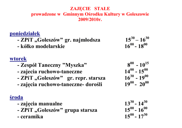 ZAJĘCIE STAŁE prowadzone w Gminnym Ośrodku Kultury w Goleszowie 2009/2010r. poniedziałek - ZPiT „Goleszów” gr. najmłodsza - kółko modelarskie 1530 – 1630 1600 - 1800 wtorek - Zespół Taneczny ”Myszka” - zajecia ruchowo-taneczne - ZPiT „Goleszów” gr. repr. starsza - zajęcia ruchowo-taneczne- dorośli 800 - 1015 1400 - 1500 1630 - 1900 1900 - 2000 środa - zajęcia manualne - ZPiT „Goleszów” grupa starsza - ceramika 1330 - 1430 1500 - 1600 1500 - 1730 - klub tańca towarzyskiego klub tańca towarzyskiego (dorośli) czwartek - zajęcia manualne - Gimdance - ZPiT „Goleszów” gr. repr. młodsza - Zespół Taneczny „Koksinel” - zajęcia ruchowo-taneczne- dorośli 1600 – 1730 1745 – 2000 1300 – 1500 1400 - 1530 1530 - 1700 1700 - 1900 1900 - 2000 piątek - zajęcia manualne - warsztaty plastyczne - Zespół Taneczny ”Myszka” - Zespół Taneczny ”Myszka” - taniec flamenco dla dzieci 800 - 915 1200 - 1730 1230 - 1410 1400 – 1500 1530 - 1700 - Kapela ZPiT 1700 - 1900 sobota - Zespół Dziecięcy „Ploom” Wypożyczalnia Kostiumów - poniedziałek – piątek 9/oo – 11/oo 800 – 1600 tel: 033 479 36 32 Izba Oświęcimska poniedziałek – piątek 800 – 1600 (zwiedzanie z kustoszem po wcześniejszym kontakcie telefonicznym z GOK - 033 479 05 21 ) Świetlica Gminna w Cisownicy: tel. 033 8527 115 -Teatr Młodego Widza „Iskierka” piątek - Kabaret „Rufijoki” czwartek - ZŚ „Beskuryje” poniedziałek -kółko gwarowe „Utropki” środa - ZŚ „Przocielki” wtorek - kółko manualne czwartek - Zespół Reage „Silesian Sond” środa 13/oo-17/oo 17/oo 17/oo-19/oo 14/oo-16/oo 17/oo-19/oo 16/oo-17/oo 17/oo-20/oo Świetlica Gminna w Lesznej Górnej: - ZR „Czantoria” wtorek, piątek - LZS „Lesznianka” 16/oo-19/oo codziennie w godzinach otwarcia placówki za wyjątkiem prób ZR”Czantoria”