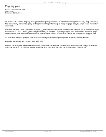 Dolnośląska Izba Lekarsko-Weterynaryjna Zaginął pies Autor: Sekretariat DIL-Wet 31.03.2016. Zmieniony 31.03.2016. 19 marca 2015 roku zaginął pies (berneński pies pasterski) w Olbrachtowie (gmina Żary, woj. lubuskie). Nie dostaliśmy od tamtej pory żadnej konkretnej informacji o miejscu jego pobytu, więc teraz może być wszędzie. Pies ma na imię Leon (na które reaguje), jest berneńskim psem pasterskim, urodził się w hodowli Kropla Nadziei 08.07.2011 roku, jest zarejestrowany w Związku Kynologicznym pod imieniem Converse, jego właścicielem jest Marlena Malinowska. W uchu ma tatuaż o numerze 060M. W załączniku zdjęcie psa. Za podanie miejsca pobytu psa przeznaczona jest nagroda pieniężna o wartości 1500 złotych. Kontakt do właścicieli: nr tel. 512 428 587 Bardzo nam zależy na odnalezieniu psa, mimo że minęło tak długo czasu wierzymy że dzięki okazanej pomocy on wróci do domu. Każda informacja o nim jest dla nas bardzo istotna. zdjecie.pdf http://dilwet.pl Kreator PDF Utworzono 7-03-2017, 01:09
