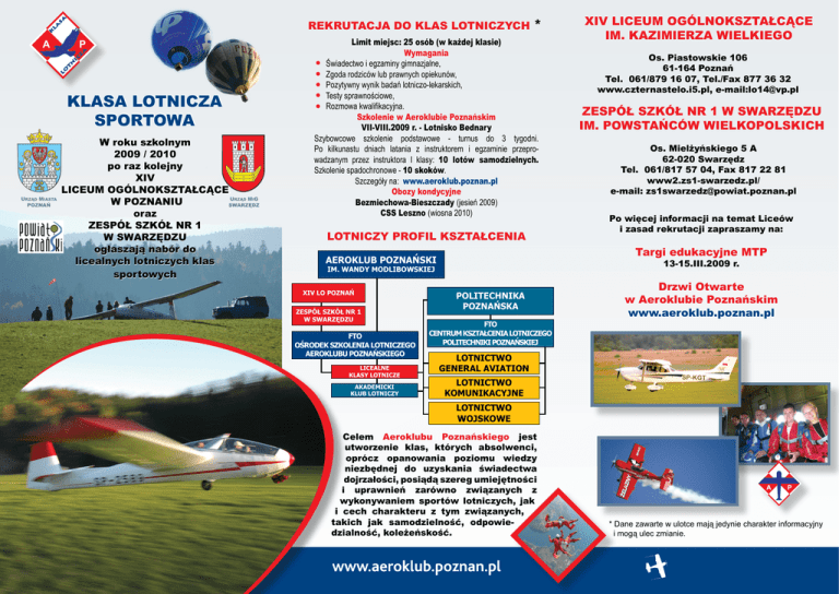 Rekrutacja do klas lotniczych KLASA LOTNICZA SPORTOWA URZĄD MIASTA POZNAŃ W roku szkolnym 2009 2007 / 2010 2008 po raz kolejny XIV Liceum Ogólnokształcące Liceum Ogólnokształcące U MG w Poznaniu SWARZĘDZ oraz Zespół Szkół nr 1 w Swarzędzu ogłaszają nabór do licealnych lotniczych klas sportowych RZĄD I * Limit miejsc: 25 osób (w każdej klasie) Wymagania Świadectwo i egzaminy gimnazjalne, Zgoda rodziców lub prawnych opiekunów, Pozytywny wynik badań lotniczo-lekarskich, Testy sprawnościowe, Rozmowa kwalifikacyjna. Szkolenie w Aeroklubie Poznańskim VII-VIII.2009 r. - Lotnisko Bednary Szybowcowe szkolenie podstawowe - turnus do 3 tygodni. Po kilkunastu dniach latania z instruktorem i egzaminie przeprowadzanym przez instruktora I klasy: 10 lotów samodzielnych. Szkolenie spadochronowe - 10 skoków. Szczegóły na: www.aeroklub.poznan.pl Obozy kondycyjne Bezmiechowa-Bieszczady (jesień 2009) CSS Leszno (wiosna 2010) LOTNICZY PROFIL KSZTAŁCENIA FTO OŚRODEK SZKOLENIA LOTNICZEGO AEROKLUBU POZNAŃSKIEGO LICEALNE KLASY LOTNICZE AKADEMICKI KLUB LOTNICZY ZESPÓŁ SZKÓŁ NR 1 W SWARZĘDZU IM. POWSTAŃCÓW WIELKOPOLSKICH Os. Mielżyńskiego 5 A 62-020 Swarzędz Tel. 061/817 57 04, Fax 817 22 81 www2.zs1-swarzedz.pl/ e-mail: [email protected] Po więcej informacji na temat Liceów i zasad rekrutacji zapraszamy na: 13-15.III.2009 r. IM. WANDY MODLIBOWSKIEJ ZESPÓŁ SZKÓŁ NR 1 W SWARZĘDZU Os. Piastowskie 106 61-164 Poznań Tel. 061/879 16 07, Tel./Fax 877 36 32 www.czternastelo.i5.pl, e-mail:[email protected] Targi edukacyjne MTP AEROKLUB POZNAŃSKI XIV LO POZNAŃ XIV LICEUM OGÓLNOKSZTAŁCĄCE IM. KAZIMIERZA WIELKIEGO POLITECHNIKA POZNAŃSKA FTO CENTRUM KSZTAŁCENIA LOTNICZEGO POLITECHNIKI POZNAŃSKIEJ Drzwi Otwarte w Aeroklubie Poznańskim www.aeroklub.poznan.pl LOTNICTWO GENERAL AVIATION LOTNICTWO KOMUNIKACYJNE LOTNICTWO WOJSKOWE Celem Aeroklubu Poznańskiego jest utworzenie klas, których absolwenci, oprócz opanowania poziomu wiedzy niezbędnej do uzyskania świadectwa dojrzałości, posiądą szereg umiejętności i uprawnień zarówno związanych z wykonywaniem sportów lotniczych, jak i cech charakteru z tym związanych, takich jak samodzielność, odpowiedzialność, koleżeńskość. * Dane zawarte w ulotce mają jedynie charakter informacyjny i mogą ulec zmianie.