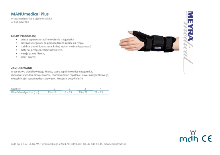 MANUmedical Plus orteza nadgarstka z ujęciem kciuka nr kat. MY2761 CECHY PRODUKTU: • • • • • • orteza zapewnia stabilne ułożenie nadgarstka, możliwość regulacji za pomocą trzech zapięć na rzepy, stabilna, aluminiowa szyna, której kształt można dopasować, materiał przepuszczający powietrze, wersja prawa i lewa , kolor: czarny. ZASTOSOWANIE: urazy stawu siodełkowatego kciuka, stany zapalne okolicy nadgarstka, choroba zwyrodnieniowa stawów, reumatoidalne zapalenie stawu nadgarstkowego, niestabilności stawu nadgarstkowego, kręcenia, zespół cieśni. Rozmiar Obwód nadgarstka (cm) 1 13 – 16 2 16 – 19 3 19 – 22 4 22 – 25 mdh sp. z o.o., ul. Ks. W. Tymienieckiego 22/24, 90-349 Łódź, tel. 42 636 81 44, [email protected]