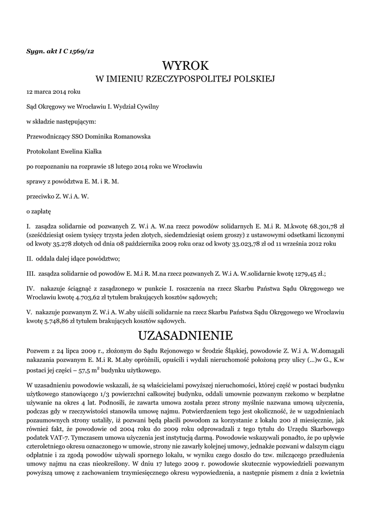 Sygn. akt I C 1569/12 WYROK W IMIENIU RZECZYPOSPOLITEJ POLSKIEJ 12 marca 2014 roku Sąd Okręgowy we Wrocławiu I. Wydział Cywilny w składzie następującym: Przewodniczący SSO Dominika Romanowska Protokolant Ewelina Kiałka po rozpoznaniu na rozprawie 18 lutego 2014 roku we Wrocławiu sprawy z powództwa E. M. i R. M. przeciwko Z. W.i A. W. o zapłatę I. zasądza solidarnie od pozwanych Z. W.i A. W.na rzecz powodów solidarnych E. M.i R. M.kwotę 68.301,78 zł (sześćdziesiąt osiem tysięcy trzysta jeden złotych, siedemdziesiąt osiem groszy) z ustawowymi odsetkami liczonymi od kwoty 35.278 złotych od dnia 08 października 2009 roku oraz od kwoty 33.023,78 zł od 11 września 2012 roku II. oddala dalej idące powództwo; III. zasądza solidarnie od powodów E. M.i R. M.na rzecz pozwanych Z. W.i A. W.solidarnie kwotę 1279,45 zł.; IV. nakazuje ściągnąć z zasądzonego w punkcie I. roszczenia na rzecz Skarbu Państwa Sądu Okręgowego we Wrocławiu kwotę 4.703,62 zł tytułem brakujących kosztów sądowych; V. nakazuje pozwanym Z. W.i A. W.aby uiścili solidarnie na rzecz Skarbu Państwa Sądu Okręgowego we Wrocławiu kwotę 5.748,86 zł tytułem brakujących kosztów sądowych. UZASADNIENIE Pozwem z 24 lipca 2009 r., złożonym do Sądu Rejonowego w Środzie Śląskiej, powodowie Z. W.i A. W.domagali nakazania pozwanym E. M.i R. M.aby opróżnili, opuścili i wydali nieruchomość położoną przy ulicy (...)w G., K.w postaci jej części – 57,5 m2 budynku użytkowego. W uzasadnieniu powodowie wskazali, że są właścicielami powyższej nieruchomości, której część w postaci budynku użytkowego stanowiącego 1/3 powierzchni całkowitej budynku, oddali umownie pozwanym rzekomo w bezpłatne używanie na okres 4 lat. Podnosili, że zawarta umowa została przez strony myślnie nazwana umową użyczenia, podczas gdy w rzeczywistości stanowiła umowę najmu. Potwierdzeniem tego jest okoliczność, że w uzgodnieniach pozaumownych strony ustaliły, iż pozwani będą płacili powodom za korzystanie z lokalu 200 zł miesięcznie, jak również fakt, że powodowie od 2004 roku do 2009 roku odprowadzali z tego tytułu do Urzędu Skarbowego podatek VAT-7. Tymczasem umowa użyczenia jest instytucją darmą. Powodowie wskazywali ponadto, że po upływie czteroletniego okresu oznaczonego w umowie, strony nie zawarły kolejnej umowy, jednakże pozwani w dalszym ciągu odpłatnie i za zgodą powodów używali spornego lokalu, w wyniku czego doszło do tzw. milczącego przedłużenia umowy najmu na czas nieokreślony. W dniu 17 lutego 2009 r. powodowie skutecznie wypowiedzieli pozwanym powyższą umowę z zachowaniem trzymiesięcznego okresu wypowiedzenia, a następnie pismem z dnia 2 kwietnia 2009 r., powód wypowiedział również dotychczasowe warunki najmu w kwocie 200 zł, określając zarazem nową stawkę odpowiadającą ówczesnym stawkom rynkowym w wysokości 2.000 zł. Powodowie wskazali także, że kwota, jaka została im przekazana w międzyczasie przez pozwanych stanowiła kaucję za wynajem spornej nieruchomości, a nie - jak twierdzili pozwani w jednym z pism skierowanych do powodów - zapłatę za wynajmowaną przez nich nieruchomość. Ponadto w ciągu 8 lat, jakie upłynęły od wygaśnięcia przedmiotowej umowy, pozwani nie podjęli żadnych kroków mających na celu uregulowanie ich sytuacji prawnej. W odpowiedzi na pozew E. M. i R. M. wnieśli o oddalenie powództwa o eksmisję. Jednocześnie wystąpili z powództwem wzajemnym i wnieśli o zasądzenie od powodów (pozwanych wzajemnie) na ich rzecz solidarnie kwoty 35.278 zł wraz z ustawowymi odsetkami od dnia wniesienia pozwu wzajemnego do dnia zapłaty. W uzasadnieniu wskazali, że zawarta między stronami w dniu 05 stycznia 1997 r. na okres czterech lat umowa, stanowiła umowę użyczenia części nieruchomości budynkowej o powierzchni 57,5 m2. W § 5 tejże umowy zawarta została klauzula, w której użyczający, a zatem powodowie - pozwani wzajemni, zobowiązywali się do sprzedaży przedmiotu użyczenia biorącym w użyczenie, za cenę określoną w odrębnej umowie przyrzeczenia sprzedaży. Nieruchomość, której część powodowie - pozwani wzajemni oddali w użyczenie pozwanym - powodom wzajemnym, nabyli oni w dniu 17 maja 1996 r. W związku z wykupem nieruchomości zaciągnęli kredyt na kwotę 45.000 zł, którego spłata przekraczała jednak ich możliwości finansowe. Wobec powyższego powodowie - pozwani wzajemni zawarli z pozwanymi - powodami wzajemnymi ustne porozumienie, na podstawie którego pozwani - powodowie wzajemni mieli spłacić część kredytu proporcjonalną do wartości części nieruchomości oddanej im w użyczenie, a jednocześnie objętej klauzulą sprzedaży. W tym celu powód - pozwany wzajemnie sporządził arkusz poszczególnych rat kredytowych, uwzględniający spłatę przez pozwanych, który wręczył pozwanemu - powodowi wzajemnemu i który był podstawą dokonywania przez niego wpłat na rzecz powodów - pozwanych wzajemnych. Pozwani - powodowie wzajemni wpłacili powodom - pozwanym wzajemnym całą wymaganą przez nich kwotę, która stanowiła równowartość ceny zakupu lokalu mającego formalnie nastąpić w przyszłości, a która obecnie jest przedmiotem żądania pozwu wzajemnego. Pozwani - powodowie wzajemni podnieśli, że w okresie od 1996 do 2000 roku zapłacili powodom - pozwanym wzajemnie łączną kwotę 35.278 zł , z czego część stanowiły miesięczne raty w wysokości wynikającej z opisanego wyżej arkusza utworzonego przez A. W.na bazie harmonogramu spłaty kredytu otrzymanego przez niego z banku. Wskazali, że okres 4 lat, na jaki zawarta została umowa użyczenia i po którym miała nastąpić na ich na rzecz sprzedaż części nieruchomości, uzasadniony był chęcią uniknięcia opodatkowania transakcji sprzedaży podatkiem dochodowym z tytułu sprzedaży nieruchomości przed upływem 5 lat od daty zakupu. Po upływie 4 lat, na jaki zawarta z