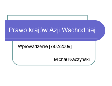 Prawo krajów Azji Wschodniej Wprowadzenie [7/02/2009] Michał Kłaczyński Plan kursu [wprowadzenie] Systemy prawne w krajach azjatyckich common law prawo kontynentalne prawo islamskie Kulturowe uwarunkowania Jakich róŜnic naleŜy się spodziewać? Plan kursu [wprowadzenie] Rozstrzyganie arbitraŜ Ochrona sporów inwestycji arbitraŜ inwestycyjny Plan kursu [Chiny] System prawny Uwarunkowania współczesne – ekonomiczne i społeczne Uwarunkowania historyczne i kulturowe Instytucje publiczne Źródła prawa Przegląd najwaŜniejszych zagadnień (dla zagranicznego inwestora) Plan kursu [Chiny] Prawo umów autonomia stron ingerencja sądu ingerencja ustawodawcy typy umów Delikty (odpowiedzialność odszkodowawcza) odpowiedzialność za produkt nieuczciwa konkurencja Plan kursu [Chiny] Inwestycje zagraniczne dostępne formy prawne zezwolenia i rejestracja działalności regulacje sektorowe prawo antymonopolowe Plan kursu [Chiny] Obrót gospodarczy podmioty na rynku (spółki, przedsiębiorstwa państwowe) corporate governance rynek kapitałowy prawo upadłościowe prawo pracy nieruchomości Plan kursu [Chiny] Rozwiązywanie sporów postępowanie sądowe mediacja i arbitraŜ Własność intelektualna ochrona IP i tajemnicy przedsiębiorstwa rola ochrony kontraktowej (NDA) Plan kursu [Chiny] Zagadnienia praktyczne spółka joint venture – kontrola zabezpieczenie wykonania zobowiązań ochrona tajemnicy przedsiębiorstwa klauzule arbitraŜowe Plan kursu [Azja Płd.-Wsch.] Tajwan, Hongkong, Singapur, Macau kontekst historyczny Tajwan – wpływ prawa japońskiego Hongkong, Singapur – wpływ prawa angielskiego Macau – wpływ prawa portugalskiego prawo gospodarcze rozstrzyganie sporów Plan kursu [Azja Płd – Wsch.] Wietnam, Tajlandia, Malezja, Indonezja, Filipiny uwarunkowania historyczne (wpływy chińskie, islamskie, francuskie, amerykańskie) prawo gospodarcze zagadnienia związane z inwestycjami zagranicznymi Plan kursu [Azja Płd – Wsch.] Handel międzynarodowy w Azji Wschodniej i Południowo – Wschodniej obszary wolnego handlu unie celne umowy o unikaniu podwójnego opodatkowania Plan kursu [Japonia i Korea] Instytucje publiczne i źródła prawa Obrót gospodarczy prawo umów, prawo spółek, rynek kapitałowy Zagadnienia regulacyjne: prawo antymonopolowe, ochrona środowiska Własność intelektualna Rozwiązywanie sporów warsztaty Jak zredagować dobrą umowę? Jak przygotować się do sporu sądowego/arbitraŜowego? Typowe umowy: sprzedaŜ, finansowanie, usługi, licencje, transport, wspólne przedsięwzięcie, sprzedaŜ przedsiębiorstwa/sprzedaŜ spółki, umowy z pracownikami Proces inwestycyjny: list intencyjny, umowa o zachowaniu poufności, badanie przedsiębiorstwa, wybór struktury inwestycji, zezwolenia administracyjne Sprawy organizacyjne Materiały na zajęcia [e-mail] Pytania w trakcie zajęć: mile widziane Pytania i uwagi po zajęciach: e-mail kontakt: [email protected] Sprawy organizacyjne Jakie są Państwa potrzeby i oczekiwania? Szczególne istotne tematy z Państwa punktu widzenia Państwa uwagi do planu kursu Azja – rządy prawa Jaki jest status Azji Wschodniej w stosunku do innych regionów? Które z krajów azjatyckich są przykładem udanych reform? Tradycja prawna/polityczna Azji a „idea rządów prawa” Jak oceniać reformy prawa? Jakie czynniki wpływają na rządy prawa? Tradycja polityczno-prawna Charakterystyczne dla całego regionu demokratyzacja, prawa pracownicze, prawa kobiet, prawa osobiste wolność od ingerencji władzy państwowej, pewność prawa, wartości kulturowe (Liberalna) Demokracja ReŜimy polityczne w Azji: Niedemokratyczne: Chiny, Hongkong, Wietnam and Myanmar (Birma) Semi-demokratyczne (miękki autorytaryzm, ograniczona demokracja): Singapur, Malezja i KambodŜa Liberalne demokracje? – Japonia, Tajwan, Korea Płd znaczące róŜnice co do praw obywatelskich i politycznych, społecznych oraz ekonomicznych + wymiaru sprawiedliwości Generalizacje Znacząca róŜnorodność co do praw człowieka i innych czynników jakości Ŝycia Niski standard – prawa polityczne i osobiste (na tle krajów o podobnym statusie ekonomicznym) Wysoki standard – prawa gospodarcze oraz edukacja, stabilność społeczna, pewność prawa Wysoki standard jakości rządów System polityczny a rządy prawa Słaby związek między demokracją a rządami prawa Demokracja niekonieczna - Singapur, HK Demokracja niewystarczająca Wyjątkowość Azji Wyraźny związek między rządami prawa a wzrostem gospodarczym wysoki wzrost (5% przez ostatnie 30 lat): Japan, South Korea, Taiwan, Hong Kong, Singapore, China średni (3.5%): Thailand, Malaysia, Indonesia Niski (< 2%): NK, Mongolia, Vietnam, Cambodia, Laos, Philippines, Myanmar swobody gospodarcze: ochrona wartości pieniądza, własność prywatna, swoboda kontraktowania, dobre sądownictwo, niewielkie ograniczenia handlu zagranicznego, wolny rynek pracy Ranking rządów prawa Banku Światowego County 2002 1996 Singapore (HI) 93.9 99.4 Japan (HI) 88.7 88.0 Hong Kong (HI) 86.6 90.4 Taiwan (HI/UM) 80.9 84.3 South Korea (UM) 77.8 81.9 Malaysia (M) 69.6 82.5 Mongolia (LI) 64.9 70.5 Thailand (M) 62.9 71.1 China (LM) 51.5 37.3 Vietnam (LI) 44.8 34.9 Philippines (LM) 38.1 54.8 Indonesia (LI) 23.1 39.8 Cambodia (LI) 20.1 16.9 North Korea (LI) 14.7 13.9 Laos (LI) 12.9 4.8 Myanmar (LI) 2.1 5.4 Inne czynnki Historia kolonializmu Kwestie etniczne Kultury podkreślające autonomię i egalitaryzm mają wyŜszy standard rządów prawa, odpowiedzialności władz i niŜsza korupcję; kraje w których kultura jest hierarchiczna (poddańcza) – odwrotnie jednak nie działa to w Azji Kto popiera reformy? Grupy interesów Tradycje prawne w Azji historyczne chińska, hinduska islamska transplanty Common Law prawo kontynentalne prawo socjalistyczne koncepcje prawne Tradycje: modele myślenia o prawie funkcje społeczne Prawo zaleŜy od gospodarki upadek gospodarek socjalistycznych oznaczał upadek koncepcji prawnic