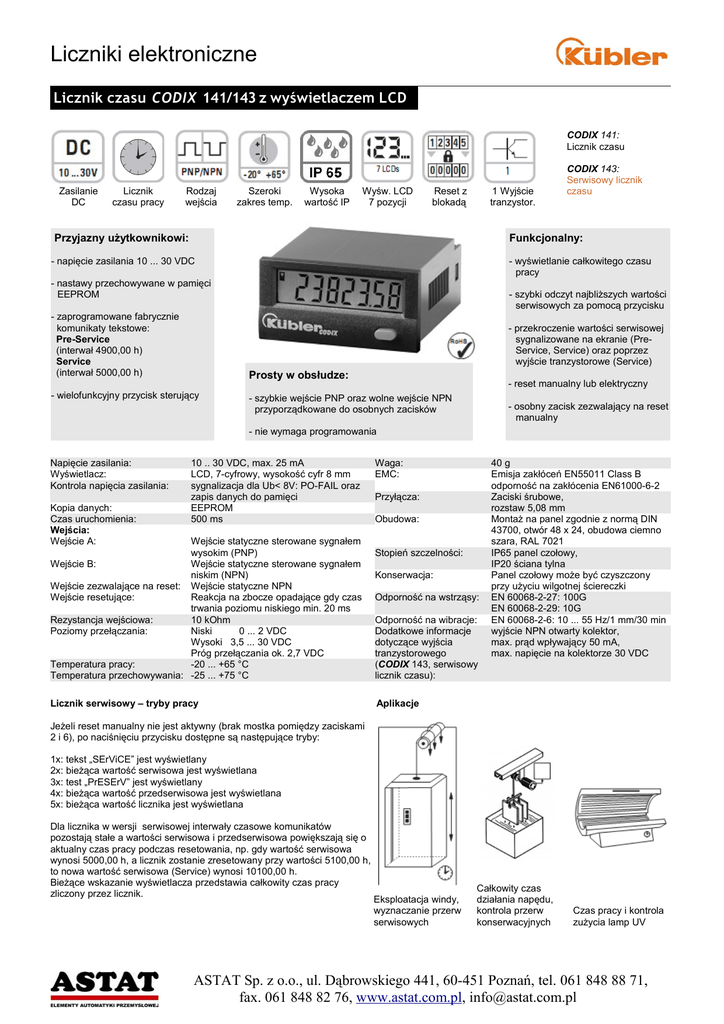 Liczniki elektroniczne Licznik czasu CODIX 141/143 z wyświetlaczem LCD CODIX 141: Licznik czasu Zasilanie DC Licznik czasu pracy Rodzaj wejścia Szeroki zakres temp. Wysoka wartość IP Wyśw. LCD 7 pozycji Reset z blokadą 1 Wyjście tranzystor. Przyjazny użytkownikowi: CODIX 143: Serwisowy licznik czasu Funkcjonalny: - napięcie zasilania 10 ... 30 VDC - wyświetlanie całkowitego czasu pracy - nastawy przechowywane w pamięci EEPROM - zaprogramowane fabrycznie komunikaty tekstowe: Pre-Service (interwał 4900,00 h) Service (interwał 5000,00 h) - szybki odczyt najbliższych wartości serwisowych za pomocą przycisku - przekroczenie wartości serwisowej sygnalizowane na ekranie (PreService, Service) oraz poprzez wyjście tranzystorowe (Service) Prosty w obsłudze: - wielofunkcyjny przycisk sterujący - reset manualny lub elektryczny - szybkie wejście PNP oraz wolne wejście NPN przyporządkowane do osobnych zacisków - osobny zacisk zezwalający na reset manualny - nie wymaga programowania Napięcie zasilania: Wyświetlacz: Kontrola napięcia zasilania: Kopia danych: Czas uruchomienia: Wejścia: Wejście A: 10 .. 30 VDC, max. 25 mA LCD, 7-cyfrowy, wysokość cyfr 8 mm sygnalizacja dla Ub< 8V: PO-FAIL oraz zapis danych do pamięci EEPROM 500 ms Wejście statyczne sterowane sygnałem wysokim (PNP) Wejście B: Wejście statyczne sterowane sygnałem niskim (NPN) Wejście zezwalające na reset: Wejście statyczne NPN Wejście resetujące: Reakcja na zbocze opadające gdy czas trwania poziomu niskiego min. 20 ms Rezystancja wejściowa: 10 kOhm Poziomy przełączania: Niski 0 ... 2 VDC Wysoki 3,5 ... 30 VDC Próg przełączania ok. 2,7 VDC Temperatura pracy: -20 ... +65 °C Temperatura przechowywania: -25 ... +75 °C Licznik serwisowy – tryby pracy Waga: EMC: Przyłącza: Obudowa: Stopień szczelności: Konserwacja: Odporność na wstrząsy: Odporność na wibracje: Dodatkowe informacje dotyczące wyjścia tranzystorowego (CODIX 143, serwisowy licznik czasu): 40 g Emisja zakłóceń EN55011 Class B odporność na zakłócenia EN61000-6-2 Zaciski śrubowe, rozstaw 5,08 mm Montaż na panel zgodnie z normą DIN 43700, otwór 48 x 24, obudowa ciemno szara, RAL 7021 IP65 panel czołowy, IP20 ściana tylna Panel czołowy może być czyszczony przy użyciu wilgotnej ściereczki EN 60068-2-27: 100G EN 60068-2-29: 10G EN 60068-2-6: 10 ... 55 Hz/1 mm/30 min wyjście NPN otwarty kolektor, max. prąd wpływający 50 mA, max. napięcie na kolektorze 30 VDC Aplikacje Jeżeli reset manualny nie jest aktywny (brak mostka pomiędzy zaciskami 2 i 6), po naciśnięciu przycisku dostępne są następujące tryby: 1x: tekst „SErViCE” jest wyświetlany 2x: bieżąca wartość serwisowa jest wyświetlana 3x: test „PrESErV” jest wyświetlany 4x: bieżąca wartość przedserwisowa jest wyświetlana 5x: bieżąca wartość licznika jest wyświetlana Dla licznika w wersji serwisowej interwały czasowe komunikatów pozostają stałe a wartości serwisowa i przedserwisowa powiększają się o aktualny czas pracy podczas resetowania, np. gdy wartość serwisowa wynosi 5000,00 h, a licznik zostanie zresetowany przy wartości 5100,00 h, to nowa wartość serwisowa (Service) wynosi 10100,00 h. Bieżące wskazanie wyświetlacza przedstawia całkowity czas pracy zliczony przez licznik. Eksploatacja windy, wyznaczanie przerw serwisowych Całkowity czas działania napędu, kontrola przerw konserwacyjnych Czas pracy i kontrola zużycia lamp UV ASTAT Sp. z o.o., ul. Dąbrowskiego 441, 60-451 Poznań, tel. 061 848 88 71, fax. 061 848 82 76, www.astat.com.pl, [email protected] Liczniki elektroniczne Licznik czasu CODIX 141/143 z wyświetlaczem LCD Wymiary: Zawartość opakowania: - licznik - ramka dociskowa - adapter do montażu w otworze 50 x 25 mm - uszczelki - wielojęzyczna instrukcja użytkowania Schemat podłączenia: Pin Opis Licznik czasu CODIX 141 Serwisowy licznik czasu CODIX 143 Zasilanie 1 2 +Ub 0 VDC, GND 10 ... 30 VDC GND 10 ... 30V DC GND Wejścia 3 0 VDC, GND GND GND 4 5 Wejście PNP Wejście NPN INP PNP INP NPN INP PNP INP NPN 6 Zezwolenie na reset MANUAL RESET ENABLE Wejście resetujące RESET 7 * zacisk 8 jest wykorzystywany tylko Wyjście w liczniku CODIX 143 8 Wyjście NPN (wyjście tranzystorowe NPN OC) n.d. Wyjście NPN, otwarty kolektor dla CODIX 143 MANUAL RESET ENABLE RESET OUT Kod zamówienia – Licznik czasu pracy: 6.141.012.300 Kod zamówienia – Serwisowy licznik czasu pracy: 6.143.011.300.005K.00 *Uwaga: przedstawiono przykładową konfigurację. Opcje 1 i 2 mogą zostać zaprogramowane wedle potrzeb klienta. Wykonanie z wartościami interwałów wybranymi przez klienta dostępne przy zamówieniu min. 500 sztuk Opcja 1* 00 = Interwał 100,00 h pomiędzy komunikatami PrESErV i SErViCE Opcja 2* Interwał serwisowy 005K => 5000,00 h ASTAT Sp. z o.o., ul. Dąbrowskiego 441, 60-451 Poznań, tel. 061 848 88 71, fax. 061 848 82 76, www.astat.com.pl, [email protected]