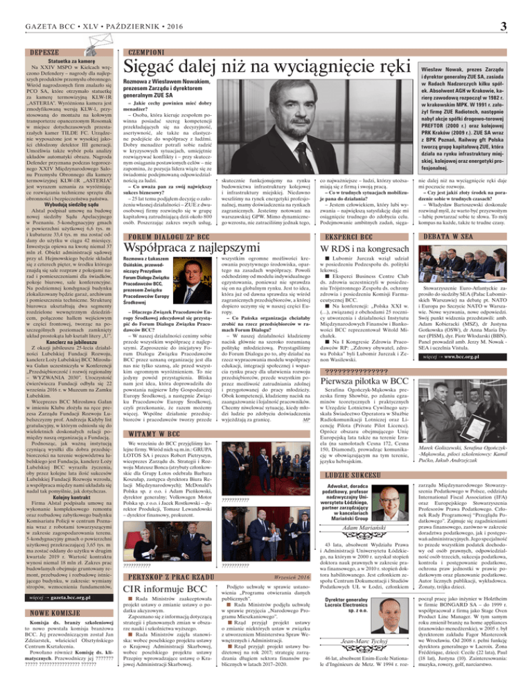 3 GAZETA BCC • XLV • PAŹDZIERNIK • 2016 DEPESZE Statuetka za kamerę Na XXIV MSPO w Kielcach wręczono Defendery – nagrody dla najlepszych produktów przemysłu obronnego. Wśród nagrodzonych firm znalazło się PCO SA, które otrzymało statuetkę za kamerę termowizyjną KLW-1R „ASTERIA”. Wyróżniona kamera jest zmodyfikowaną wersją KLW-1, przystosowaną do montażu na kołowym transporterze opancerzonym Rosomak w miejsce dotychczasowych przestarzałych kamer TILDE FC. Urządzenie wyposażone jest w wysokiej jakości chłodzony detektor III generacji. Umożliwia także wybór pola analizy układów automatyki obrazu. Nagroda Defender przyznana podczas tegorocznego XXIV Międzynarodowego Salonu Przemysłu Obronnego dla kamery termowizyjnej KLW-1R „ASTERIA” jest wyrazem uznania za wyróżniające rozwiązania techniczne sprzętu dla obronności i bezpieczeństwa państwa. Wybudują siedzibę sądu Alstal podpisał umowę na budowę nowej siedziby Sądu Apelacyjnego w Poznaniu. 5-kondygnacyjny gmach o powierzchni użytkowej 6,6 tys. m² i kubaturze 33,4 tys. m³ ma zostać oddany do użytku w ciągu 42 miesięcy. Inwestycja opiewa na kwotę niemal 37 mln zł. Obiekt administracji sądowej przy ul. Hejmowskiego będzie składał się z czterech pięter, w środku którego znajdą się sale rozpraw z pokojami narad i pomieszczeniami dla świadków, pokoje biurowe, sale konferencyjne. Na podziemnej kondygnacji budynku zlokalizowany będzie garaż, archiwum i pomieszczenia techniczne. Strukturę biurowca ukształtują dwa segmenty rozdzielone wewnętrznym dziedzińcem, połączone hallem wejściowym w części frontowej, tworząc na poszczególnych poziomach zamknięty układ prostokąta lub kształt litery „U”. Kanclerz na jubileuszu Z okazji jubileuszu 25-lecia działalności Lubelskiej Fundacji Rozwoju, kanclerz Loży Lubelskiej BCC Mirosława Gałan uczestniczyła w Konferencji „Przedsiębiorczość i rozwój regionalny – WYZWANIA 2030”. Uroczystość ćwierćwiecza Fundacji odbyła się 22 września 2016 r. w Muzeum na Zamku Lubelskim. Wiceprezes BCC Mirosława Gałan w imieniu Klubu złożyła na ręce prezesa Zarządu Fundacji Rozwoju Lubelszczyzny prof. Andrzeja Kidyby list gratulacyjny, w którym odniosła się do wieloletnich doskonałych relacji pomiędzy naszą organizacją a Fundacją. Podnosząc, jak ważną instytucją czyniącą wysiłki dla dobra przedsiębiorczości na terenie województwa lubelskiego jest Fundacja, kanclerz Loży Lubelskiej BCC wyraziła życzenia, oby przez kolejne lata ilość sukcesów Lubelskiej Fundacji Rozwoju wzrosła, a współpraca między nami układała się nadal tak pomyślnie, jak dotychczas. Kolejny kontrakt Firma Alstal podpisała umowę na wykonanie kompleksowego remontu oraz rozbudowę zabytkowego budynku Komisariatu Policji w centrum Poznania wraz z robotami towarzyszącymi w zakresie zagospodarowania terenu. 5-kondygnacyjny gmach o powierzchni użytkowej przekraczającej 3,65 tys. m² ma zostać oddany do użytku w drugim kwartale 2019 r. Wartość kontraktu wynosi niemal 18 mln zł. Zakres prac budowlanych obejmuje gruntowany remont, przebudowę i rozbudowę istniejącego budynku, w zakresie: wymiany stropów, wzmocnienia fundamentów, więcej Õ gazeta.bcc.org.pl NOWE KOMISJE Komisja ds. branży szkoleniowej to nowo powstała komisja branżowa BCC. Jej przewodniczącym został Jan Zdziarstek, właściciel Olsztyńskiego Centrum Kształcenia. Powołano również Komisję ds. klimatycznych. Przewodniczy jej ??????? ????? ???????????????? ?????? CZEMPIONI Sięgać dalej niż na wyciągnięcie ręki Rozmowa z Wiesławem Nowakiem, prezesem Zarządu i dyrektorem generalnym ZUE SA – Jakie cechy powinien mieć dobry menadżer? – Osoba, która kieruje zespołem powinna posiadać szereg kompetencji przekładających się na decyzyjność, asertywność, ale także na elastyczne podejście do współpracy z ludźmi. Dobry menadżer potrafi sobie radzić w kryzysowych sytuacjach, umiejętnie rozwiązywać konflikty i – przy skutecznym osiąganiu postawionych celów – nie zapomina, że pozycja lidera wiąże się ze świadomie podejmowaną odpowiedzialnością za ludzi. – Co uważa pan za swój największy sukces biznesowy? – 25 lat temu podjąłem decyzję o założeniu własnej działalności – ZUE z dwuosobowej firmy rozwinęło się w grupę kapitałową zatrudniającą dziś około 800 osób. Poszerzając zakres swych usług, skutecznie funkcjonujemy na rynku budownictwa infrastruktury kolejowej i infrastruktury miejskiej. Niedawno weszliśmy na rynek energetyki profesjonalnej, mamy doświadczenia na rynkach zagranicznych. Jesteśmy notowani na warszawskiej GPW. Mimo dynamicznego wzrostu, nie zatraciliśmy jednak tego, EKSPERCI BCC FORUM DIALOGU ZP BCC Współpraca z najlepszymi Rozmowa z Łukaszem Osińskim, przewodniczący Prezydium Forum Dialogu Związku Pracodawców BCC, prezesem Związku Pracodawców Europy Środkowej – Dlaczego Związek Pracodawców Europy Środkowej zdecydował się przystąpić do Forum Dialogu Związku Pracodawców BCC? – W naszej działalności cenimy sobie przede wszystkim współpracę z najlepszymi. Zaproszenie do inicjatywy Forum Dialogu Związku Pracodawców BCC przez uznaną organizację jest dla nas nie tylko szansą, ale przed wszystkim ogromnym wyróżnieniem. To nie jedyny powód przystąpienia. Bliska nam jest idea, która doprowadziła do powstania najpierw Izby Gospodarczej Europy Środkowej, a następnie Związku Pracodawców Europy Środkowej, czyli przekonanie, że razem możemy więcej. Wspólne działanie przedsiębiorców i pracodawców tworzy przede wszystkim ogromne możliwości kreowania pozytywnego środowiska, opartego na zasadach współpracy. Powoli odchodzimy od modelu indywidualnego egzystowania, ponieważ nie sprawdza się on na globalnym rynku. Jest to idea, która już od dawna sprawdza się wśród zagranicznych przedsiębiorców, a któ