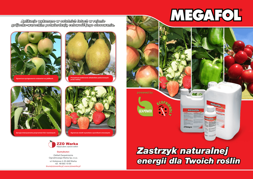 Aplikacje wykonane w ostatnich latach w rejonie grójecko-wareckim potwierdzają celowość jego stosowania. Ogranicza występowanie ordzawień na jabłkach. Przyspiesza pobieranie składników pokarmowych przez rośliny. Sprzyja intensywnemu przyrostowi liści rozetowych. Ogranicza skutki wywołane czynnikami stresowymi. Dystrybutor: Zakład Zaopatrzenia Ogrodniczego Warka Sp. z o.o. ul. Kolejowa 2, 05-660 Warka tel. 48 665 10 00 [email protected], www.zzowarka.pl Zastrzyk naturalnej energii dla Twoich roślin Zastrzyk naturalnej energii dla Twoich roślin Dolistny aktywator, poprawiający pobieranie składników pokarmowych i wspomagający regenerację roślin. Zawarte w Megafolu aminokwasy oddziałują również na przepuszczalność błony komórkowej, co przekłada się na zwiększenie ilości pobranych substancji nawozowych. Dzięki temu procesowi, stosując nawet niższe dawki produktów nawozowych, można uzyskać o wiele lepsze efekty nawożenia. Dodanie do stosowanych dolistnie nawozów lub środków ochrony roślin produktu aminokwasowego jest sposobem na znaczne zwiększenie ich przyswajalności, a przez to efektywności działania. Zawiera: • aminokwasy pochodzenia roślinnego • proteiny, witaminy, betainy • aktywatory wzrostu (auksyny, gibereliny cytokininy). Zapewnia: • szybki i zrównoważony wzrost • ochronę przed czynnikami stresowymi • stymulację pobierania substancji odżywczych Skład: Skład: Aminokwasy są składnikami budulcowymi tkanek roślinnych. Z tego powodu, nawet dostarczone w postaci aplikacji dolistnej, są szybko rozpoznawane i przyswajane przez rośliny. Ważne jest aby stosowane preparaty były pochodzenia roślinnego, ponieważ zawierają właściwe dla roślin proporcje aminokwasów, co zapewnia bezpośrednie ich pobieranie przez roślinny (w przeciwieństwie do aminokwasów pochodzenia zwierzęcego). Organizm roślinny „chce” pobrać cząsteczki aminokwasowe, ponieważ są mu one potrzebne do procesów rozwojowych oraz metabolicznych. Zarówno nadmiar jak i niedobór któregoś z aminokwasów może zaburzać te procesy. Oczywiście rośliny mogą również syntetyzować aminokwasy na własne potrzeby jednak potrzebują do tego dużo energii. Dlatego Megafol, który dostarcza uprawie odpowiednio skomponowany zestaw aminokwasów roślinnych, ma działanie stymulujące wzrost i rozwój. Zjawisko współdziałania aminokwasów z cząsteczkami w praktyce sadowniczej można wykorzystać dla przyśpieszenia pobierania składników pokarmowych, ale również do zwiększenie skuteczności działania środków ochrony roślin. www.zzowarka.pl %wagowych Azot ogólny N 2% Tlenek potasu K20 7% Zawartość substancji organicznej 40% Aminokwasy roślinne 28% Betainy, witaminy, proteiny, aktywatory wzrostu (auksyny, gibereliny, cytokininy) Dawkowanie: Stosować standardowo 2-3 l/ha co 10-15 dni w fazie intensywnego wzrostu zawiązków owoców. W czasie stresu dawkę można podnieść do 5l/ha. Preparat najlepiej jest zastosować przed spodziewanymi przymrozkami lub bezpośrednio po ich wystąpieniu, a także w wypadku uszkodzeń spowodowanych suszą lub gradobiciem. [email protected] Zawiera: aminokwasy pochodzenia roślinnego, proteiny, witaminy i betainy. Aplikacje wykonane w ostatnich latach w rejonie grójecko-wareckim potwierdzają celowość jego stosowania.