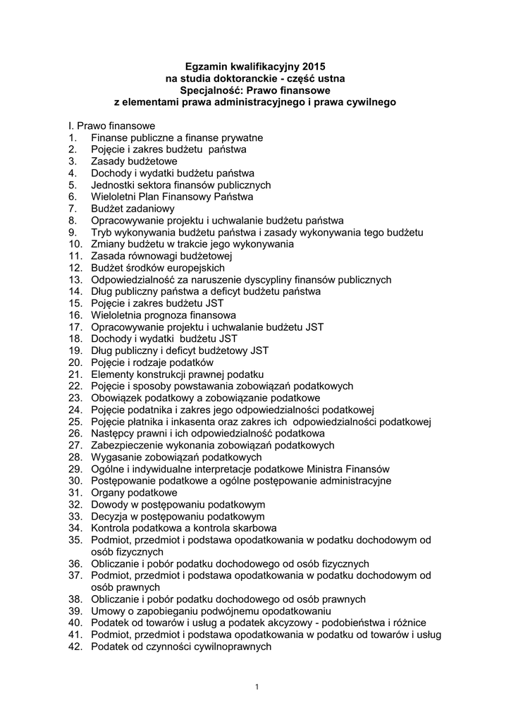 Egzamin kwalifikacyjny 2015 na studia doktoranckie - część ustna Specjalność: Prawo finansowe z elementami prawa administracyjnego i prawa cywilnego I. Prawo finansowe 1. Finanse publiczne a finanse prywatne 2. Pojęcie i zakres budżetu państwa 3. Zasady budżetowe 4. Dochody i wydatki budżetu państwa 5. Jednostki sektora finansów publicznych 6. Wieloletni Plan Finansowy Państwa 7. Budżet zadaniowy 8. Opracowywanie projektu i uchwalanie budżetu państwa 9. Tryb wykonywania budżetu państwa i zasady wykonywania tego budżetu 10. Zmiany budżetu w trakcie jego wykonywania 11. Zasada równowagi budżetowej 12. Budżet środków europejskich 13. Odpowiedzialność za naruszenie dyscypliny finansów publicznych 14. Dług publiczny państwa a deficyt budżetu państwa 15. Pojęcie i zakres budżetu JST 16. Wieloletnia prognoza finansowa 17. Opracowywanie projektu i uchwalanie budżetu JST 18. Dochody i wydatki budżetu JST 19. Dług publiczny i deficyt budżetowy JST 20. Pojęcie i rodzaje podatków 21. Elementy konstrukcji prawnej podatku 22. Pojęcie i sposoby powstawania zobowiązań podatkowych 23. Obowiązek podatkowy a zobowiązanie podatkowe 24. Pojęcie podatnika i zakres jego odpowiedzialności podatkowej 25. Pojęcie płatnika i inkasenta oraz zakres ich odpowiedzialności podatkowej 26. Następcy prawni i ich odpowiedzialność podatkowa 27. Zabezpieczenie wykonania zobowiązań podatkowych 28. Wygasanie zobowiązań podatkowych 29. Ogólne i indywidualne interpretacje podatkowe Ministra Finansów 30. Postępowanie podatkowe a ogólne postępowanie administracyjne 31. Organy podatkowe 32. Dowody w postępowaniu podatkowym 33. Decyzja w postępowaniu podatkowym 34. Kontrola podatkowa a kontrola skarbowa 35. Podmiot, przedmiot i podstawa opodatkowania w podatku dochodowym od osób fizycznych 36. Obliczanie i pobór podatku dochodowego od osób fizycznych 37. Podmiot, przedmiot i podstawa opodatkowania w podatku dochodowym od osób prawnych 38. Obliczanie i pobór podatku dochodowego od osób prawnych 39. Umowy o zapobieganiu podwójnemu opodatkowaniu 40. Podatek od towarów i usług a podatek akcyzowy - podobieństwa i różnice 41. Podmiot, przedmiot i podstawa opodatkowania w podatku od towarów i usług 42. Podatek od czynności cywilnoprawnych 1 43. 44. 45. 46. 47. 48. 49. 50. 51. 52. 53. 54. 55. 56. 57. 58. 59. 60. Ryczałt podatkowy Podatek od spadków i darowizn Podatek od nieruchomości Podatek rolny Opłaty lokalne Prawo celne w systemie prawa Cło jako danina publiczna Objęcie towaru procedurą celną Dług celny Organy celne i postępowanie w sprawach celnych System bankowy Miejsce i rola banku centralnego w systemie bankowym Narodowy Bank Polski Rada Polityki Pieniężnej System gwarantowania depozytów Komisja Nadzoru Finansowego Ochrona prawna klienta na rynku usług bankowych Przeciwdziałanie praniu brudnych pieniędzy i finansowaniu terroryzmu II. Prawo administracyjne 61. Administracyjne prawo wewnętrzne. 62. Sądy administracyjne. 63. Decyzja deklaratoryjna a zaświadczenie. 64. Przesłanki uchylenia przez sąd administracyjny decyzji administracyjnej. 65. Sposoby nawiązywania stosunków administracyjno-prawnych. 66. Kontrola instancyjna. 67. Rodzaje właściwości organów prowadzących postępowanie administracyjne. 68. Pojęcie decyzji. Struktura decyzji. 69. Prawo odwołania w postępowaniu administracyjnym. 70. Nieważność decyzji administracyjnej. 71. Rodzaje skarg do wojewódzkiego sądu administracyjnego i rodzaje wyroków. 72. Skarga kasacyjna w postępowaniu sądowoadministracyjnym. 73. Zasady i podmioty administracyjnego postępowania egzekucyjnego. 74. Środki zaskarżenia w postępowaniu egzekucyjnym. 75. Spółki Skarbu Państwa, ich ustrój i sytuacja prawna. III. Prawo cywilne 76. Stosunek cywilnoprawny 77. Konstrukcja i działanie osoby prawnej 78. Oświadczenie woli i jego interpretacja 79. Forma czynności prawnych - rodzaje i funkcje 80. Sankcje wadliwych czynności prawnych 81. Zasada swobody umów 82. Skarga pauliańska 83. Umowa zlecenia a umowa o dzieło 84. Konstrukcja praw zastawniczych 85. Odpowiedzialność za długi spadkowe 86. Pojęcia przedsiębiorcy, konsumenta i działalności gospodarczej 87. Status osobowych spółek handlowych 88. Spółka kapitałowa w organizacji 2 89. Aport w spółce kapitałowej 90. Kapitał zakładowy i jego funkcje 91. Udział w spółce z o.o. 92. Funkcje zarządu w spółce z o.o 93. Funkcje zgromadzenia wspólników w spółce kapitałowej 94. Charakter prawny spółki akcyjnej 95. Podział i łączenie spółek handlowych 96. Istota postępowania upadłościowego i naprawczego 97. Zdolności upadłościowa i jej wyłączenia 98. Pojęcie i rodzaje papierów wartościowych 99. Akcja i jej rodzaje 100. Umowa leasingu 3