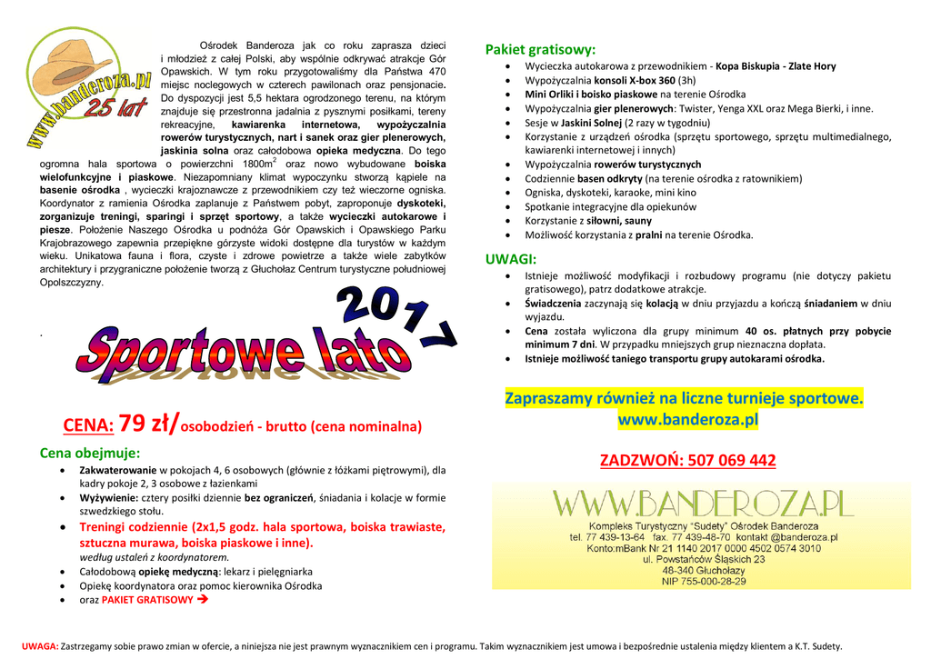 Ośrodek Banderoza jak co roku zaprasza dzieci i młodzież z całej Polski, aby wspólnie odkrywać atrakcje Gór Opawskich. W tym roku przygotowaliśmy dla Państwa 470 miejsc noclegowych w czterech pawilonach oraz pensjonacie. Do dyspozycji jest 5,5 hektara ogrodzonego terenu, na którym znajduje się przestronna jadalnia z pysznymi posiłkami, tereny rekreacyjne, kawiarenka internetowa, wypożyczalnia rowerów turystycznych, nart i sanek oraz gier plenerowych, jaskinia solna oraz całodobowa opieka medyczna. Do tego 2 ogromna hala sportowa o powierzchni 1800m oraz nowo wybudowane boiska wielofunkcyjne i piaskowe. Niezapomniany klimat wypoczynku stworzą kąpiele na basenie ośrodka , wycieczki krajoznawcze z przewodnikiem czy też wieczorne ogniska. Koordynator z ramienia Ośrodka zaplanuje z Państwem pobyt, zaproponuje dyskoteki, zorganizuje treningi, sparingi i sprzęt sportowy, a także wycieczki autokarowe i piesze. Położenie Naszego Ośrodka u podnóża Gór Opawskich i Opawskiego Parku Krajobrazowego zapewnia przepiękne górzyste widoki dostępne dla turystów w każdym wieku. Unikatowa fauna i flora, czyste i zdrowe powietrze a także wiele zabytków architektury i przygraniczne położenie tworzą z Głuchołaz Centrum turystyczne południowej Opolszczyzny. Pakiet gratisowy: UWAGI: . CENA: 79 zł/osobodzień - brutto (cena nominalna) Cena obejmuje: Zakwaterowanie w pokojach 4, 6 osobowych (głównie z łóżkami piętrowymi), dla kadry pokoje 2, 3 osobowe z łazienkami Wyżywienie: cztery posiłki dziennie bez ograniczeń, śniadania i kolacje w formie szwedzkiego stołu. Wycieczka autokarowa z przewodnikiem - Kopa Biskupia - Zlate Hory Wypożyczalnia konsoli X-box 360 (3h) Mini Orliki i boisko piaskowe na terenie Ośrodka Wypożyczalnia gier plenerowych: Twister, Yenga XXL oraz Mega Bierki, i inne. Sesje w Jaskini Solnej (2 razy w tygodniu) Korzystanie z urządzeń ośrodka (sprzętu sportowego, sprzętu multimedialnego, kawiarenki internetowej i innych) Wypożyczalnia rowerów turystycznych Codziennie basen odkryty (na terenie ośrodka z ratownikiem) Ogniska, dyskoteki, karaoke, mini kino Spotkanie integracyjne dla opiekunów Korzystanie z siłowni, sauny Możliwość korzystania z pralni na terenie Ośrodka. Istnieje możliwość modyfikacji i rozbudowy programu (nie dotyczy pakietu gratisowego), patrz dodatkowe atrakcje. Świadczenia zaczynają się kolacją w dniu przyjazdu a kończą śniadaniem w dniu wyjazdu. Cena została wyliczona dla grupy minimum 40 os. płatnych przy pobycie minimum 7 dni. W przypadku mniejszych grup nieznaczna dopłata. Istnieje możliwość taniego transportu grupy autokarami ośrodka. Zapraszamy również na liczne turnieje sportowe. www.banderoza.pl ZADZWOŃ: 507 069 442 Treningi codziennie (2x1,5 godz. hala sportowa, boiska trawiaste, sztuczna murawa, boiska piaskowe i inne). według ustaleń z koordynatorem. Całodobową opiekę medyczną: lekarz i pielęgniarka Opiekę koordynatora oraz pomoc kierownika Ośrodka oraz PAKIET GRATISOWY UWAGA: Zastrzegamy sobie prawo zmian w ofercie, a niniejsza nie jest prawnym wyznacznikiem cen i programu. Takim wyznacznikiem jest umowa i bezpośrednie ustalenia między klientem a K.T. Sudety. DODATKOWO MOŻEMY ZORGANIZOWAĆ: 1. Istnieje możliwość taniego TRANSPORTU autokarami Ośrodka. Możliwy tani odbiór z PKP w Gliwicach, Opolu i Wrocławiu. Transport może być łączony i jest odgórnie ustalany przez Ośrodek. 2. Wszelkie dokumenty potrzebne do zgłoszenia wyjazdu odpowiednim jednostkom zamieszczone są na naszej stronie www.banderoza.pl w zakładce do pobrania. 3. Doba w naszym Ośrodku rozpoczyna się kolacją w dniu przyjazdu a kończy śniadaniem w dniu wyjazdu, chyba że w umowie są ustalenia indywidualne. 4. Przy wycieczkach do Czech każdy uczestnik musi posiadać dokument uprawniający do przekroczenia granicy (dowód osobisty, paszport). Legitymacja szkolna nie jest takim dokumentem. W razie zainteresowania ofertą prosimy o kontakt: Jacek Laskowski - właściciel Ośrodka tel. 507 069 442 RECEPCJA tel. 77 439 13 64; 509 529 490 KOORDYNATORZY 507 069 436; 507 082 226 oraz na [email protected] www.banderoza.pl SPORT: SZTUCZNA MURAWA -- 400zł/1,5 godz. Sektor hala sportowa – 150 zł/1,5h Basen kryty – 16 zł/os. NARTY: Całodzienny KARNET Z TRANSFEREM NA STOK (Ski Příčná Zlaté Hory-Czechy) ~55zł/os (istnieje możliwość wyjazdu na inne stoki [cena ulegnie zmianie] - szczegóły 507 069 436) WYPOŻYCZALNIA NART (SkiPříčná Zlaté Hory) ~ 210zł/5 dni+6 gratis (szczegóły 507 069 436) Lodowisko - 3 zł/dziecko, 5 zł/dorosły, 4 zł/łyżwy ANIMACJE: Animacja gier i zabaw – 100 zł/grupa Tańce integracyjne – 100zł/grupa Płukanie złota z Górskim Gawędziarzem – 100 zł/grupa Warsztaty na bębnach afrykańskich „DJEMBE” – 160 zł/grupa (max 20 os.) Warsztaty drukarskie „JAK POWSTAJE KSIĄŻKA” – 220 zł/grupa (max 20 os.) Strzelanie z Łuku – 60 zł/grupa (max 25 os.) KINBALL – 140 zł/grupa (max 25 os.) Wypożyczalnia X-BOX – 50 zł / 3 godz EXTRIM: SEGWAY i SLALOM EXTREME – 17 zł/os. PAINTBALL – 35 zł/os. (100 kulek, mundur, marker) WYCIECZKI AUTOKAROWE: Kopa Biskupia – z przewodnikiem – 10 zł/os. SAM PRZEWODNIK – Kopa Biskupia – 250 zł/grupa Nysa – z przewodnikiem – 15 zł/os. Nysa – Przejażdżka wesołą ciuchcią z przewodnikiem – 27 zł/os. Nysa – Rejs stateczkiem "Gracja" po jeziorze Nyskim – 27 zł/os. SAM PRZEWODNIK – Nysa – 350 zł/grupa Jesenik – z przewodnikiem – 20 zł/os. Jeseník (Czechy) + Jaskinie na Pomezí – 25 zł/os. + bilety wstępu: 60 Kč/dzieci (9 zł), 110 Kč/dorośli (18 zł).* Zaginione miasto RESNAU – park rozrywki – 300zł/grupa + bilety wstępu 20 zł/os. JURAPARK KRASIEJÓW – 60 zł/os. Park Linowy (Czechy lub Polska) – 35 zł/os. Stadnina koni – 25 zł/os. WYCIECZKI PIESZE: Rajd na Górę Chrobrego – 150 zł/grupa Zwiedzanie Głuchołaz z przewodnikiem – 5 z