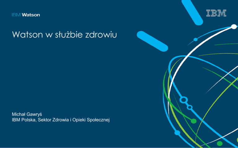 Watson w służbie zdrowiu Michał Gawryś IBM Polska, Sektor Zdrowia i Opieki Społecznej Watson rozpoczyna w IBM nową erę komputerów uczących się 1900 Tabulating Systems Era © 2015 International Business Machines Corporation 1950 2011 Programmable Systems Era Cognitive Systems Era 2 Wyzwania Opieki Zdrowotnej Nawał informacji Nawał pracy • Literatura Medyczna podwaja się co rok • Społeczeństwo się starzeje • 700.000 artykułów naukowych rocznie • Choroby przewlekłe i cywilizacyjne • Eksplozja danych (EDM, 3D, etc) • Brakuje lekarzy i pielęgniarek Powolny postęp Pacjenci chcą wiedzieć i współdecydować • Od uzyskania przekonywujących wyników badań do powszechnego wdrożenia nowych procedur mija 15 lat • Mniej niż połowa pacjentów jest zadowolona z informacji o przebiegu leczenie i swojego wpływu na nie © 2015 International Business Machines Corporation 3 IBM Watson - zastosowanie w medycynie język naturalny, włączając 1 Rozumie wytyczne dla lekarzy, publikacje medyczny i dane kliniczne pacjentów i ewaluuje hipotezy 2 Generuje dotyczące diagnozy i sposobu leczenia pacjenta na bazie dostępnych danych i uczy się na podstawie 3 Adoptuje interakcji z lekarzami oraz analizując efekty leczenia © 2015 International Business Machines Corporation Dr n. med. Eliot Siegel, zfotografowany z IBM's Watson na Uniwersytecie w Maryland, wierzy że superkomputer może w krótce zostać rutynowym narzędziem w diagnostyce radiologicznej uzupełniając systemy PACS, zaawansowaną wizualizacje i rozpoznawanie mowy. 4 Już działamy… Ongoing Training Partner Watson for Oncology, trained by Memorial Sloan Kettering Pracuje klinicznie przy diagnozowaniu raka płuc i piersi i odbytu Bumrungrad International Hospital 5 letni umowa na Watson dla Onkologii MD Anderson Introduced proprietary solution with Watson for clinical use for Leukemia and Molecular Targeted Therapies Baylor College of Medicine Published results of use with Watson Discovery Advisor – identified 7 targets for P53 activation within weeks Watson Genomics Advisor Secured 13 Cancer and Academic medical centers for beta testing Department of Veterans Affairs Selected Watson to analyze EMRs in a demo project © 2015 International Business Machines Corporation Mayo Clinic Completed testing with Clinical Trial Matching for lung, breast, colon and rectal cancer Mayo Clinic Selected Watson to analyze EMRs for Clinical Efficiency and Effectiveness Program 5 Watson - dla onkologii nauczony przez Memorial Sloan Kettering Zadanie: • Ocena najlepszej ścieżki terapeutycznej dla pacjenta na podstawie analizy porównawczej i zaleceń klinicznych Watson asystuje: − − − − Porównuje pacjenta z tysiącami podobnych przypadków Analizuje literaturę medyczną Uczy się na podstawie interakcji z lekarzem Trzy rodzaje raka (piersi, płuc, odbytu) © 2015 International Business Machines Corporation 6 Watson - doradca dla badań Problem: • Badacze są skazani na powolne i żmudne metody Watson asystuje: Wyszukuje powiązania pomiędzy faktami, Które przyspieszają: • Zrozumienia istoty choroby • Poszukiwanie lekarstw • Ocenę toksyczności • Konstrukcję testów • Porównawczą analizę skuteczności Dane zewnętrzne Dane chemiczne 1TB danych genomy 20,000+ genów ponad 40 M dokumentów literatura 50+ książek ponad 100M powiązań Bazy wiedzy 23M+ wpisów Czasopisma 100+ woluminów lekarstwa Patenty © 2015 International Business Machines Corporation 12M+ Watson 11,000+ 16M+ 7 Watson - dobór badań klinicznych Problem: • mniej niż 10% badań klinicznych kończy się na czas • 30% ośrodków zaangażowanych w badania kliniczne nie wynajduje ani jednego pacjenta Watson asystuje: • Wykorzystuje dane pacjenta poszukując wszystkich mających zastosowanie badań klinicznych, które mogłyby pomóc w badaniach i w leczeniu Dwa zastosowania: • Dla punktu obsługi chorego: asysta przy analizie adekwatności danego pacjenta do zestawu dostępnych badań • Dla firm farmaceutycznych: identyfikuje grupy pacjentów przy rekrutacji do badań klinicznych © 2015 International Business Machines Corporation 8 Dziękuję!