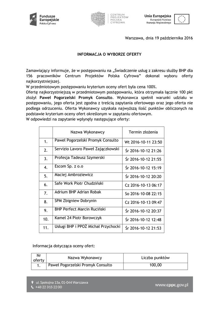 Warszawa, dnia 19 października 2016 INFORMACJA O WYBORZE OFERTY Zamawiający informuje, że w postępowaniu na „Świadczenie usług z zakresu służby BHP dla 156 pracowników Centrum Projektów Polska Cyfrowa” dokonał wyboru oferty najkorzystniejszej. W przedmiotowym postępowaniu kryterium oceny ofert była cena 100%. Ofertę najkorzystniejszą w przedmiotowym postępowaniu, która otrzymała łącznie 100 pkt złożył Paweł Pogorzelski Promyk Consulto. Wykonawca spełnił warunki udziału w postępowaniu, jego oferta jest zgodna z treścią zapytania ofertowego oraz jego oferta nie podlega odrzuceniu. Oferta Wykonawcy uzyskała najwyższą ilość punktów obliczonych na podstawie kryterium oceny ofert określonym w zapytaniu ofertowym. W odpowiedzi na zapytanie wpłynęły następujące oferty: Nazwa Wykonawcy Termin złożenia 1. Paweł Pogorzelski Promyk Consulto Wt 2016-10-11 23:50 2. Servizio Lavoro Paweł Zajączkowski Śr 2016-10-12 21:26 3. Profesja Tadeusz Szymerski Śr 2016-10-12 21:55 4. Escom Sp. z o.o Śr 2016-10-12 15:19 5. Maciej Ambroziewicz Śr 2016-10-12 20:20 6. Safe Work Piotr Chudziński Cz 2016-10-13 06:17 7. Adrium BHP Adrian Robak So 2016-10-08 22:15 8. SPM Zbigniew Dobrynin Cz 2016-10-13 09:47 9. BHP Perfect Marcin Ruciński Śr 2016-10-12 20:37 10. Kamel 24 Piotr Borowczyk Śr 2016-10-12 12:48 11. Usługi BHP i PPOŻ Michał Przychocki Śr 2016-10-12 21:53 Informacja dotycząca oceny ofert: Nr Nazwa Wykonawcy oferty Paweł Pogorzelski Promyk Consulto 1. Liczba punktów 100,00 2. Servizio Lavoro Paweł Zajączkowski 0 3. Profesja Tadeusz Szymerski 0 4. Escom Sp. z o.o 5. Maciej Ambroziewicz 6. Safe Work Piotr Chudziński 49,97 7. Adrium BHP Adrian Robak 0 8. SPM Zbigniew Dobrynin 0 9. BHP Perfect Marcin Ruciński 10. Kamel 24 Piotr Borowczyk 0 11. Usługi BHP i PPOŻ Michał Przychocki 0 52,18 0 38,21 2