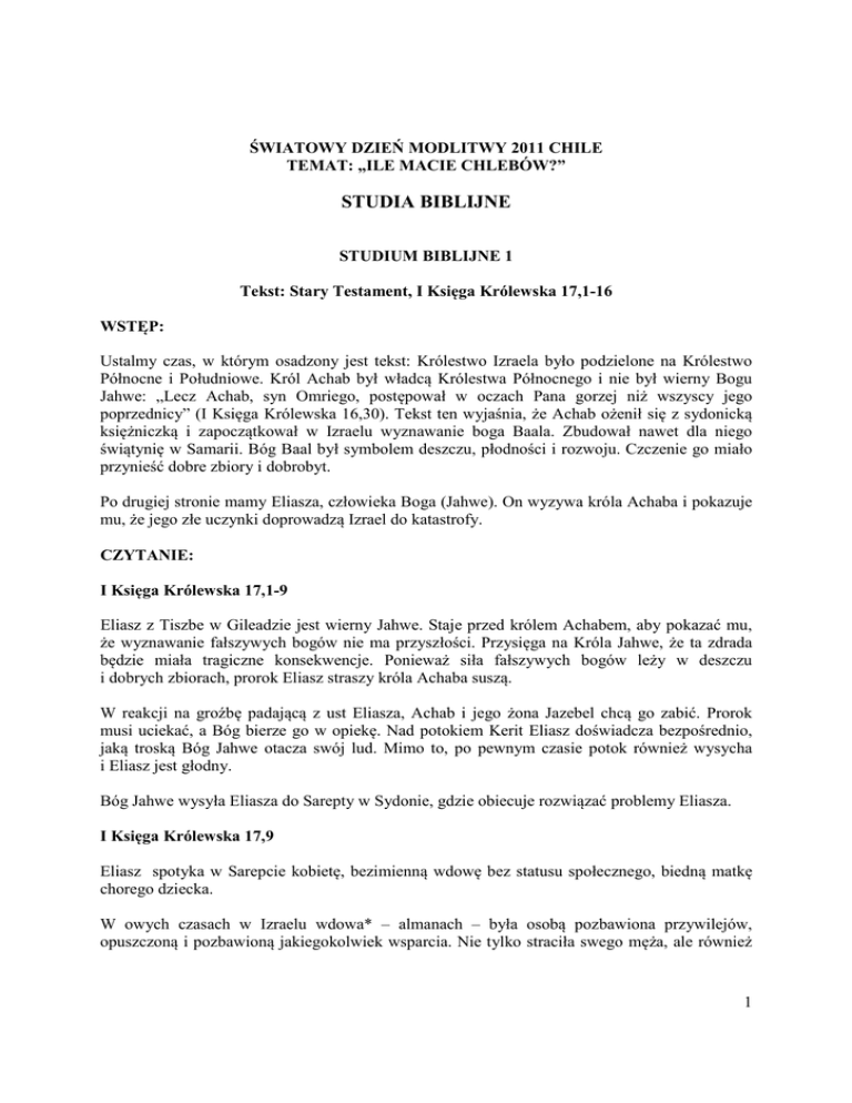 ŚWIATOWY DZIEŃ MODLITWY 2011 CHILE TEMAT: „ILE MACIE CHLEBÓW?” STUDIA BIBLIJNE STUDIUM BIBLIJNE 1 Tekst: Stary Testament, I Księga Królewska 17,1-16 WSTĘP: Ustalmy czas, w którym osadzony jest tekst: Królestwo Izraela było podzielone na Królestwo Północne i Południowe. Król Achab był władcą Królestwa Północnego i nie był wierny Bogu Jahwe: „Lecz Achab, syn Omriego, postępował w oczach Pana gorzej niż wszyscy jego poprzednicy” (I Księga Królewska 16,30). Tekst ten wyjaśnia, że Achab ożenił się z sydonicką księżniczką i zapoczątkował w Izraelu wyznawanie boga Baala. Zbudował nawet dla niego świątynię w Samarii. Bóg Baal był symbolem deszczu, płodności i rozwoju. Czczenie go miało przynieść dobre zbiory i dobrobyt. Po drugiej stronie mamy Eliasza, człowieka Boga (Jahwe). On wyzywa króla Achaba i pokazuje mu, że jego złe uczynki doprowadzą Izrael do katastrofy. CZYTANIE: I Księga Królewska 17,1-9 Eliasz z Tiszbe w Gileadzie jest wierny Jahwe. Staje przed królem Achabem, aby pokazać mu, że wyznawanie fałszywych bogów nie ma przyszłości. Przysięga na Króla Jahwe, że ta zdrada będzie miała tragiczne konsekwencje. Ponieważ siła fałszywych bogów leży w deszczu i dobrych zbiorach, prorok Eliasz straszy króla Achaba suszą. W reakcji na groźbę padającą z ust Eliasza, Achab i jego żona Jazebel chcą go zabić. Prorok musi uciekać, a Bóg bierze go w opiekę. Nad potokiem Kerit Eliasz doświadcza bezpośrednio, jaką troską Bóg Jahwe otacza swój lud. Mimo to, po pewnym czasie potok również wysycha i Eliasz jest głodny. Bóg Jahwe wysyła Eliasza do Sarepty w Sydonie, gdzie obiecuje rozwiązać problemy Eliasza. I Księga Królewska 17,9 Eliasz spotyka w Sarepcie kobietę, bezimienną wdowę bez statusu społecznego, biedną matkę chorego dziecka. W owych czasach w Izraelu wdowa* – almanach – była osobą pozbawiona przywilejów, opuszczoną i pozbawioną jakiegokolwiek wsparcia. Nie tylko straciła swego męża, ale również 1 swój status społeczny i bezpieczeństwo finansowe. Jej jedynym wyjściem w owej sytuacji była akceptacja i wsparcie przez rodzinę męża lub jej własne dzieci. Wdowa z Sarepty mieszka sama z chorym synem. Jest opuszczona i zdesperowana: ma zapasy jedzenia zaledwie na jeden dzień. * Łukasz 4,25-26 I Księga Królewska 17,10-12 Te wersy dotyczą braku i zobowiązania. Wdowa przyjmuje swój los: wie dokładnie, jak mało posiada i na jak długo to starczy. Jest gotowa przygotować ostani posłek dla siebie i swojego syna i poddać się nieuniknionej śmierci, na co wskazują jej słowa „... a gdy to zjemy, to chyba umrzemy”. Jest już wyczerpana walką o przetrwanie. Z powodu suszy nie ma możliwości siania, uprawiania ziemi i zbierania plonów. Nie widzi dla siebie i swojego syna innej alternatywy. W tym dramatycznym momencie zbiera drwa na rozpalenie ogniska. Pojawia się Eliasz, przybysz z obcego kraju. Prosi o wodę, w czasie suszy cenny dar. Mimo to, wdowa jest gotowa przynieść wodę, aby się z nim podzielić. Do tej pory historia wydaje się zrozumiała, ale potem następuje odważna prośba, szczególnie, gdy czytamy ją wczuwając się w rolę kobiety. Tekst brzmi „A gdy ona szła, aby nabrać, zawołał jeszcze za nią: Przynieś mi też, proszę, kawałek chleba”. Jahwe powiedział Eliaszowi, aby odnalazł kobietę. Jednak kobieta była zaskoczona, że on prosił o chleb. Czyż nie było oczywiste, że ona nic nie posiada? Czyż on tego nie wie? I Księga Królewska 17,12 Oczywistym jest, że pierwszą reakcją kobiety było wyjaśnienie swojej sytuacji. Mówi mu dokładnie, co ma. Ona wzywa imię Boga Eliasza. Wzywa Jahwe na świadka swej tragicznej sytuacji, mówiąc: „Jako żyje Pan, Bóg twój, że nie mam nic upieczonego”. I Księga Królewska 17,13 Mimo to Eliasz powtarza swą prośbę. Mówi, aby się nie lękała i robiła to, co miała zaplanowane, ale przede wszystkim powinna jemu zaufać i podać mu mały kawałek chleba. Eliasz daje jej obietnicę. Jego Bóg Jahwe, Bóg Izraela, zaopiekuje się nią i nie zabraknie jej oleju ani chleba do końca suszy. I Księga Królewska 17,15-16 Wdowa z Sarepty ufa mu, otwiera przed przybyszem swoje serce i czuje, że jego słowa i obietnice są prawdziwe. Otwiera swoje serce i dzieli się tą drobiną, jaką ma, przygotowuje posiłek, częstuje proroka, człowieka jej obcego, i staje się cud: od tej chwili ma dostatek jedzenia dla siebie i syna na długi czas. Ufając obietnicy proroka, będąc pod wrażeniem jego słów o Bogu Izraela, daje, dzieli się, oddaje resztki tego, co ma i znajduje w tym obfitość, satysfakcję i dostatek. 2 INTERPRETACJA: Boży prorok mieszka w domu wdowy Bóg pokazuje się w szczegółach: Wybiera kobietę, biedną wdowę, pozbawioną środków do życia, aby go poznano poza Izraelem. Jest wzruszony desperacją tej matki i nie pozostawia jej bez pomocy. Nawet będąc bezimienną kobietą otwarcie zabiera głos. Mimo swej trudnej sytuacji mówi bezpośrednio o tym, czego jej w domu brakuje, czym zmusza proroka do działania. Na podstawie obietnicy proroka kobieta również działa. Wierząc, że miłość Boga przyniesie jakieś niespodziewane rozwiązanie w jej trudnej sytuacji, otwiera swe serce, robi ciasto, kładzie potrzeby innych obok swoich i swojego syna. Najpierw przygotowuje chleb dla Eliasza. Z ostatniej porcji jaką ma, daje mu wodę i chleb. Bóg jest obecny w darze tej kobiety. Ona wzywa nas do wspólnego stołu, aby dzielić się chlebem, swoją historią i swoim losem. Ufa, że wydarzy się coś nowego. Bóg zajmuje miejsce między dwiema kobietami. Historia pochodząca ze Starego Testamentu jest pełna kontrastujących obrazów: śmierć – życie opuszczenie – obecność Boga głód – sytość samotność – towarzystwo cisza – słowo Boże O ile w tekście biblijnym wybranym do nabożeństwa nie ma wzmianki o Izebel, o tyle występuje ona w I Ks