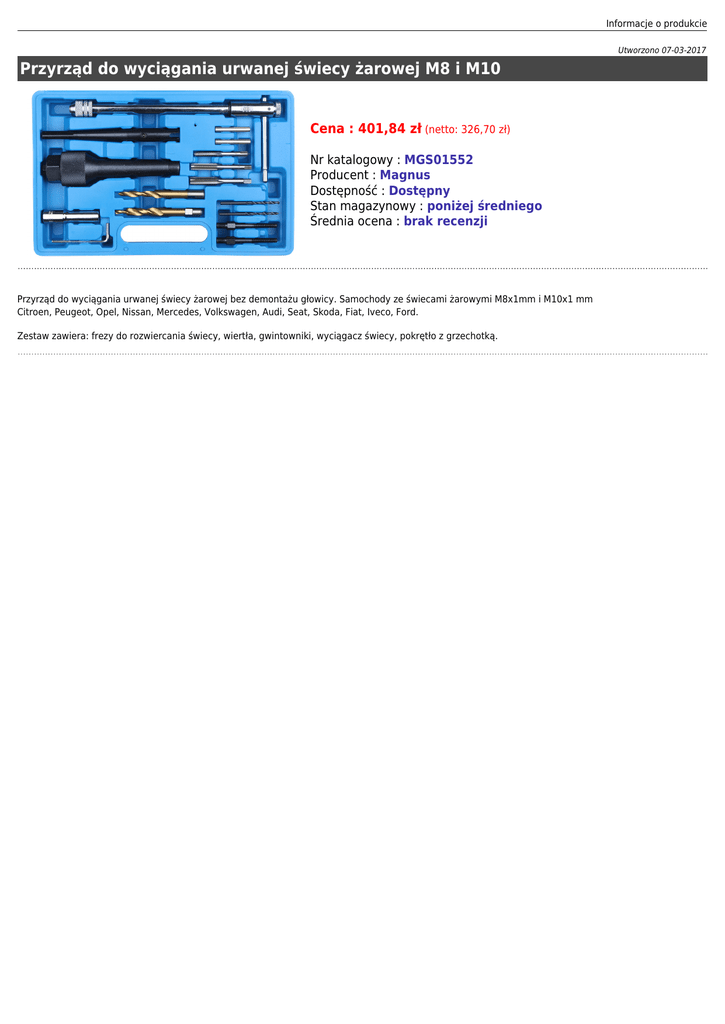 Informacje o produkcie Utworzono 07-03-2017 Przyrząd do wyciągania urwanej świecy żarowej M8 i M10 Cena : 401,84 zł (netto: 326,70 zł) Nr katalogowy : MGS01552 Producent : Magnus Dostępność : Dostępny Stan magazynowy : poniżej średniego Średnia ocena : brak recenzji Przyrząd do wyciągania urwanej świecy żarowej bez demontażu głowicy. Samochody ze świecami żarowymi M8x1mm i M10x1 mm Citroen, Peugeot, Opel, Nissan, Mercedes, Volkswagen, Audi, Seat, Skoda, Fiat, Iveco, Ford. Zestaw zawiera: frezy do rozwiercania świecy, wiertła, gwintowniki, wyciągacz świecy, pokrętło z grzechotką.